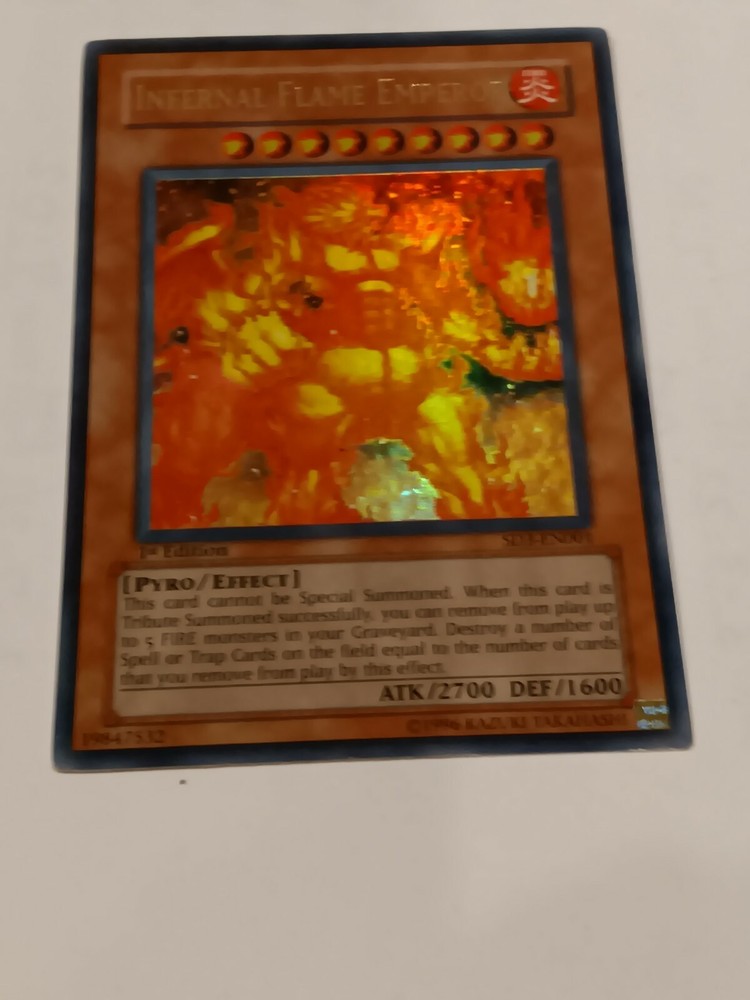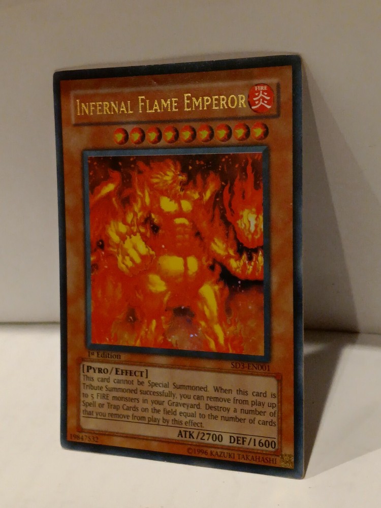 Infernal Flame Emperor - SD3-EN001 - Ultra Rare 1st Edition Structure Deck:. Infernal Flame Emperor - SD3-EN001 - Ultra Rare 1st Edition is a Yugioh Promo Card (no edition) card from the Structure Deck: Blaze of Destruction 1st Edition Singles Yugioh set. This is an Ultra Rare. Yugioh began back in the mid 90's as a weekly short in Shonen Jump by 1999 the TCG game had launched in Japan. Yugioh has gone on to become one of the top card games in the world and has now surpassed 20 years of competitive play worldwide.