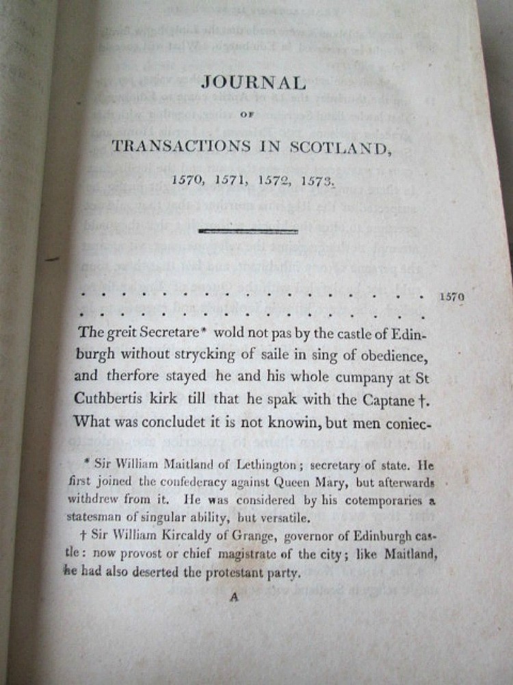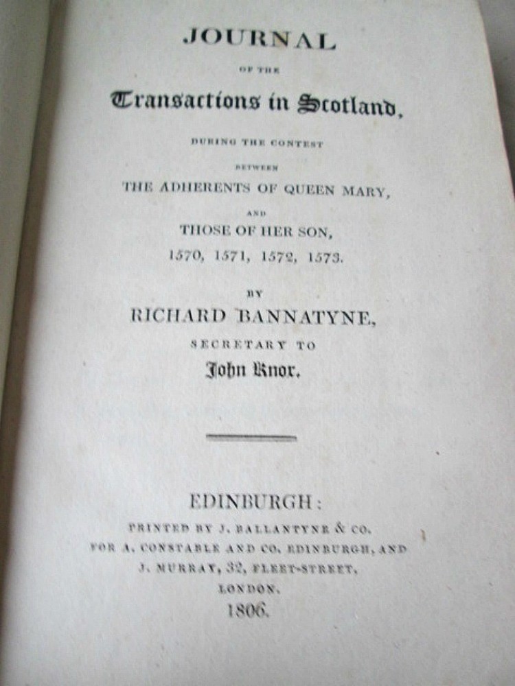a530. Journal of The Transactions in Scotland During the Contest Between Queen Mary and Her Son in the years, 1570-73, by Richard Bannatyne, Secretary to John Knox, 1806. Pub. A. Constable, Edinburgh, 1806. First Edition. Octavo, polished calf, ribbed-gilded spine, 540 pages and 2 pages of ads. Old private bookplate in front. Very Good+ condition. Do not hesitate to e-mail with any questions. As Always, Satisfaction Guaranteed! PAYMENT: PayPal, but I am open to other ideas! I expect to receive payment within 10 days, unless we have made other arrangements. Books will be sent via USPS Media mail. If you prefer Priority mail, I will be glad to make the adjustment. I'm glad to combine multiple purchases in order to minimize shipping costs. I WILL SHIP INTERNATIONALLY, and I try to be as economical as possible with the shipping costs. RETURN POLICY: Satisfaction Guaranteed! Track Page Views With Auctiva's FREE Counter