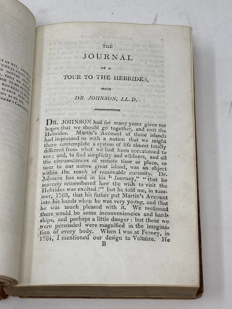 THE JOURNAL OF A TOUR TO THE HEBRIDES WITH SAMUEL JOHNSON, LL.D.; Containing Some Poetical Pieces by Dr. Johnson, relative to the Tour, and never before published; A Series of his Conversation, Literary Anecdotes, and Opinions of Men and Books: with an Authentick Account of The Distresses and Escape of the Grandson of King James II, in the Year 1746 Author: Boswell, James Title: THE JOURNAL OF A TOUR TO THE HEBRIDES WITH SAMUEL JOHNSON, LL.D.; Containing Some Poetical Pieces by Dr. Johnson, relative to the Tour, and never before published; A Series of his Conversation, Literary Anecdotes, and Opinions of Men and Books: with an Authentick Account of The Distresses and Escape of the Grandson of King James II, in the Year 1746 Publication: London: T.Cadell and W. Davies, 1812 Edition: Fifth Edition, Revised and Corrected Description: Leather_bound. Small octavo [6 1/2 x 4 inches]. Fifth ediiton, revised and corrected. 454 pages. Frontis engraving of Boswell. Full, diced leather binding, single ruled in gilt, with five raised bands,Front board detached but present, spine and corners chafed, edgewear. Marbled edges. Interior clean. Good. Seller ID: 78920 Aardvark Rare Books Eugene, OR We work hard to make your Bookbuying Experience safe, easy and fun. Aardvark Books is a proud member of the ABAA (Antiquarian Booksellers Association of America) and IOBA, Independent Online Booksellers Association. Ezra is also an accredited and Qualified Appraiser of Books and Manuscripts, with a designation from the ASA (American Society of Appraisers), with considerable Archive experience as well. Shipping All books shipped to US destinations are sent via the US Postal Service. Faster shipping is available, please ask before paying. We will combine shipping on items purchased at the same time in order to help reduce costs. International shipping is also available. Please inquire for a shipping quote before ordering. This listing was created by Bibliopolis.