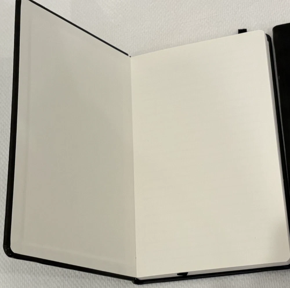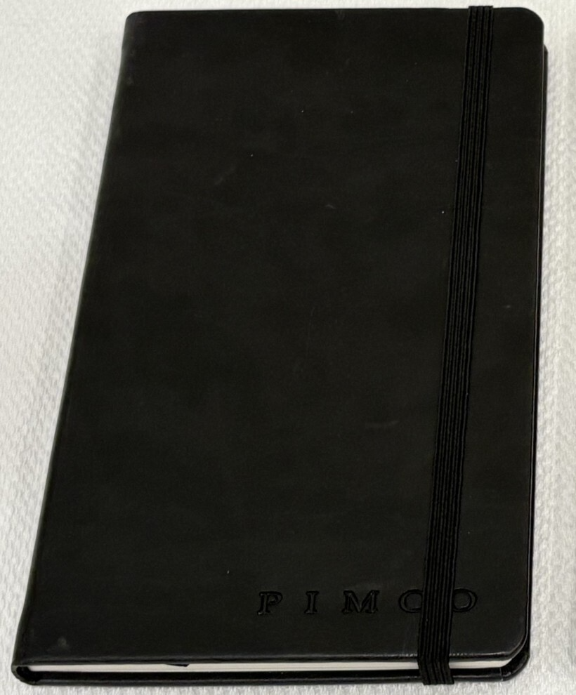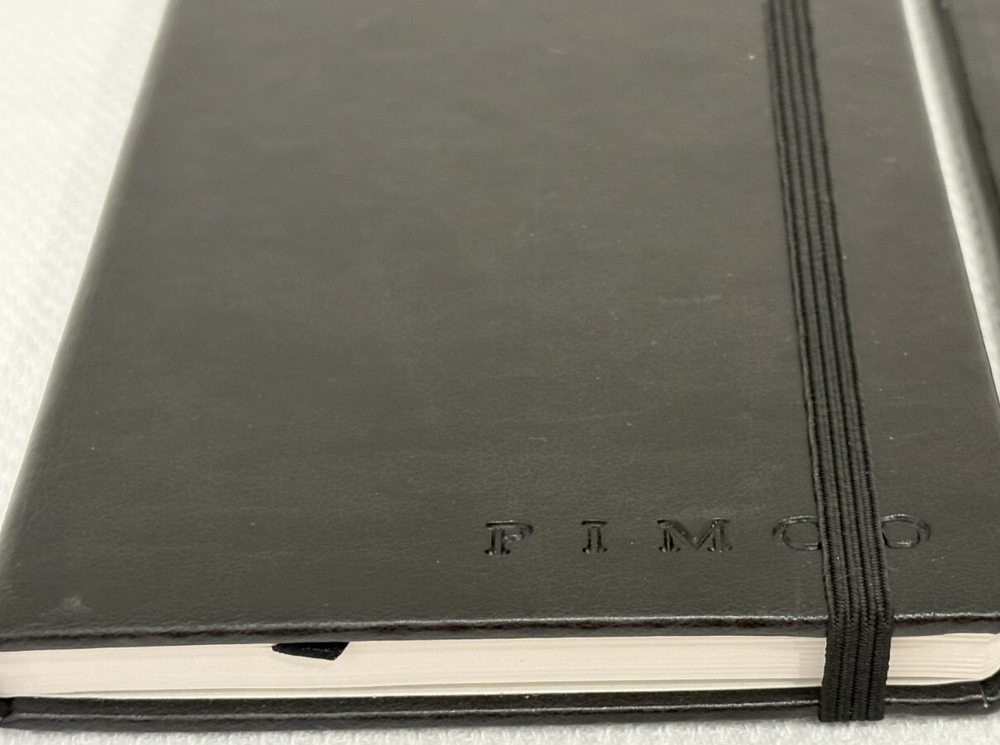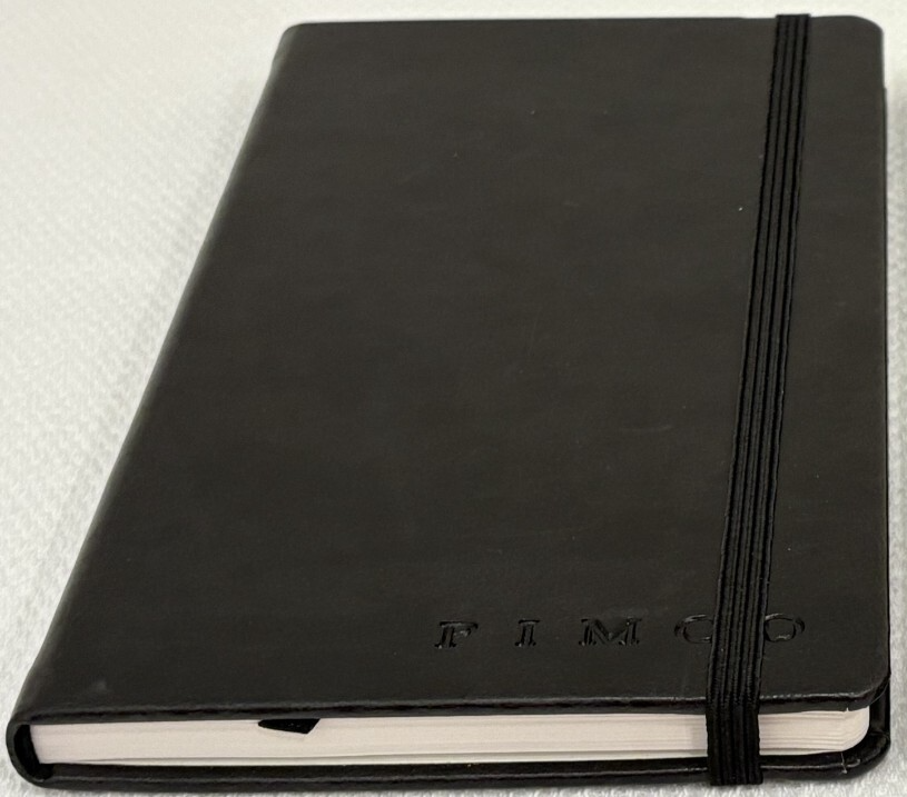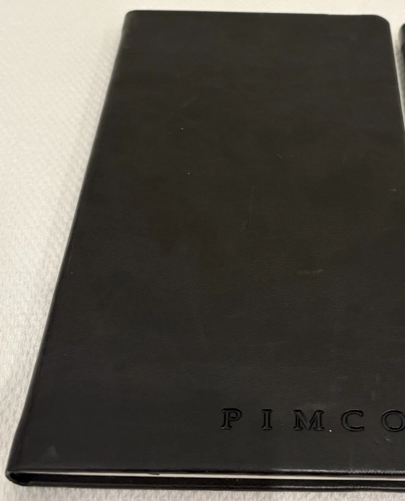One Journal Books PIMCO Logo Black Lined Bound Notebook with Ribbon Page Holder and Elastic Band Closure. Approximate Measurements: Notebooks 8.5" x 5", Sheets 8.25" x 4.75", with faux leather cover. The notebook has writing on the first line of the first page only. Cover has imperfections and indentations from elastic band due to long term storage - See Photos for condition. From a smoke and pet free home. Shipped via USPS Ground Advantage.