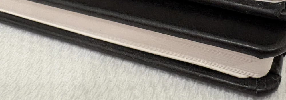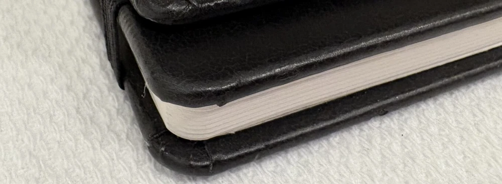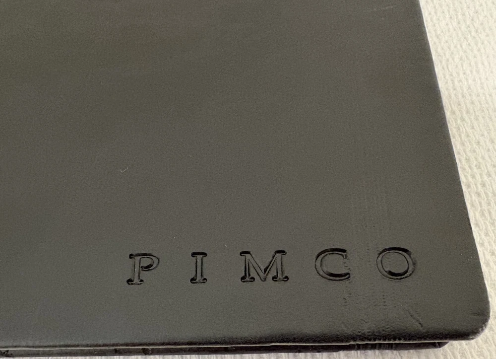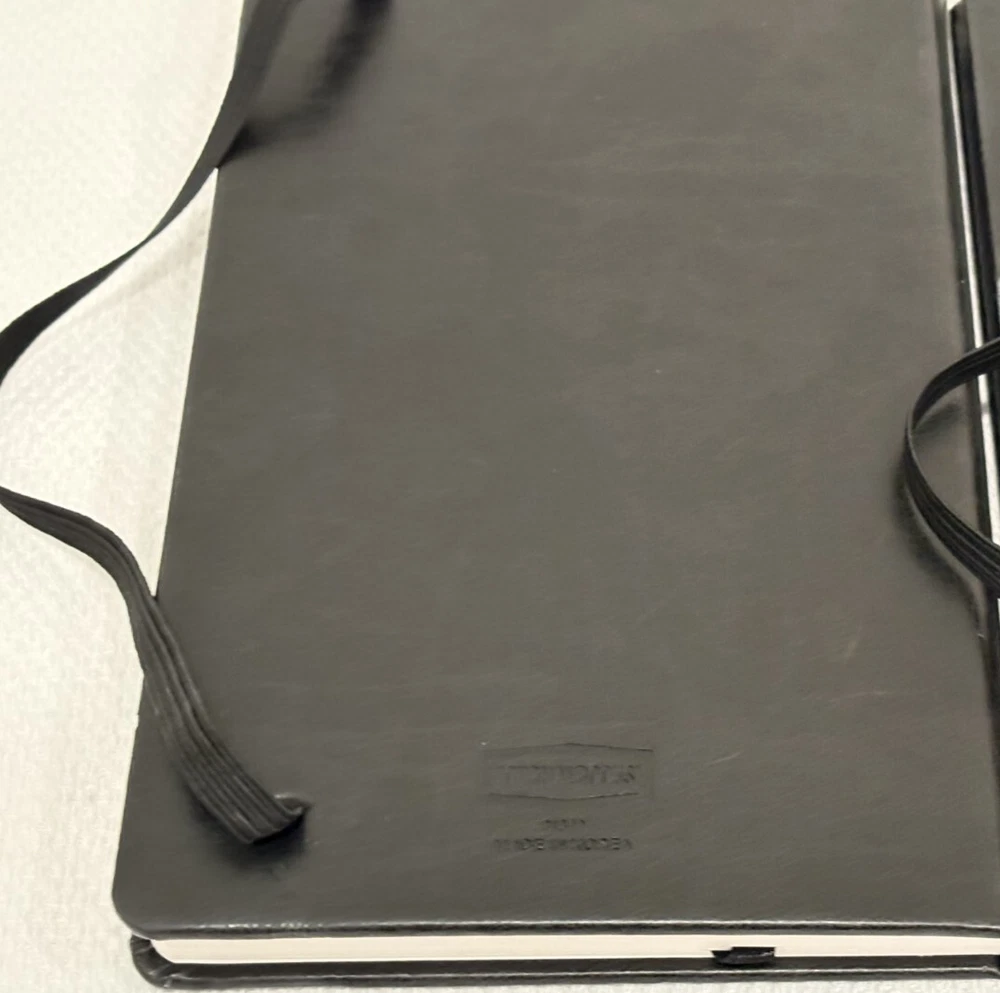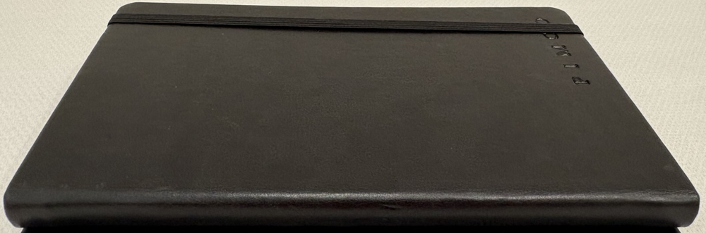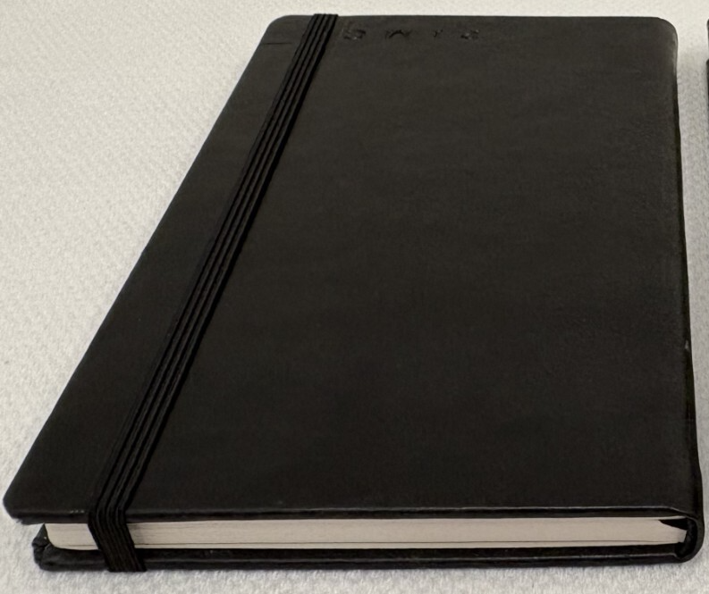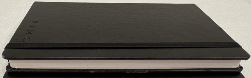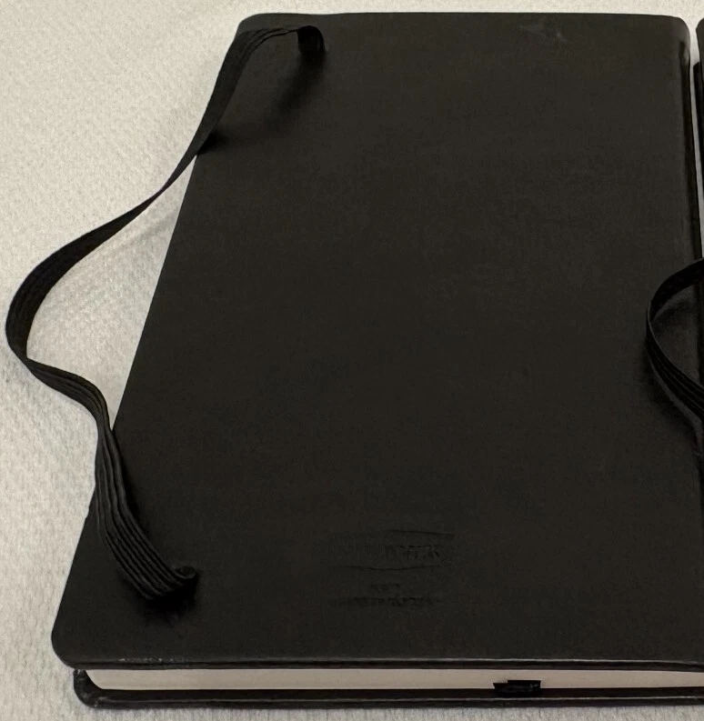 One Journal Books PIMCO Logo Black Lined Bound Notebook with Ribbon Page Holder and Elastic Band Closure. Approximate Measurements: Notebooks 8.5" x 5", Sheets 8.25" x 4.75", with faux leather cover. The notebook has writing on the first line of the first page only. Cover has imperfections and indentations from elastic band due to long term storage - See Photos for condition. From a smoke and pet free home. Shipped via USPS Ground Advantage.