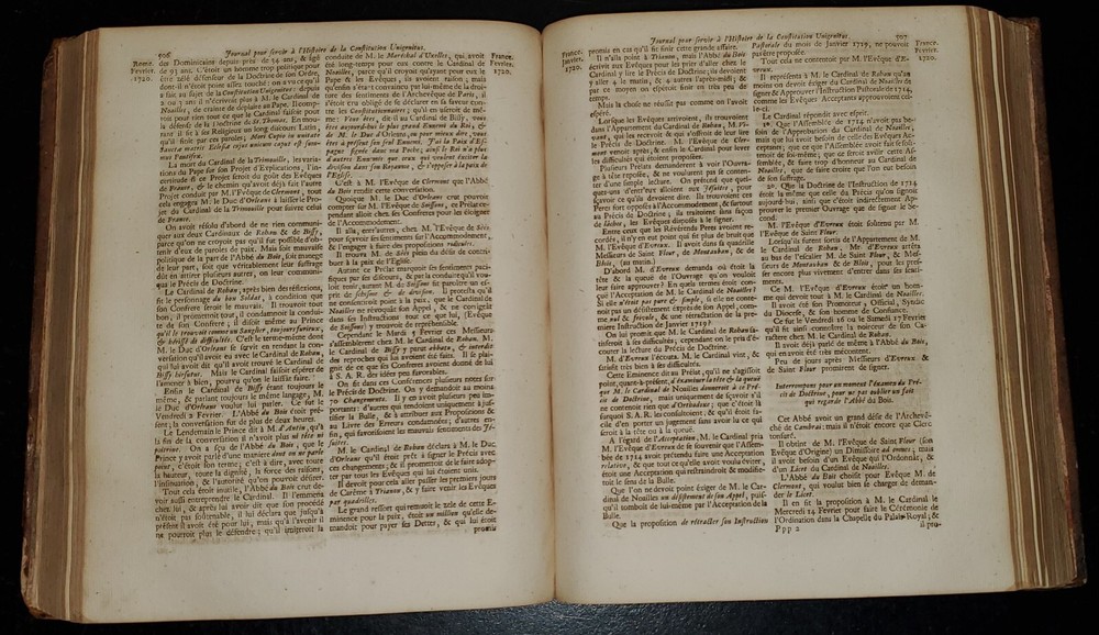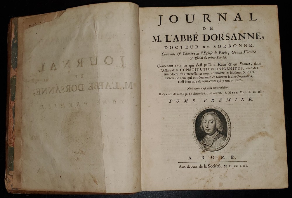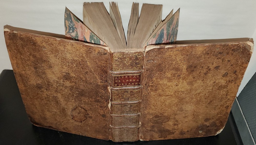 Journal De M. L'Abbe Dorsanne, Docteur De Sorbonne, Chanoine et Chantre de L'Eglise de Paris, Grand Vicaire et Official du Meme Diocese. Contenant Tout Ce Qui S'Est Passe A Rome et en France, dans L'Affaire de la Constitution Unigenitus, Avec Des Anecdotes Tres-Interessiantes Pour Connoitre les Intrigues et le Caractere de Ceux Qui Ont Demande et Foutenu la Dite Constitution, Aussi-bien Que de Tous Ceux Qui y Ont Eu Part, 2 Volumes Bound in 1. 2 Volumes bound in 1. Full leather boards with raised bands and gilt decorations along spine and board edges. Paste down and free end papers are marbled. Boards are worn and scuffed. Edges are badly scuffed and chipped. Corners are curling, and the leather is completely worn away from corners. Top and bottom panel of spines are chipped and detaching at front board. Boards are still firmly attached. Some book-worming affects bottom panel of spine. Bands are rubbed so that binding below shows. Light to moderate foxing throughout. Text is in double columns. [2], xvi, 339; [2], 504 pages.