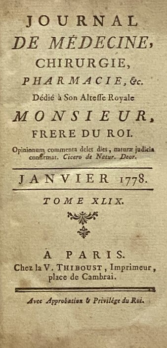 Yesterday's Muse, Inc. presents ... Journal De Medecine, Chirurgie, Pharmacie, &c., Janvier-Juin, 1778, Tome XLIX [FRENCH TEXT] Author: [No Author] Publisher: Chez Vincent Release Date: 1778 Seller Category: -- Qty Available: 1 Condition: Used: Very Good Sku: 2345308 Notes: Loss to spine head and to spine base, boards rubbed. 1778 Full-Leather. 576 pp. Full-leather. French text. Six monthly issues in one volume (January-June, 1778). 18th century French journal of medicine. Don't forget to check out other great deals in our eBay Store!!