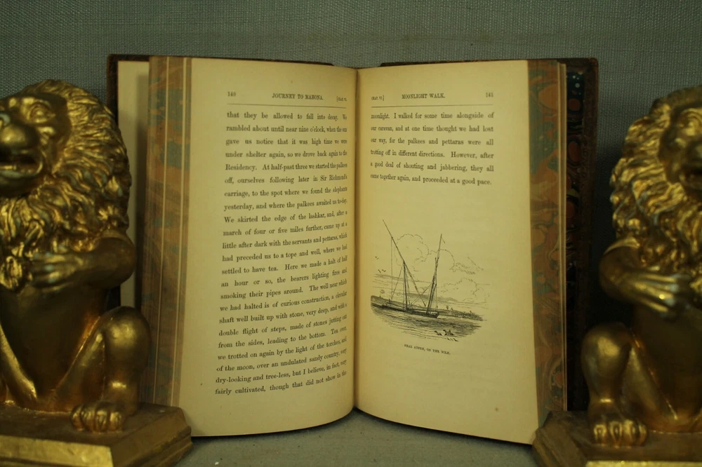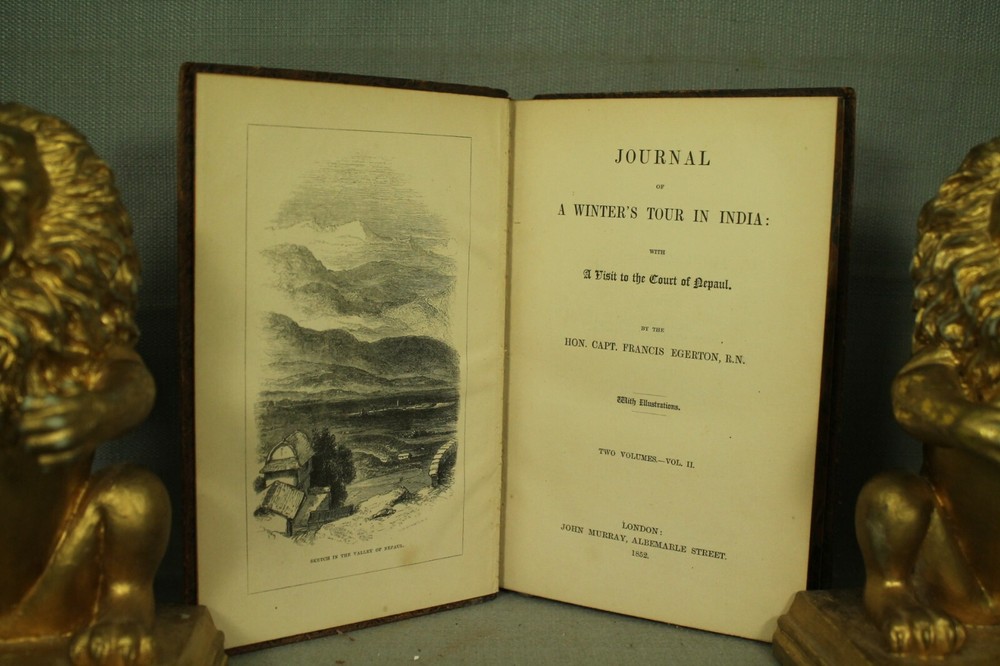 Journal of a Winter's Tour in India with a Visit to the Court of Nepaul ( Nepal) by the Hon. Capt. Francis Egerton, R.N. in two volumes this is vol. II ONLY antique old leather book published by John Murray ,Albemarle street, London. 1852 book measures 7 1/2" by 5" brown leather cover good with some wear, rubbing, scuffing, edge wear, spine edges rubbed, about a 2" split at front bottom on spine. embossed, gold decoration on spine. marbled page edges. front inside hinge cracked between frontispiece and title page. 290 pages plus fold out map in back. pages overall very good /clean with yellowing/age toning. great reading, reference, gift, share with a friend. decorating, book would look great on your bookshelf ! home/office/library shelf.. no International returns for any reason. Please look at the photos visit my Eb ay store bunc h of old Stuff for lots of great books and other stuff . Check out my other items location. upstairs hallway. marketplace check