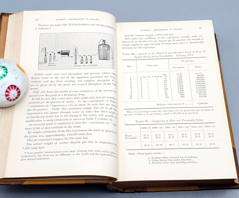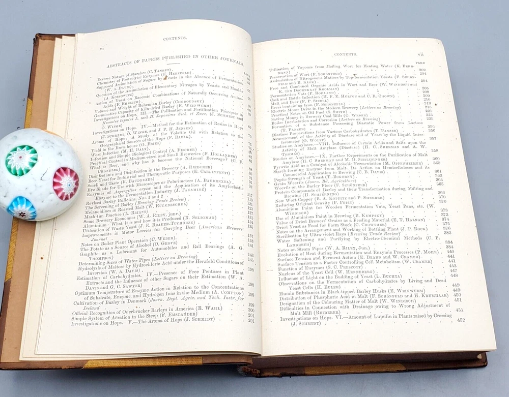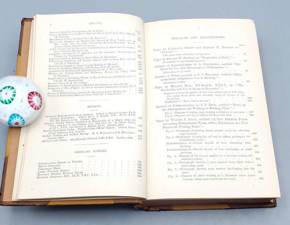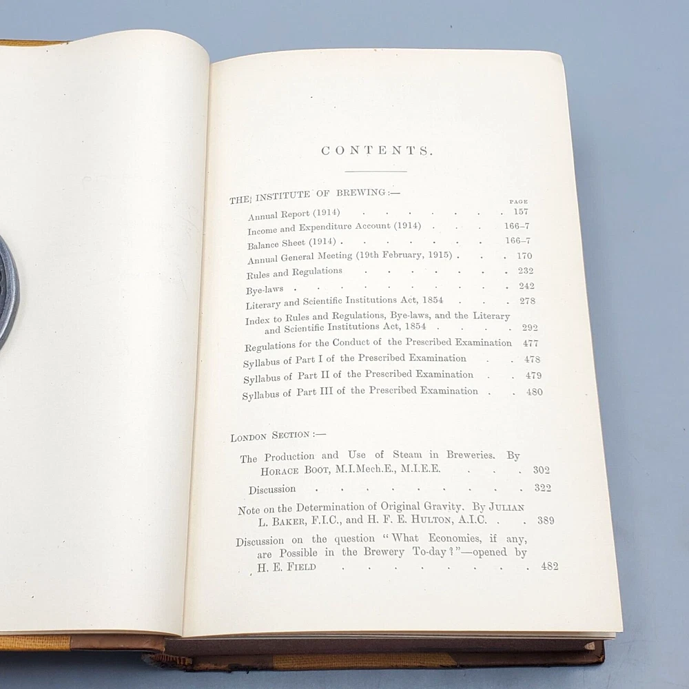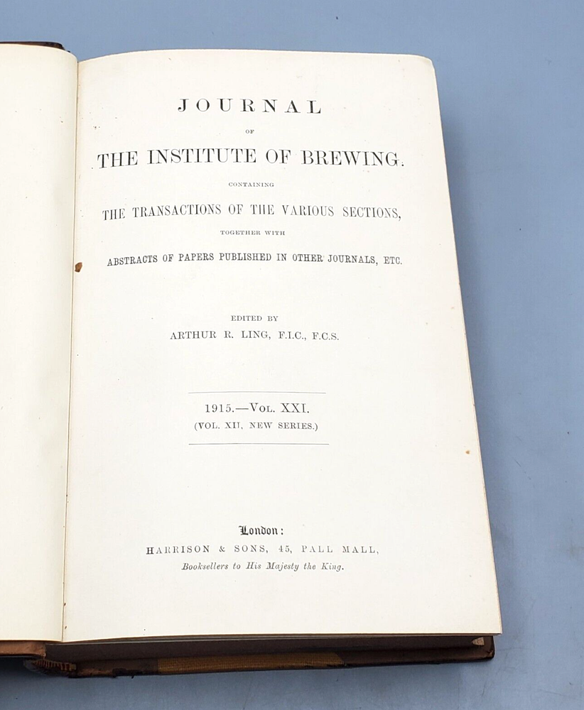 We’re offering Journal of the Institute of Brewing Containing the Transactions of the Various Sections, Together with Abstracts of Papers Published in Other Journals, Etc., Volume XXI (21), Volume XII New Series, edited by Arthur Ling. Published 1915 by Harrison & Sons, London, this book features half bound leather on tan boards with black label and gilt stamped accents and lettering on the spine, all edges speckled; and includes black and white illustrations and photos, charts, diagrams, information on the income, expenditures, equipment, techniques such as fermentation, processing regulations of ingredients such as barley and baker’s yeast; obituaries of board members, and much more pertaining to the brewing industry in England. This book measures apx. 5 ¾ x 8 3/8 in. (WxL) and contains 652pp with indexes. Good condition (see photos and full description). Bright illustrations and clear text; binding tight; clean interior; no loose or torn pages; toning and light scattered foxing due to age; edge and spine wear; covers soiled, scuffed, and faded; corners bumped; letter and numbers in upper and lower corners of front endpaper. (See photos) A fascinating look at the brewing industry during the early 20 th century. Combined shipping for multiple purchases. Please review the photos and description. Email us with any questions you have BEFORE you purchase. We offer a 30-day money-back GUARANTEE. Please email us with questions BEFORE you return any item. Be sure to visit Bees Book Collective Ebay Store for more great items!