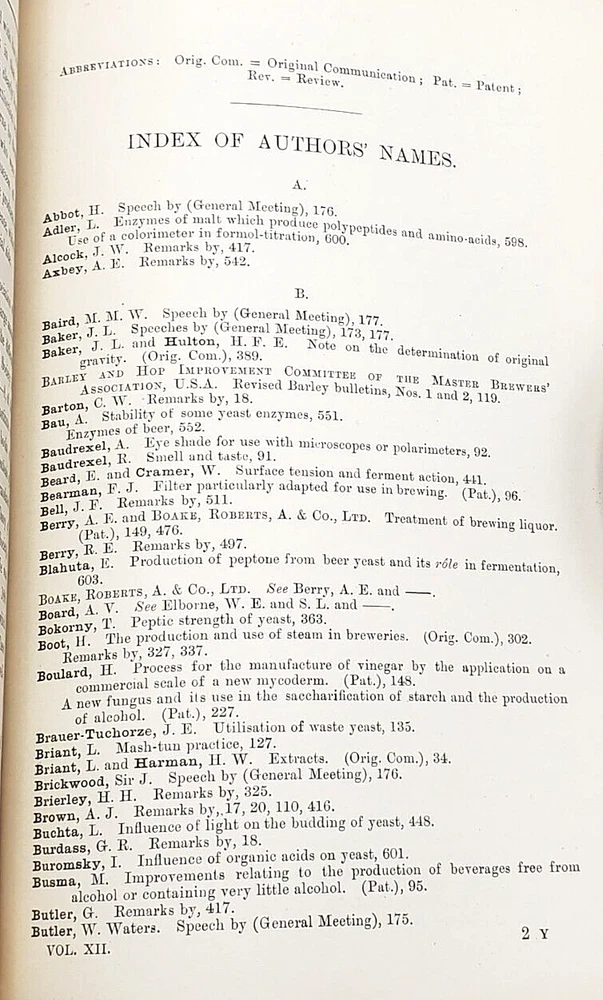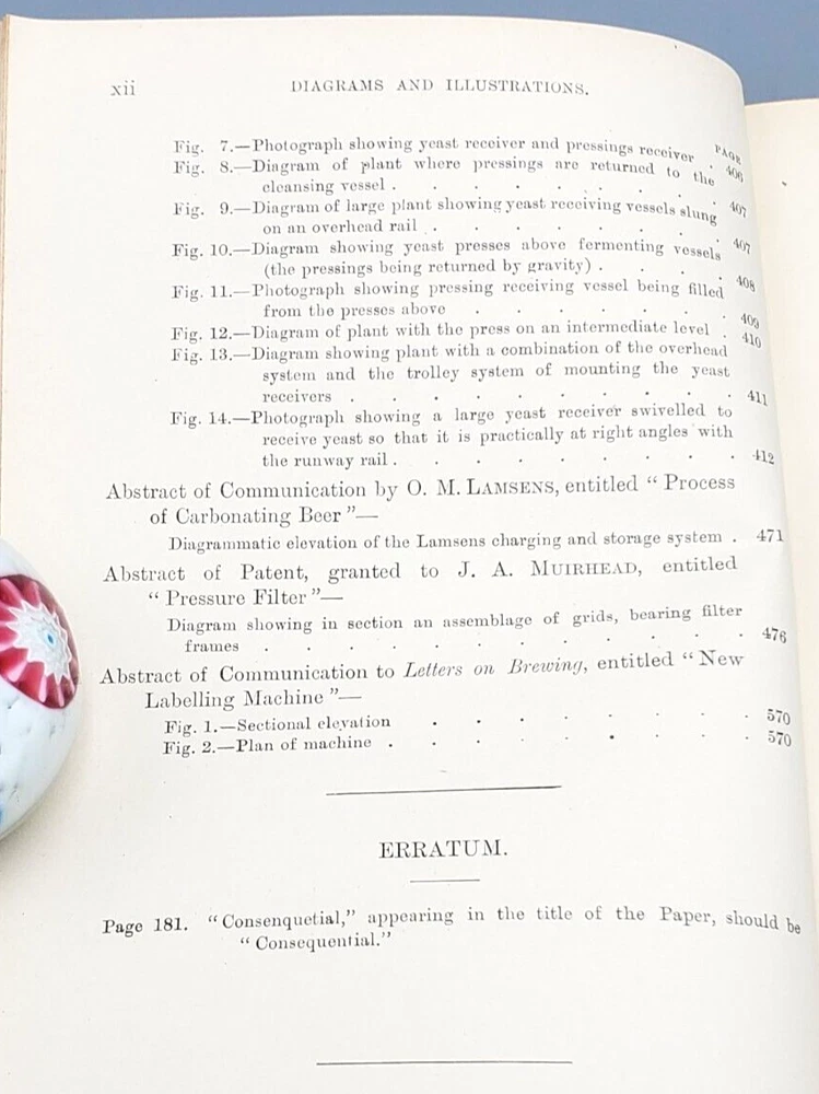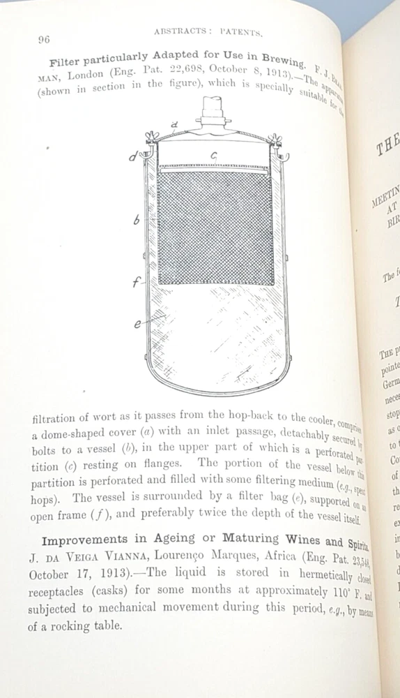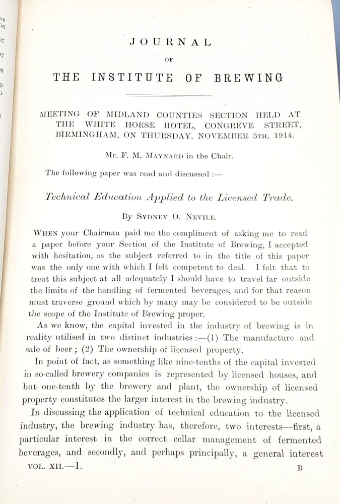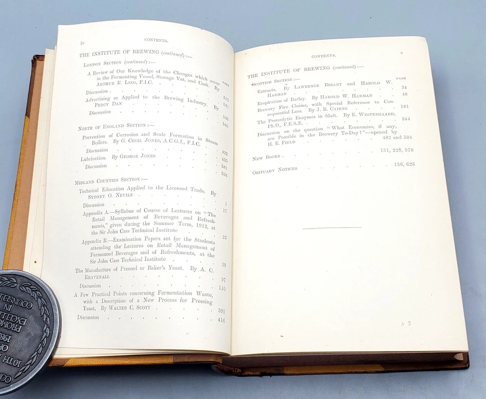 We’re offering Journal of the Institute of Brewing Containing the Transactions of the Various Sections, Together with Abstracts of Papers Published in Other Journals, Etc., Volume XXI (21), Volume XII New Series, edited by Arthur Ling. Published 1915 by Harrison & Sons, London, this book features half bound leather on tan boards with black label and gilt stamped accents and lettering on the spine, all edges speckled; and includes black and white illustrations and photos, charts, diagrams, information on the income, expenditures, equipment, techniques such as fermentation, processing regulations of ingredients such as barley and baker’s yeast; obituaries of board members, and much more pertaining to the brewing industry in England. This book measures apx. 5 ¾ x 8 3/8 in. (WxL) and contains 652pp with indexes. Good condition (see photos and full description). Bright illustrations and clear text; binding tight; clean interior; no loose or torn pages; toning and light scattered foxing due to age; edge and spine wear; covers soiled, scuffed, and faded; corners bumped; letter and numbers in upper and lower corners of front endpaper. (See photos) A fascinating look at the brewing industry during the early 20 th century. Combined shipping for multiple purchases. Please review the photos and description. Email us with any questions you have BEFORE you purchase. We offer a 30-day money-back GUARANTEE. Please email us with questions BEFORE you return any item. Be sure to visit Bees Book Collective Ebay Store for more great items!
