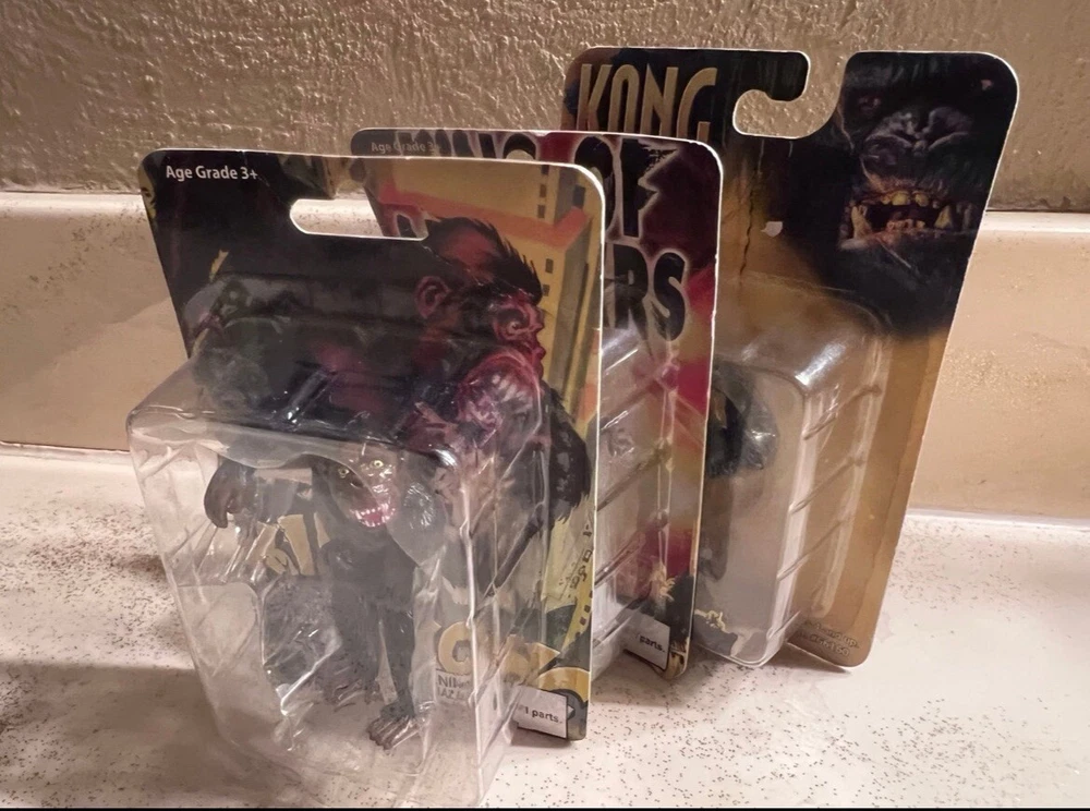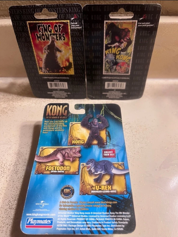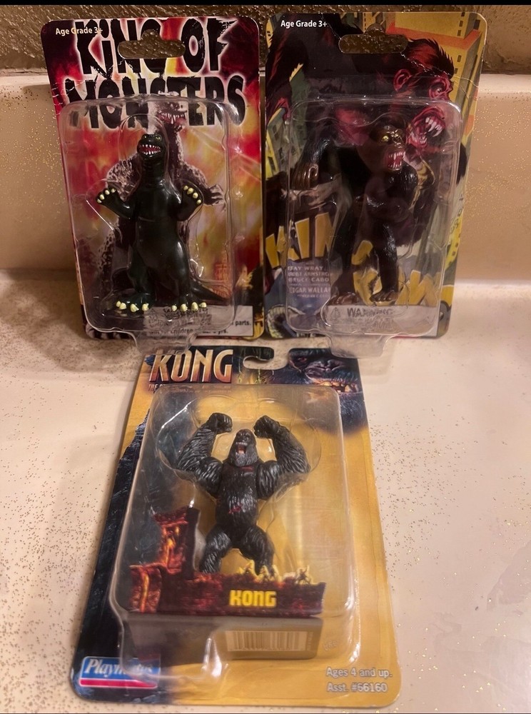 Set of 3 new and sealed KING KONG & GODZILLA 3 INCH FIGURES -2005 PLAYMATES KONG THE 8TH WONDER OF THE WORLD -2005 GREENBRIER INTERNATIONAL KING OF MONSTERS GODZILLA -2005 GREENBRIER INTERNATIONAL CLASSIC KING KONG IMO figures and packages are in great condition considering they are 19 years old. Very minor crease to KING KONG AND GODZILLA packages. Hard to notice. Pictures show exactly what you will be receiving.