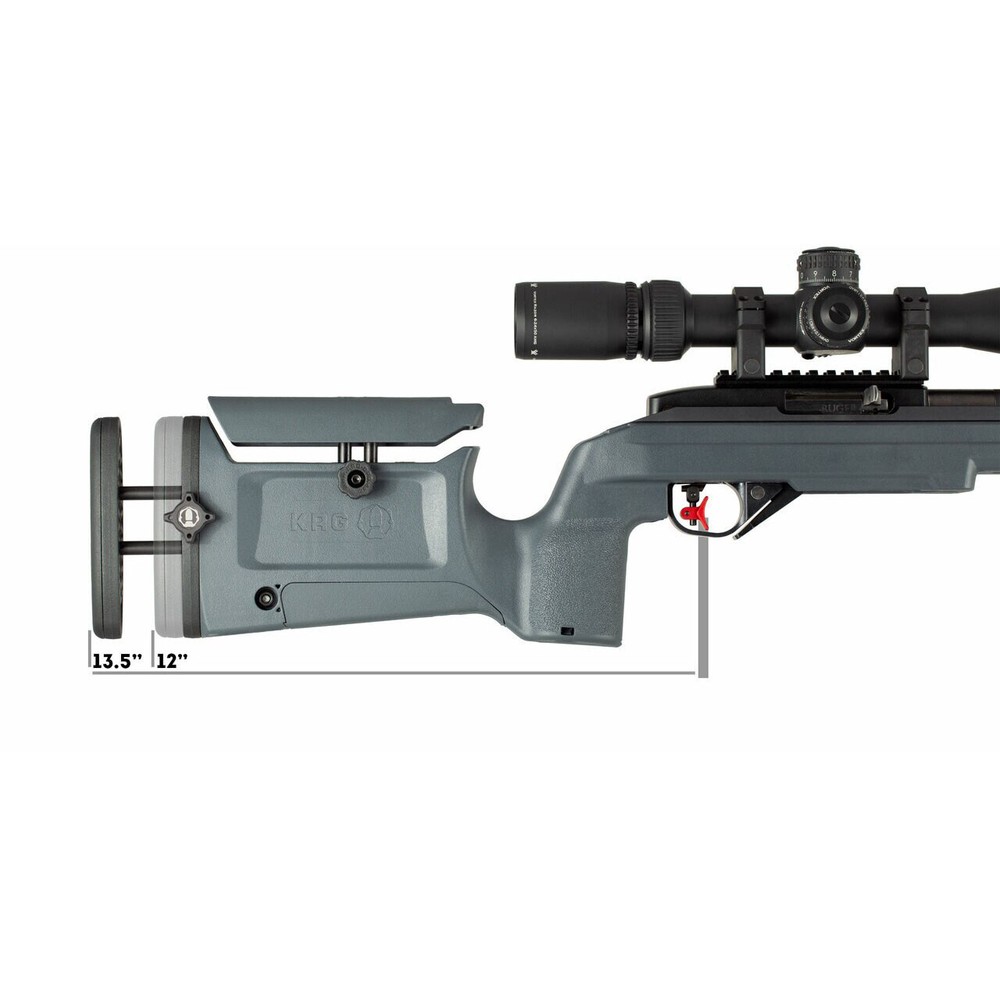 Rimfire Mechanism for Tool-less Length of Pull Using spacers to change your length of pull (LOP) on your rimfire can be a cumbersome process. With KRG's adjustable LOP plate, you can easily adjust the butt pad for each shooter without taking out or adding spacers. However, if you would like to use spacers in addition to this rimfire mechanism, it will offer even more adjustment. Product Specs: LOP Range: 12" to 13.5" (when installed on the 10/22 Bravo) Fits: KRG 10/22 Bravo Chassis, Bravo Chassis for Tikka T1x and CZ-457 rimfire Weight: 4.2 oz. Material: Reinforced Polymer Manufactured: USA