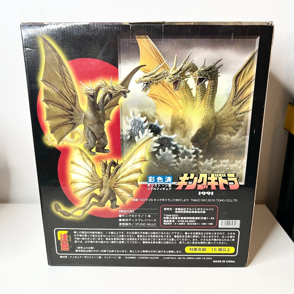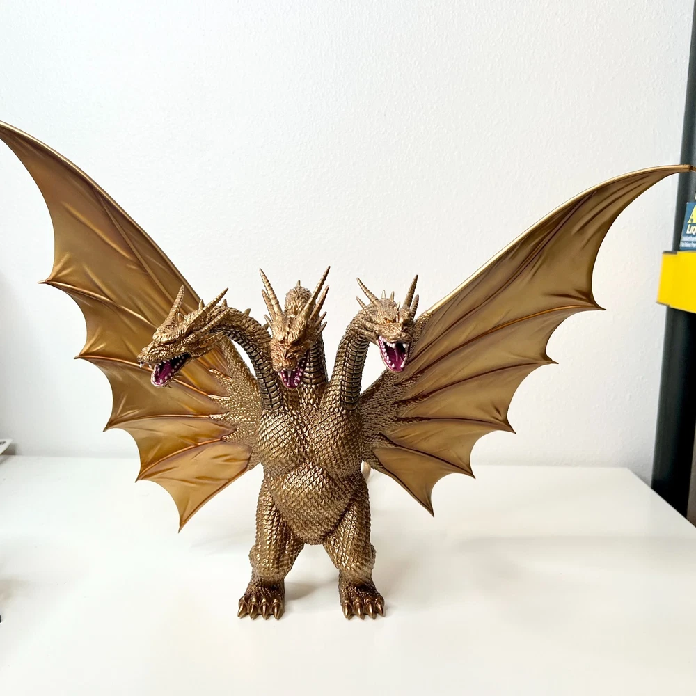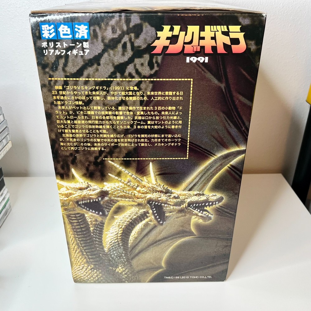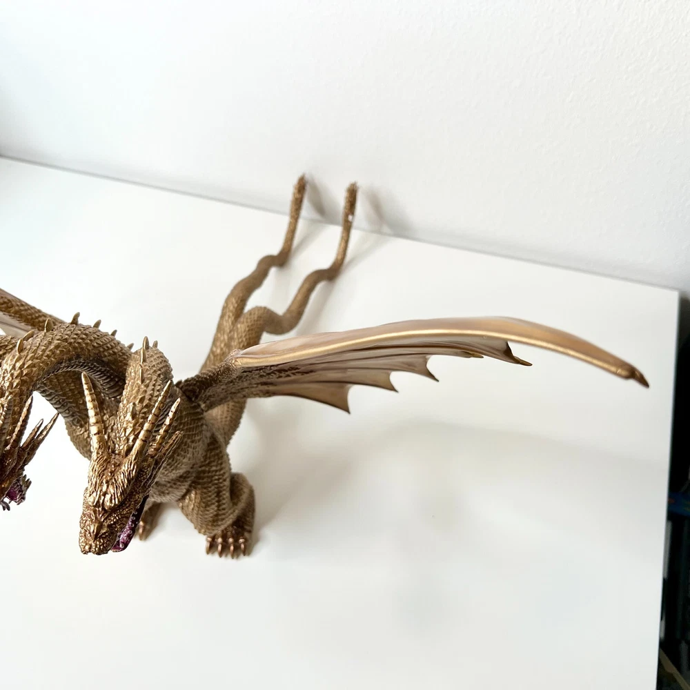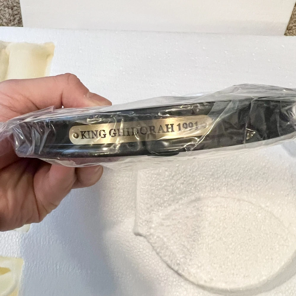 Hello collectors, Here's a King Ghidora Polystone Figure from Godzilla 1991 series. Comes with box and figure. Overall in very good condition. It may possibly be new, but I have marked as used as I'm unable to confirm new condition. While taking pictures I accidentally broke off two spikes from the tail as shown in pictures. Item is fragile so please handle carefully. Figure is very large with wings and tails. Easily over 12'' tall and long. Figure is assembled and held together by magnetic connection. Grey dust near the tail connection is magnetic dust. Please send me a message with any questions.