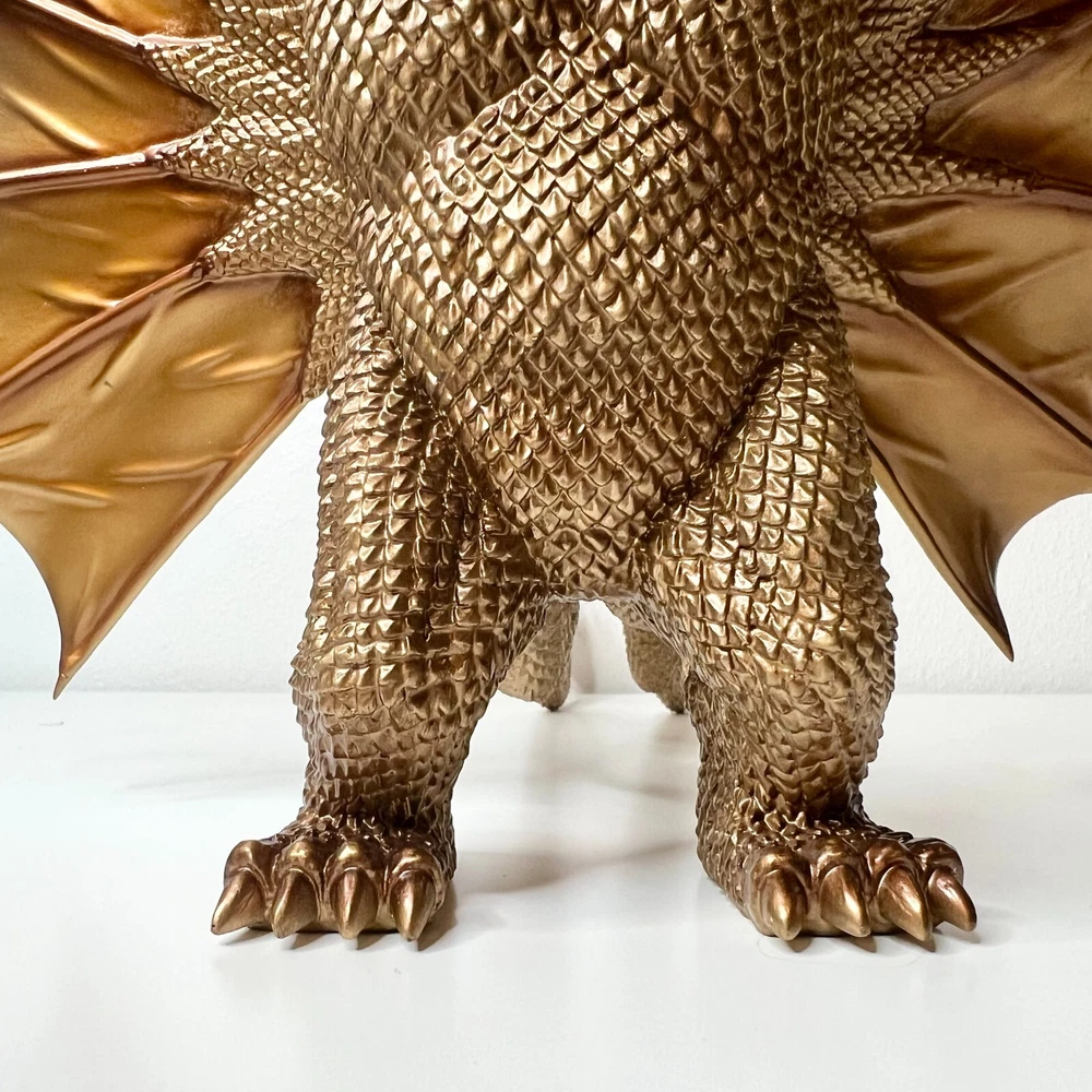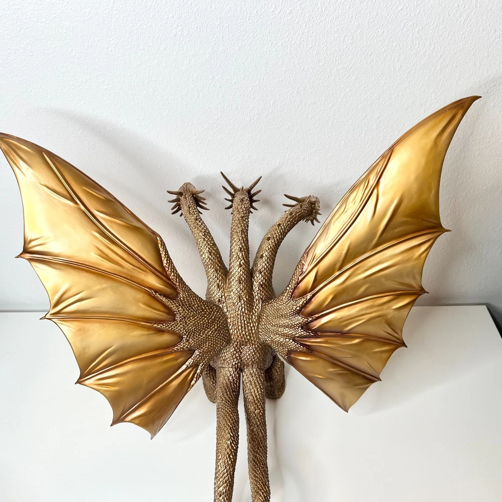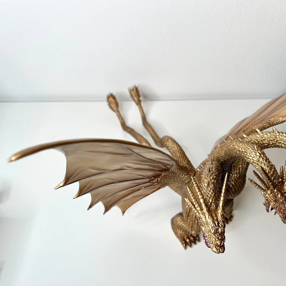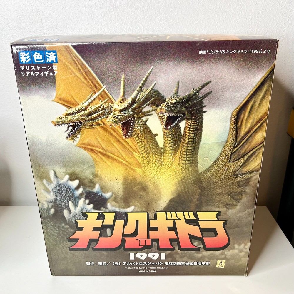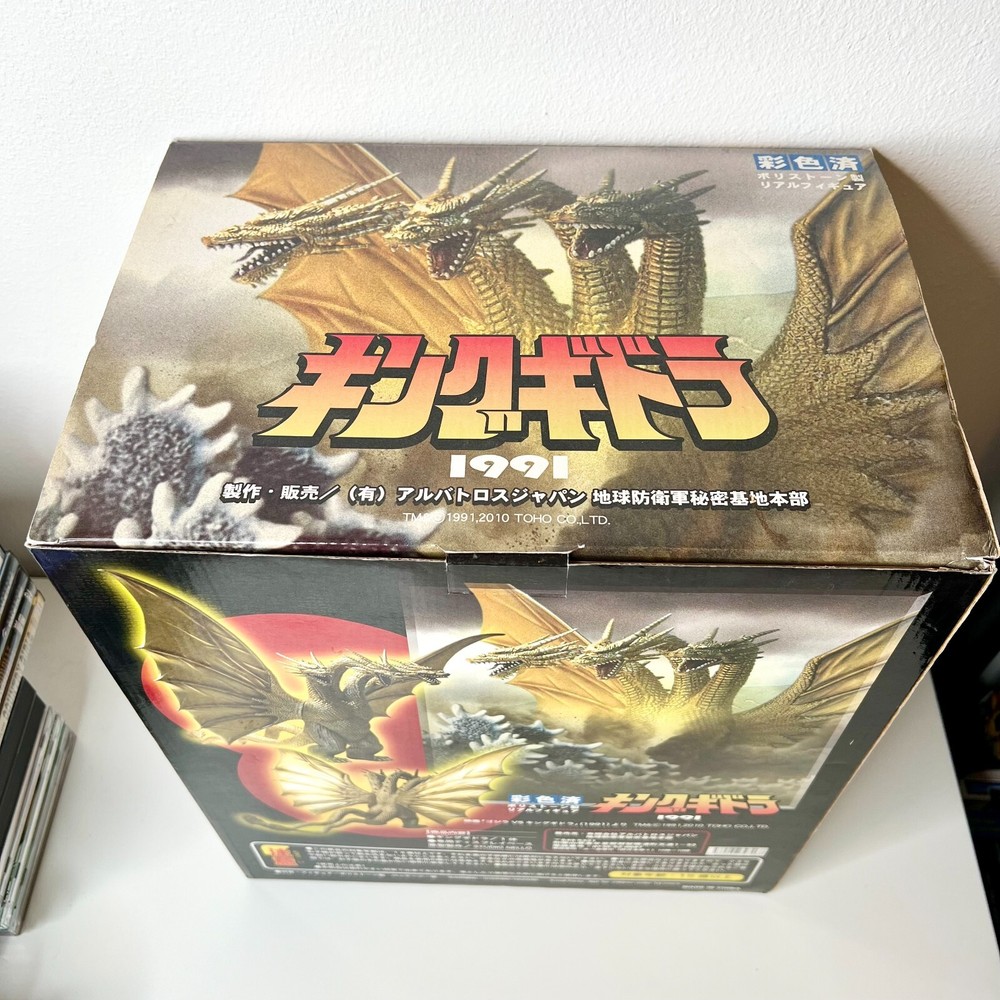 Hello collectors, Here's a King Ghidora Polystone Figure from Godzilla 1991 series. Comes with box and figure. Overall in very good condition. It may possibly be new, but I have marked as used as I'm unable to confirm new condition. While taking pictures I accidentally broke off two spikes from the tail as shown in pictures. Item is fragile so please handle carefully. Figure is very large with wings and tails. Easily over 12'' tall and long. Figure is assembled and held together by magnetic connection. Grey dust near the tail connection is magnetic dust. Please send me a message with any questions.