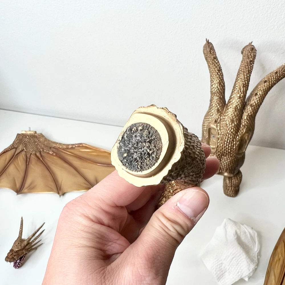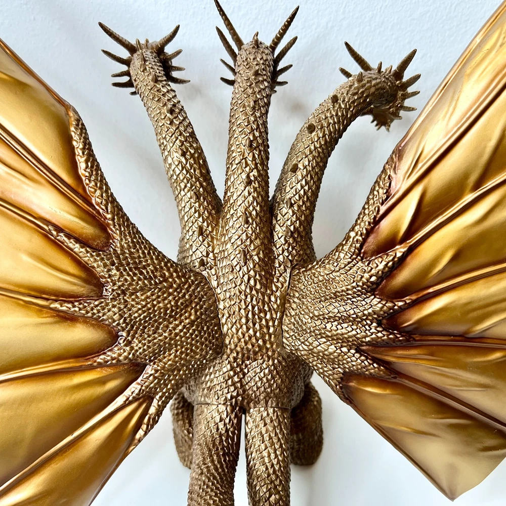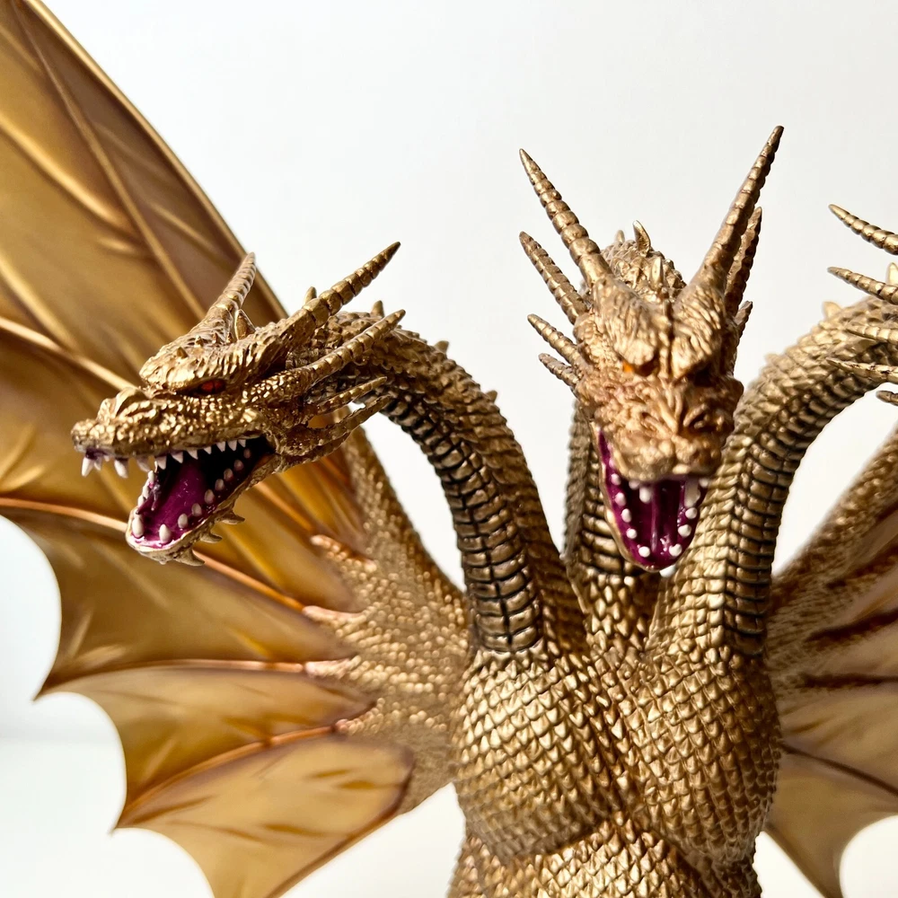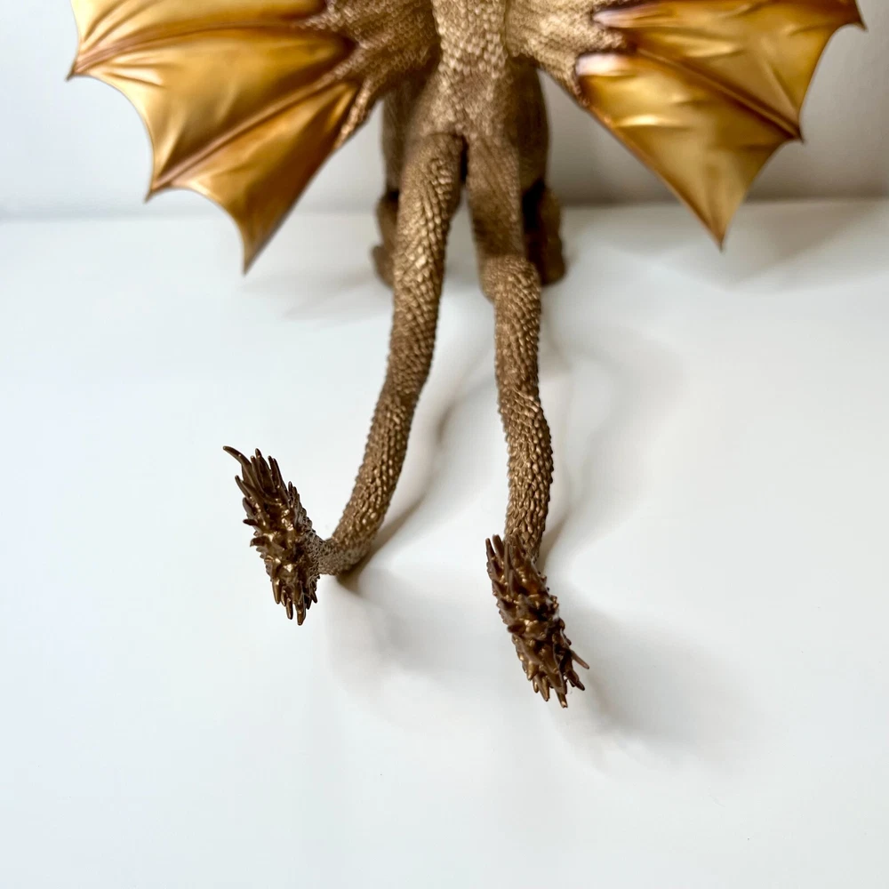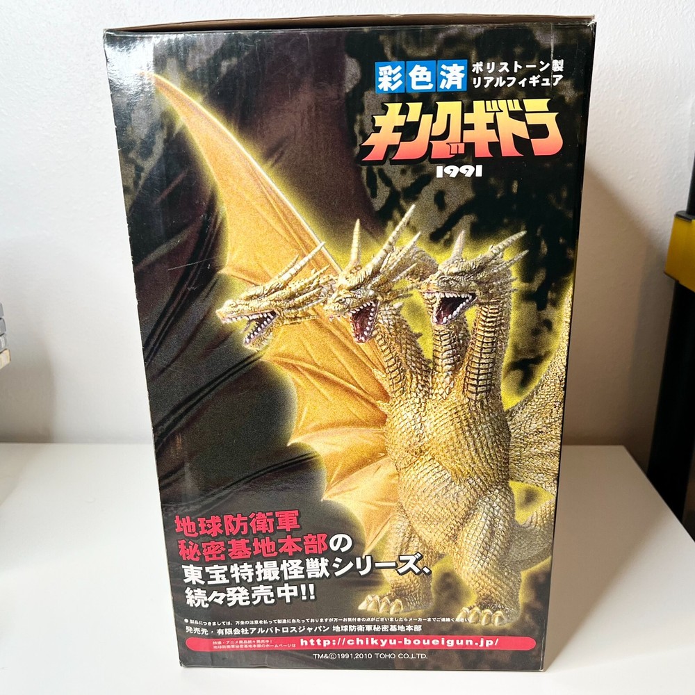 Hello collectors, Here's a King Ghidora Polystone Figure from Godzilla 1991 series. Comes with box and figure. Overall in very good condition. It may possibly be new, but I have marked as used as I'm unable to confirm new condition. While taking pictures I accidentally broke off two spikes from the tail as shown in pictures. Item is fragile so please handle carefully. Figure is very large with wings and tails. Easily over 12'' tall and long. Figure is assembled and held together by magnetic connection. Grey dust near the tail connection is magnetic dust. Please send me a message with any questions.