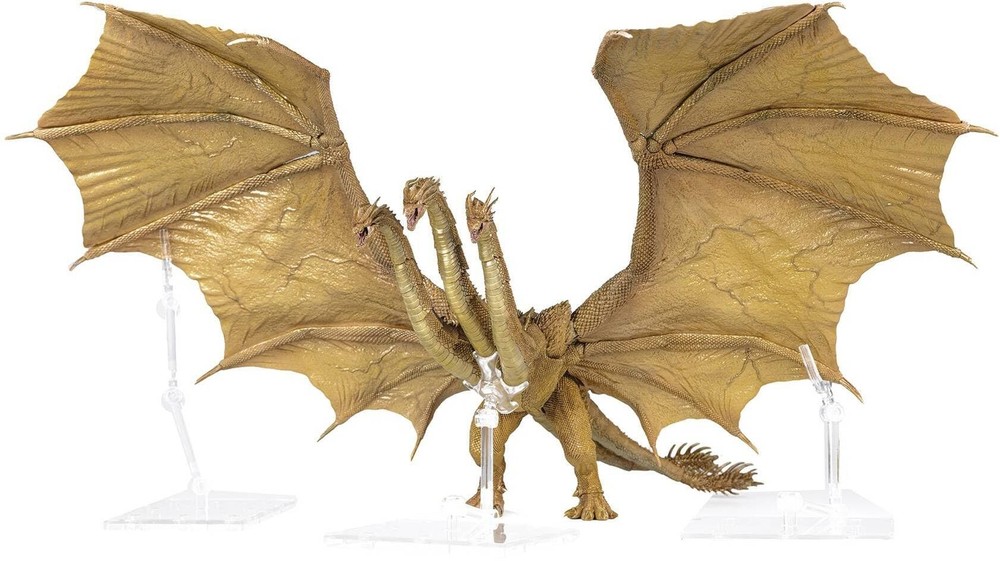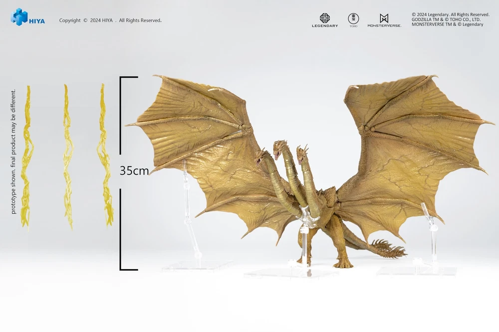 Product Page King Ghidorah Action Figure 137 inches Tall Godzilla King of the Monsters 2019 Description: From Hiya Toys. A PREVIEWS Exclusive! Introducing the mighty King Ghidorah from Godzilla: King of the Monsters (2019), as part of the Hiya Exquisite Basic collection! This formidable figure faithfully represents Ghidorah's imposing presence, featuring multiple layers of metallic golden paint and intricate details across its three head sculpts. Standing at 13.7" tall with an incredible wingspan of 22", it offers numerous pose options with its multiple joints. Included are three Gravity Beams effect parts, allowing fans to recreate Ghidorah's iconic battle poses from the film with stunning accuracy! Features: From the 2019 film Measures 13.7” tall with a wingspan of 22” Offers numerous pose options with its multiple joints Includes Gravity Beam effect parts