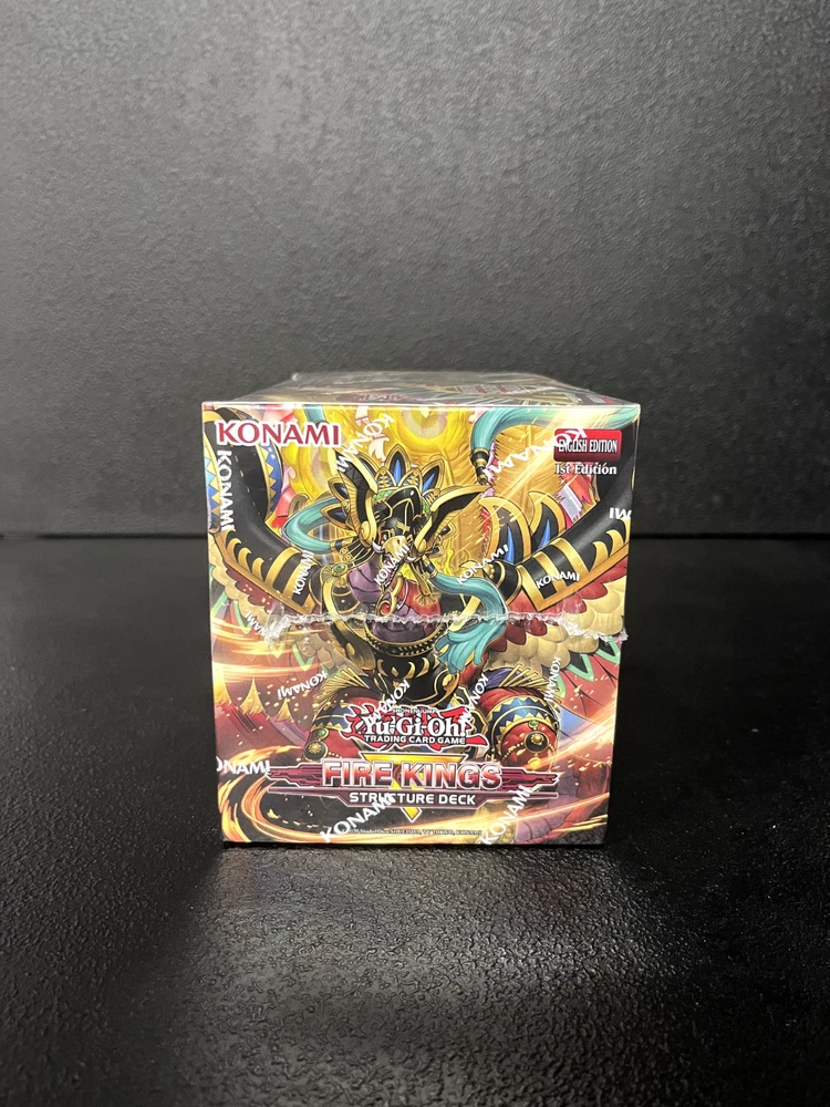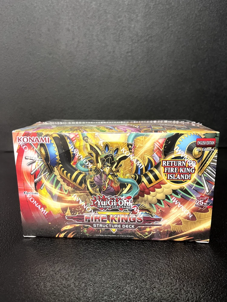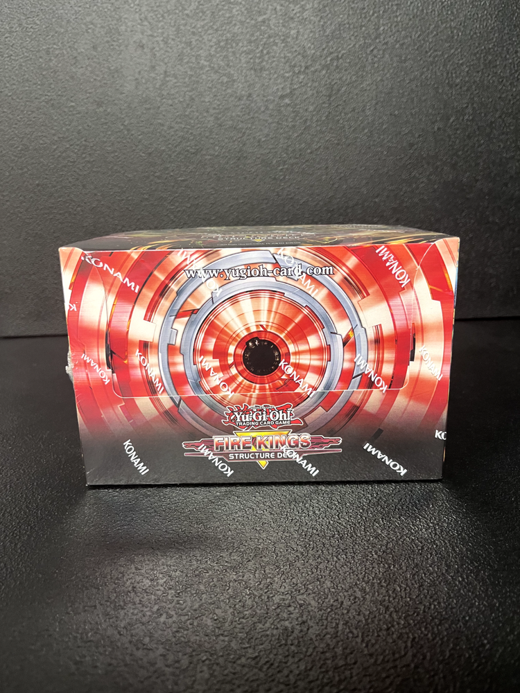 Description of Box: Melt through the snow and ice this December with Structure Deck: Fire Kings ! EXTREME HEAT AHEAD! Melt through the snow and ice this December with Structure Deck: Fire Kings ! Intensify your Deck’s firepower with brand-new Monster, Spell, and Trap Cards that unleash the true destructive power of Fire King High Avatar Garunix ! Here is just some of what you can expect: A new version of Fire King High Avatar Garunix takes the field! It can rise from the ashes (or fly down from your hand) any time one of your FIRE monsters are destroyed, then pump up its own ATK by consuming another monster from your hand, Deck, or field. Use this to activate your other “Fire King” monster effects or come up with your own combo strategies with other FIRE monsters! A new Continuous Spell Card that can place Fire King Island right from your Deck into your Field Zone! It also protects your Field Spell from being destroyed and allows you to Xyz Summon during your opponent’s turn if they Special Summon a monster. There’s even a new Trap Card to set up the Xyz Summon’s materials, by Summoning 3 FIRE monsters – 1 each from your hand, Deck, and Graveyard. A new Rank 8 Xyz Monster that shines brightest in a “Fire King” Deck, but can be Summoned using any 2 Level 8 monsters as materials, so you can include this card in a ton of other strategies too! If it’s Xyz Summoned, you can instantly reduce all other monsters on the field to cinders! After the monsters are taken care of, you destroy a Spell or Trap Card as well, while increasing your monster’s ATK! Configuration: 1 Display, 8 Units Per Display