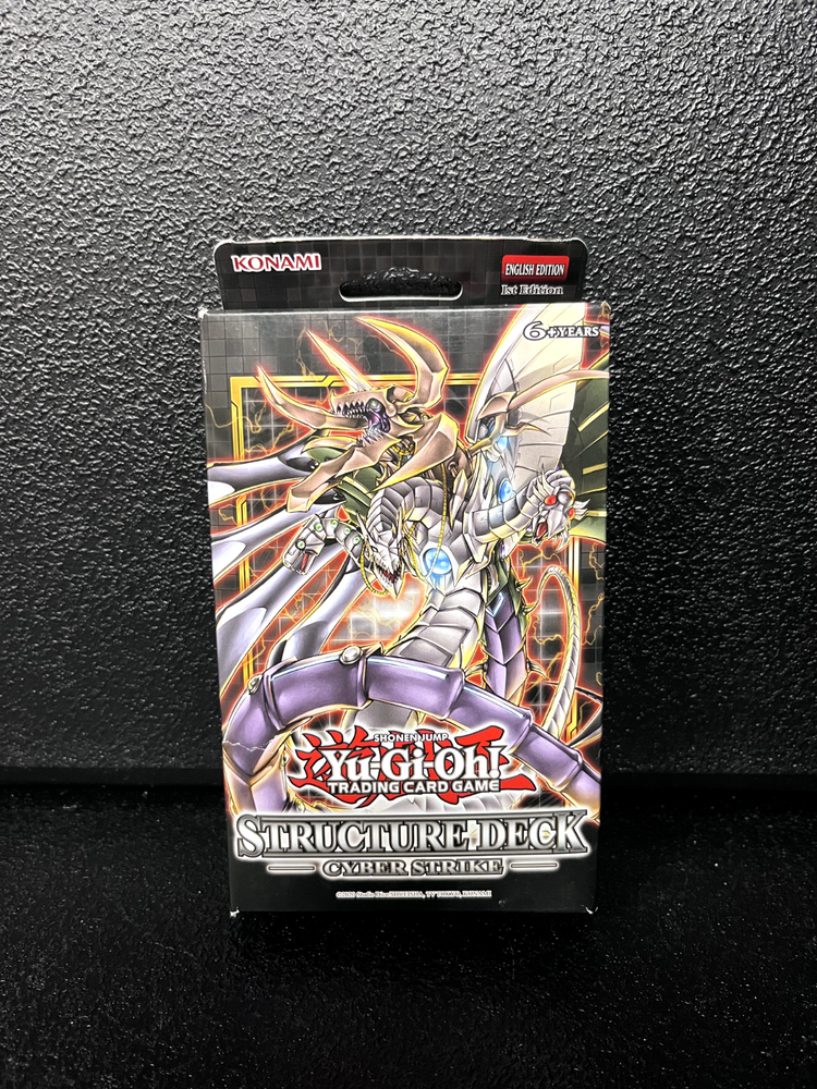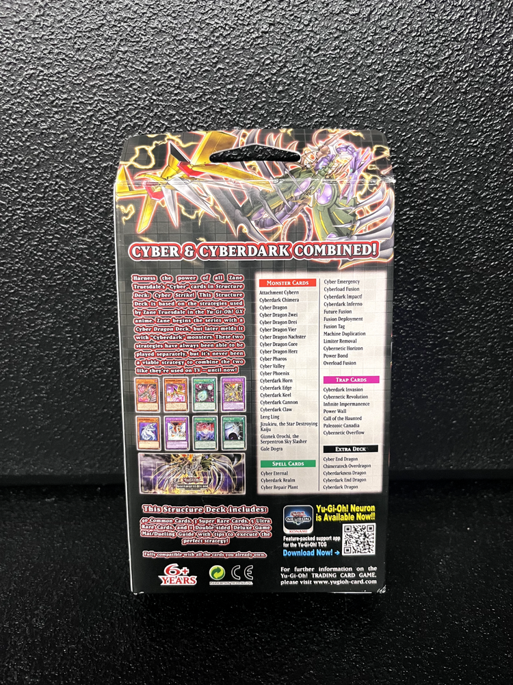 Description of Box: Master the forbidden Fusion arts that combine fierce Dragon and Machine monsters with Structure Deck: Cyber Strike! Structure Deck: Cyber Strike enhances both of Zane Truesdale’s strategies from the Yu-Gi-Oh! GX anime! This is one of the most customizable Structure Decks yet. You can choose to focus on Zane’s original Cyber Dragon Fusion strategy, his Dragon-based Cyberdark strategy, or play both together in a single Deck like in the later seasons of Yu-Gi-Oh! GX. Cyber Dragons! You can fuse together multiple copies of Cyber Dragon with Power Bond to create Zane’s signature Cyber End Dragon and raise its ATK all the way to 8000! It’s easier than ever thanks to a brand-new monster that can add Power Bond from your Deck and let you use monsters in your Graveyard as Fusion Materials for it. Cyberdarks! Load your Graveyard with Dragons, then equip them to your “Cyberdark” monsters to power them up! Use Cyberdark Impact! to fuse together the original 3 “Cyberdark” monsters to create Cyberdark Dragon or use Overload Fusion to fuse any 5 “Cyberdark” Effect Monsters to create Cyberdarkness Dragon instead. Configuration: 1 Unit