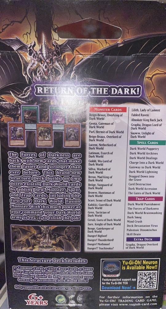 Konami presents the Yu-Gi-Oh! TCG Dark World Deck, a must-have for fans of the game. This set features 45 English cards, including 1st Edition Structure Deck cards, and is manufactured in 2022. With three decks or kits in this collection, players can enjoy the thrill of the game without worrying about the condition of their cards. The Dark World Deck is perfect for collectors and players alike, with its unique cards and powerful spells. Get your hands on this Yu-Gi-Oh! TCG Dark World Deck today and experience the excitement of the game.
