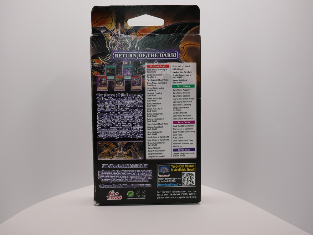 The forces of darkness are back, with new cards that make them faster and stronger than ever before this brand new structure deck builds on two dozen existing dark world cards by adding new monster, spell, and trap cards, including the first ever dark world fusion monster with this much power at your command, your dark world army is ready to finish the job!
