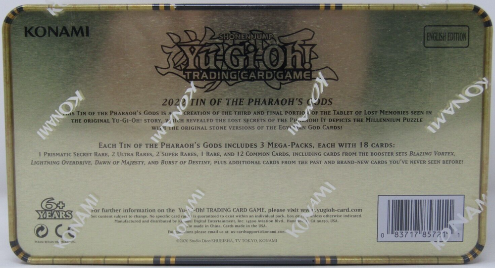 Konami Yu-Gi-Oh! TCG Tin of the Pharaoh's Gods Lot of 12 Tins Please read the terms and conditions below carefully ----------------------------------------------------- ** Fast and secure shipping on this auction is $Free** ** We are happy to combine shipping for multiple items** ----------------------------------------------------- ** Terms and Conditions ** ** Please read completely! ** ----------------------------------------------------- All items are sold as is exactly as they appear in the pictures provided in the auction. If you have any questions at all, please ask prior to bidding. This will insure that you are getting the product you want, at the price you want. Per eBay rules, a bid is a contract to buy. We appreciate you only bidding on items that you actually wish to purchase. All payments are requested within 24 hours. NPGames takes great pride in delivering flawless customer service. We are available 7 days a week from 10-6 EST to answer any of your questions or concerns.