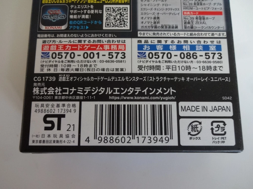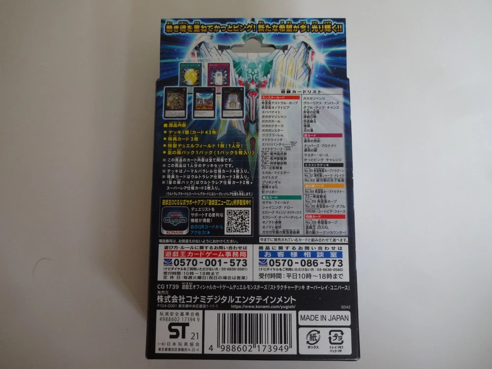 [Product Description] Thanks for visiting. I always do my best. I do package very well for my buyers to receive it in an excellent condition. This product is Konami Yu-Gi-Oh OCG Duel Monsters Structure Deck R "Overlay Universe". It is a new unopened item. Release year: 2021 Product code: 4988602173949 A structure deck that allows you to enjoy the world view of ZEXAL, with the card of the main character "Yuma" as the axis, and the "No." of "Shark" and "Kite" also recorded! A deck enhancement pack is included, and you can enjoy deck enhancement using cards from the enhancement pack. Secret rare specifications also exist for ultra rare specification and super rare specification cards in deck enhancement packs. ■ Product content ・Constructed deck: 1 (43 cards) ・Deck strengthening pack: 1 pack (5 cards) ・Bonus cards: 3 cards (ultra rare specification) ・Special Duel Field (for 1 person) / Playing Guide: 1 sheet [International Buyers] Import duties, taxes, and fees are not included in the item price or shipping cost. These costs are the responsibility of thepurchaser. Product Description Import duties, taxes, and fees are not included in the item price or shipping charges. These fees are usually collected by the shipping (freight) company or at the time of receiving the goods, and should not be confused with additional shipping charges.