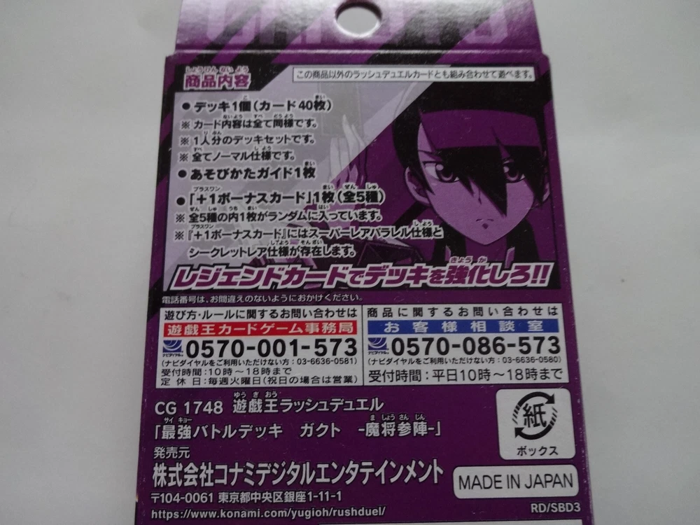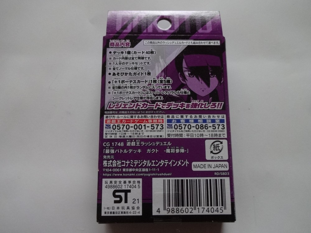 [Product Description] Thanks for visiting. I always do my best. I do package very well for my buyers to receive it in an excellent condition. This product is Konami Yugioh Rush Duel Strongest Battle Deck Demon Commander "Gakuto". It is a new unopened item. Release year: 2021 Product code: 4988602174045 You can play Rush Duel right away! A total of 7 types of "Strongest Battle Deck" built with the image of the main characters in the "Gakuto" version! This is a pre-constructed deck that is perfect for those who are just starting out! In addition to existing cards, new cards are also included, and you can always get 1 new legend card randomly selected from all 5 types that can strengthen your deck with the included "+1 bonus card"! ※There is also a secret rare specification for the super rare parallel specification card of "+1 bonus card" ■ Product content ・Constructed deck: 1 (40 cards) ・ +1 bonus card: 1 (5 types in total / super rare parallel specification) ※There is also a secret rare specification for the super rare parallel specification card of "+1 bonus card" ・How to play guide: 1 sheet [International Buyers] Import duties, taxes, and fees are not included in the item price or shipping cost. These costs are the responsibility of thepurchaser. Product Description Import duties, taxes, and fees are not included in the item price or shipping charges. These fees are usually collected by the shipping (freight) company or at the time of receiving the goods, and should not be confused with additional shipping charges.