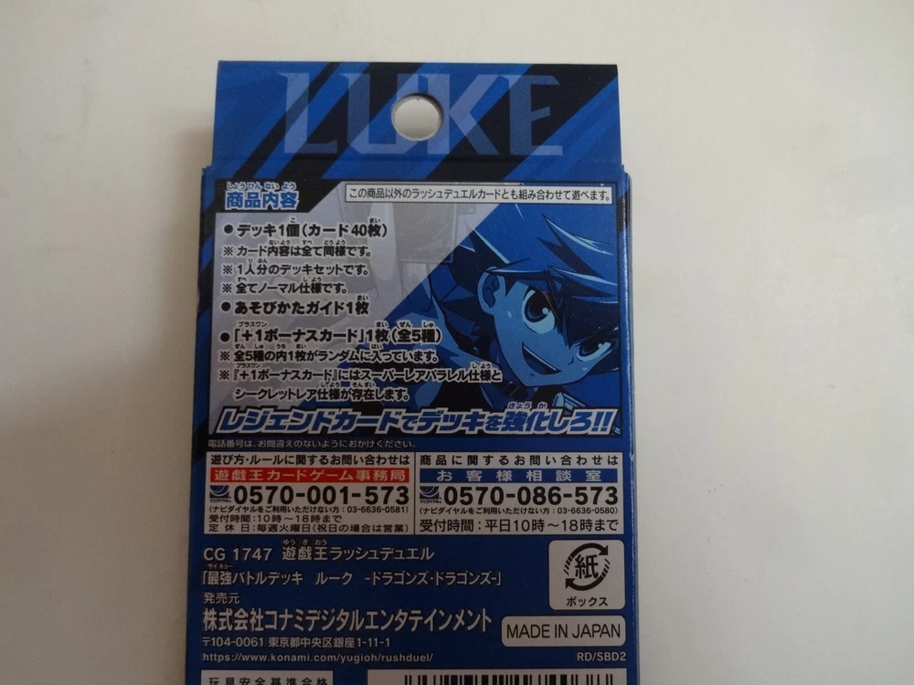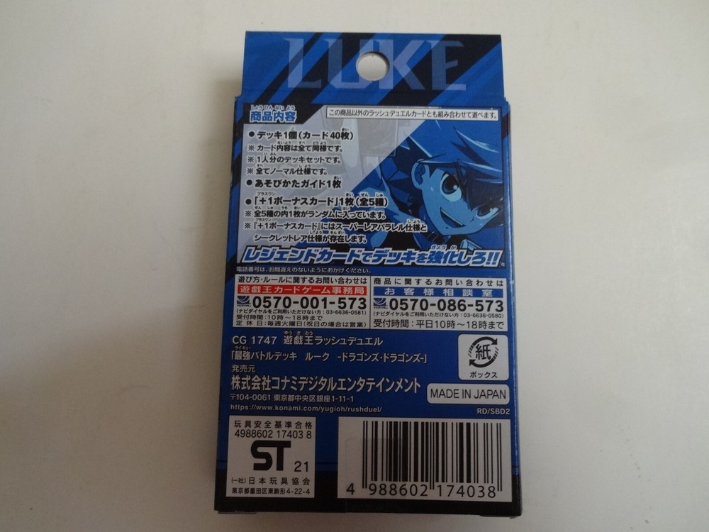 [Product Description] Thanks for visiting. I always do my best. I do package very well for my buyers to receive it in an excellent condition. This product is Konami Yugioh Rush Duel Strongest Battle Deck Dragon's Dragons "Luke". It is a new unopened item. Release year: 2021 Product code: 4988602174038 You can play Rush Duel right away! All 7 types of "Strongest Battle Deck" built with the image of the main characters in the "Luke" version! This is a pre-constructed deck that is perfect for those who are just starting out! In addition to existing cards, new cards are also included, and you can always get 1 new legend card randomly selected from all 5 types that can strengthen your deck with the included "+1 bonus card"! ※There is also a secret rare specification for the super rare parallel specification card of "+1 bonus card" ■ Product content ・Constructed deck: 1 (40 cards) ・ +1 bonus card: 1 (5 types in total / super rare parallel specification) ※There is also a secret rare specification for the super rare parallel specification card of "+1 bonus card" ・How to play guide: 1 sheet [International Buyers] Import duties, taxes, and fees are not included in the item price or shipping cost. These costs are the responsibility of thepurchaser. Product Description Import duties, taxes, and fees are not included in the item price or shipping charges. These fees are usually collected by the shipping (freight) company or at the time of receiving the goods, and should not be confused with additional shipping charges.