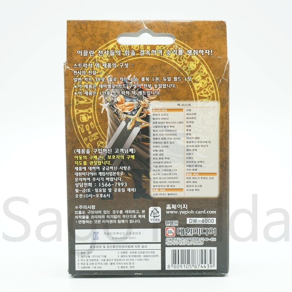 -------------------------------------------------------------------- Welcome to Sago-Palda's Store -All the items we sell are guaranteed to be 100% authentic. -Feel free to contact us if you have any questions. Please Note! - Undervalue is illegal . Please do not ask us about it -Please use the recipient's name with a FULL NAME without abbreviation. If it's not a full name, there can be a shipping problem. -Please fill out the shipping details in English. According to the shipping company policy, other languages except English will not be processed. ------------------------------------------------------------------- Konami Yugioh Yu-Gi-Oh! TCG Structure Deck Warrior's Triumph - Korean Ver. 2010 <Specification> -Condition: NEW -Language: Korean -Official Licensed Product <Checklist> 1. This product is released a long ago. So, The art box has scratches, stains, or damage, which are not reasons for return, exchange, or refund <Shipping> -Handling time: 3 business days from the payment receiving date. -Economy Shipping: It usually takes about 2~4 weeks for the product to arrive. (+Tracking provided) -Expedited Shipping: It usually takes about 1~2 weeks for the product to arrive. (+Tracking provided) (Depending on the local situation, it can be delayed further.) <Customs Duties and Taxes> We are not responsible for any Customs Duties and Taxes incurred by the buyer's country. If you are not willing to pay duties and taxes, please do not place an order. <Return and Refund Policy> All returns for a refund must be UNOPENED and in New Condition, in their original box with all components included. For items refused due to Customs Taxes or unclaimed by the buyer, return shipping costs will be borne by the buyer. By purchasing our items, you agree to all terms and conditions outlined in our policy. <Customer Service> We always do our best to ensure successful transactions. However, unexpected problems can sometimes arise beyond our control. We promise we will try to resolve the problem ASAP. <Feedback> Please kindly ask that you contact us before leaving any negative feedback regarding product dissatisfaction. We will do our best to resolve the complaint