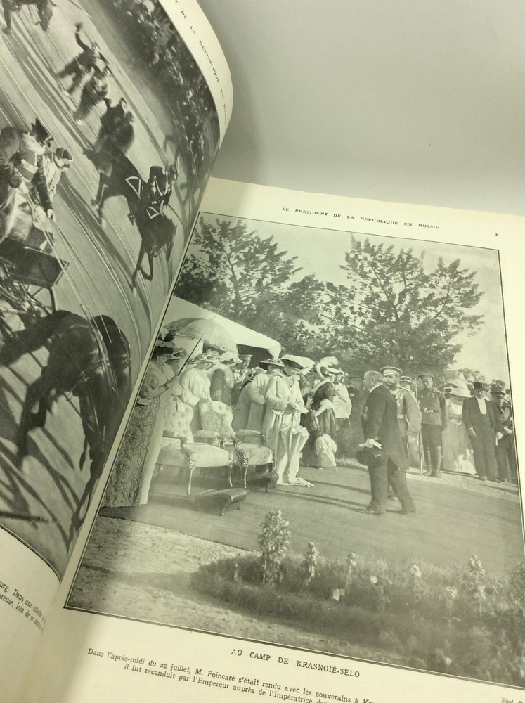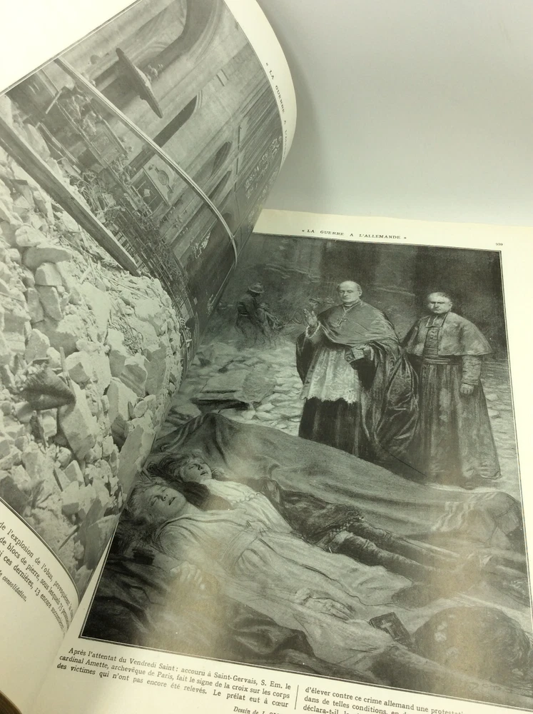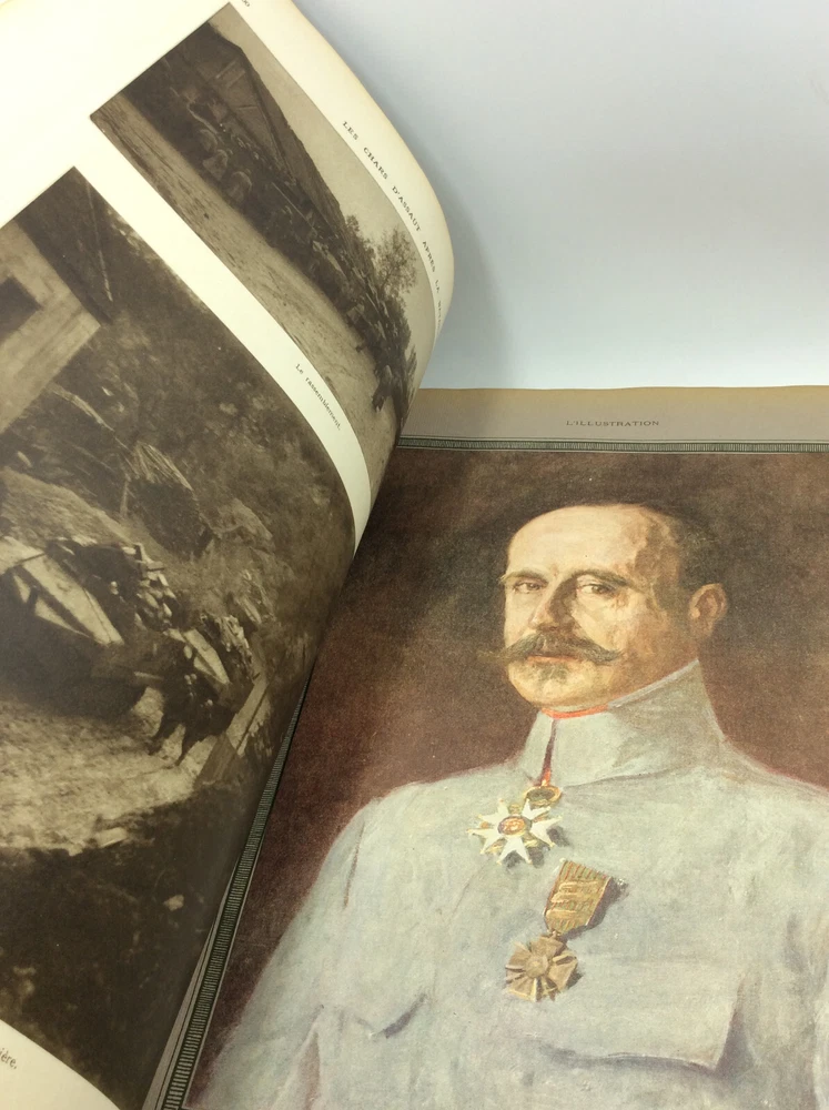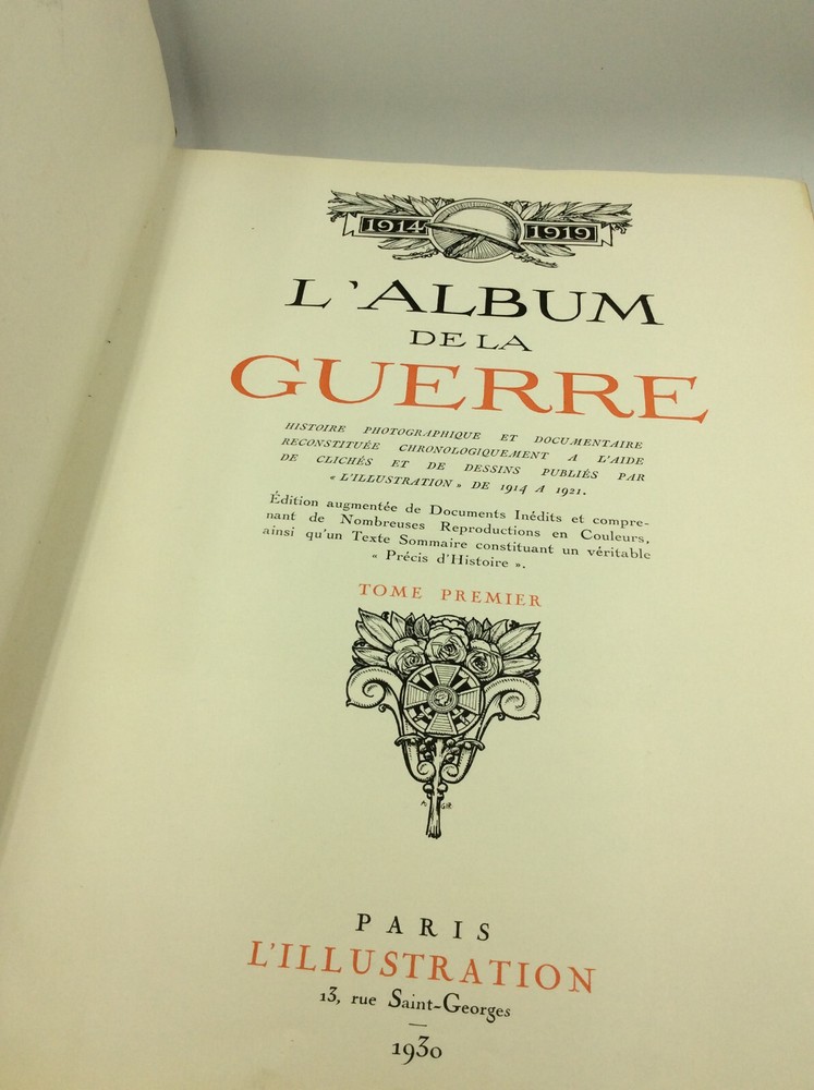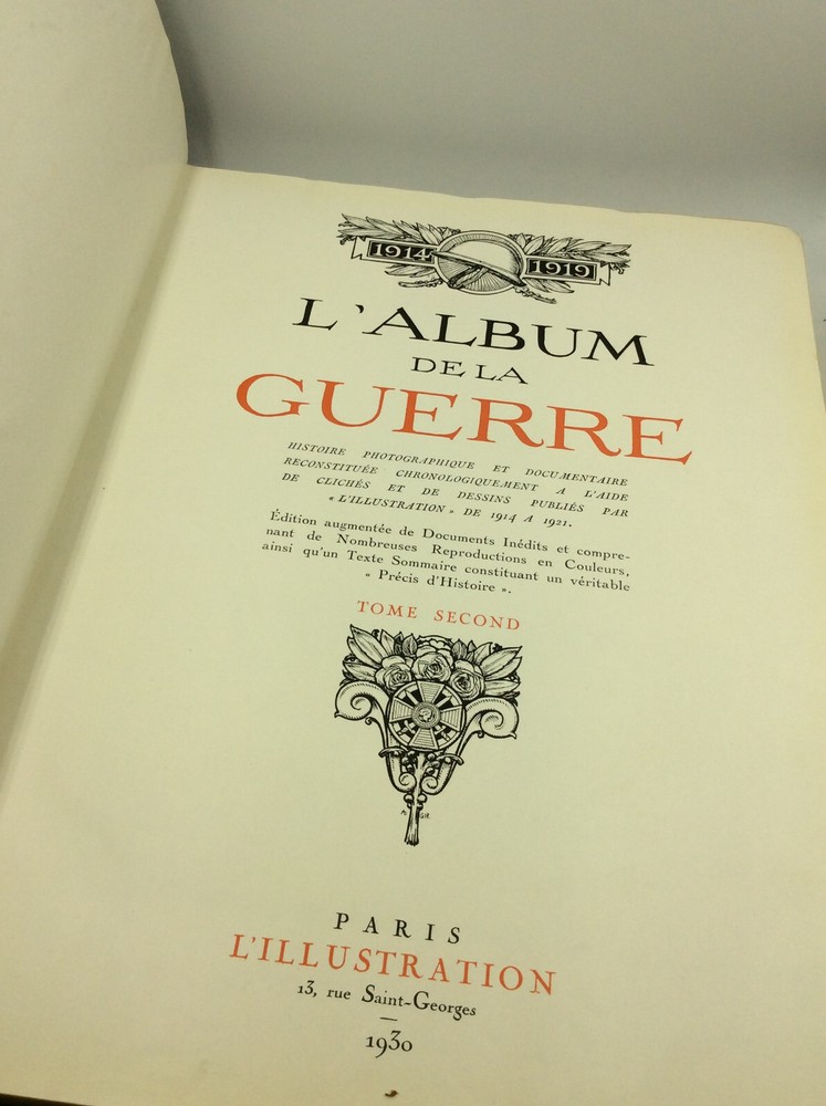 L'ALBUM DE LA GUERRE: Histoire Photographique et Documentaire Reconstituee Chronologiquement a l'Aide de Cliches et de Dessins Publies par "L'Illustration" de 1914 a 1921, Tomes I-II Paris: L'Illustration, 1930. Leather. 2 vols., 1302p total. A set of two large, folio-size hardcover books bound in golden-brown leather with gilt lettering. The spines and boards are heavily scuffed. Tipped-in plate of General Joffre is missing. First few leaves of volume 2 are coming loose. Occasional light fingerprint smudges, but otherwise, text and plates are clean. Binding is still holding, but due to the weight of these heavy volumes, the binding could easily crack if the books are not handled gently. Item #183775 A magnificent photographic history of World War I, filled with images which were originally published in the French weekly newspaper L'ILLUSTRATION. Also contains color paintings and tipped-in plates of French and British commanders. Complete in two volumes, with all text in French. Both volumes measure approx. 15.75" x 12.5"