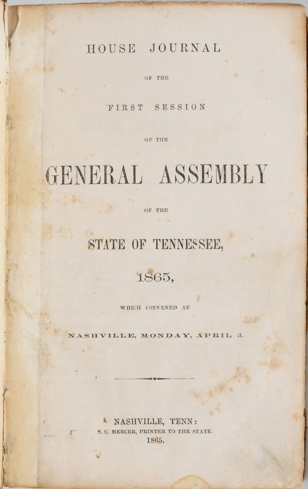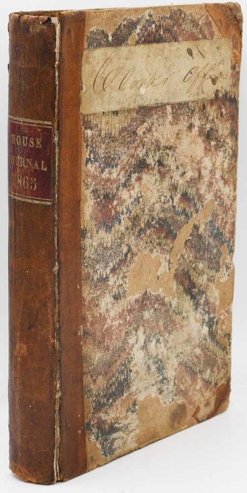 [LAW] HOUSE JOURNAL OF THE FIRST SESSION OF THE GENERAL ASSEMBLY OF THE STATE OF TENNESSEE, 1865, WHICH CONVENED AT NASHVILLE, MONDAY, APRIL 3 Title: [LAW] HOUSE JOURNAL OF THE FIRST SESSION OF THE GENERAL ASSEMBLY OF THE STATE OF TENNESSEE, 1865, WHICH CONVENED AT NASHVILLE, MONDAY, APRIL 3 Publication: Nashville, Tennessee: S. C. Mercer, Printer to the State, 1865 Edition: First Edition Description: Half Leather. 8vo.; in tan half-calf over well-worn marbled board; 316 pages, including the Alphabetical Index to House Journal 1865; [with] APPENDIX, Comptroller's Report; Report of Supervisor of Banks; Foreign Insurance Companies; Distribution of Charities; Report of the Condition of the Tennessee Penitentiary; Reports of the Trustees and Superintendent of the Tennessee Hospital for the Insane; Report of the State Librarian of the Senate and House of Representatives, 155 pages.~~The front joint is cracked; there is handwritten paper label on the upper board which appears to be contemporary: "Clerk's Office"; the front hinge reinforced with paper tape at the title page.~~An illuminating picture of life in the State of Tennessee in the months following its departure from the Confederate States.~~Very uncommon. Good binding. Seller ID: 298268 Black Swan Books Richmond VA We specialize in antiquarian books, classic literature, the Civil War, Viriginiana, travel, art, children's books, and other subject areas, including religion and philosophy . Terms Payment via PayPal is preferred. All orders ship within two [2] business days, Monday through Friday by standard mail, USPS Media Mail. Combined orders and expedited shipping is available. Please contact us for a shipping quote before ordering. All items are guaranteed as listed and described. Any item may be returned within 30 days for any reason in the condition is which they were sent. This listing was created by Bibliopolis.