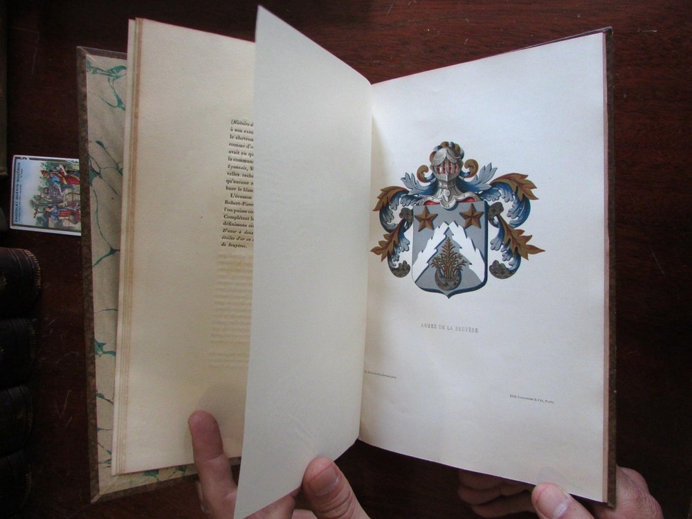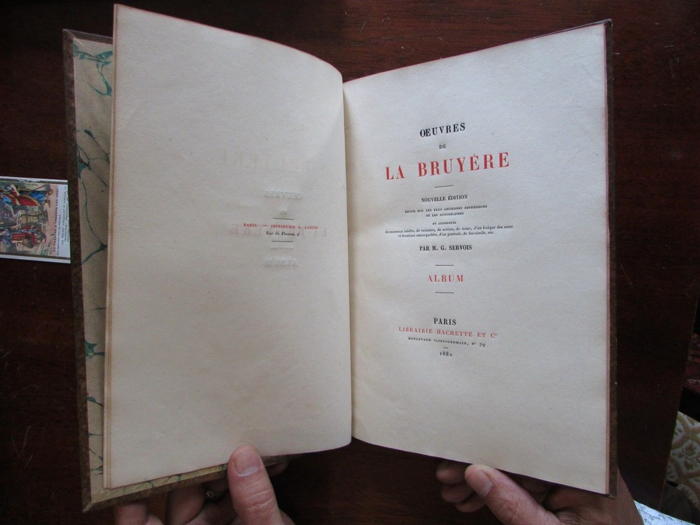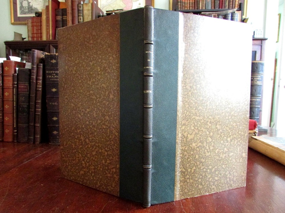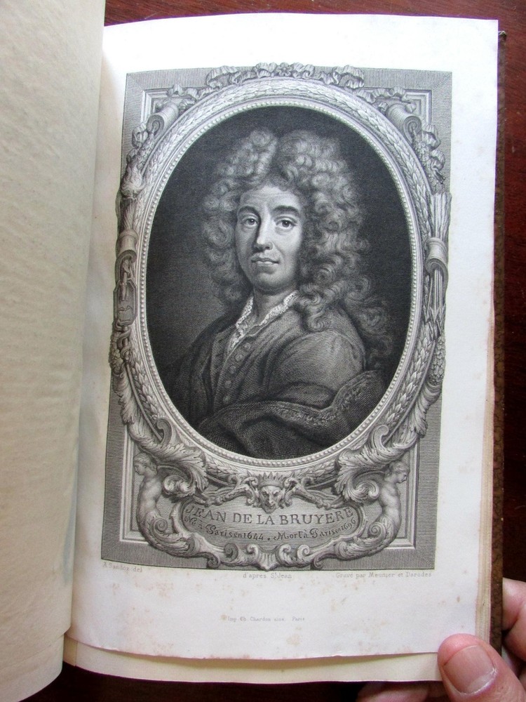 La Bruyere Album 1882 Servois illustrated leather plate book portrait La Bruyere Album 1882 Servois illustrated leather plate book portrait Click here to view a short video presentation. Short video captures condition much better than words. Please watch prior to purchase to ensure a clear understanding of the book. Oeuvres de La Bruyere , by M. G. Servois. Published 1882, Paris by Librarie Hachette et Cie. c. 50 pages. Period 1/4 leather binding, spine gilt lettered and ruled on raised bands, marbled covers and end papers, series of plate images with descriptive text. Lovely clean tight sound book, well preserved example. Period quarter leather binding, raised bands and gilt lettering on spine, marbled covers and end papers. Book measures: 10 3/8" H X 7" W. [V1823].