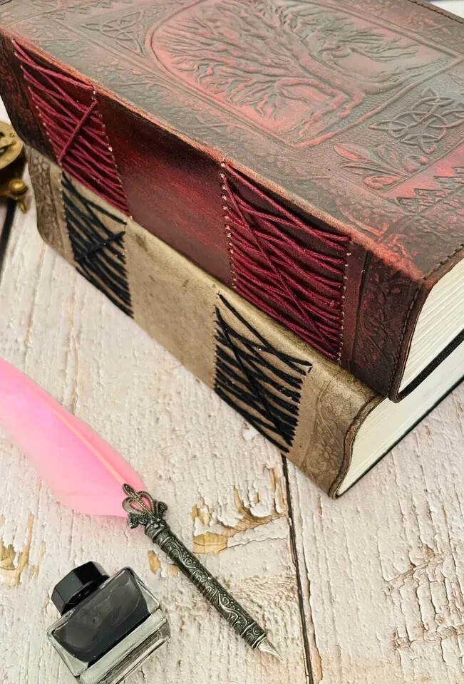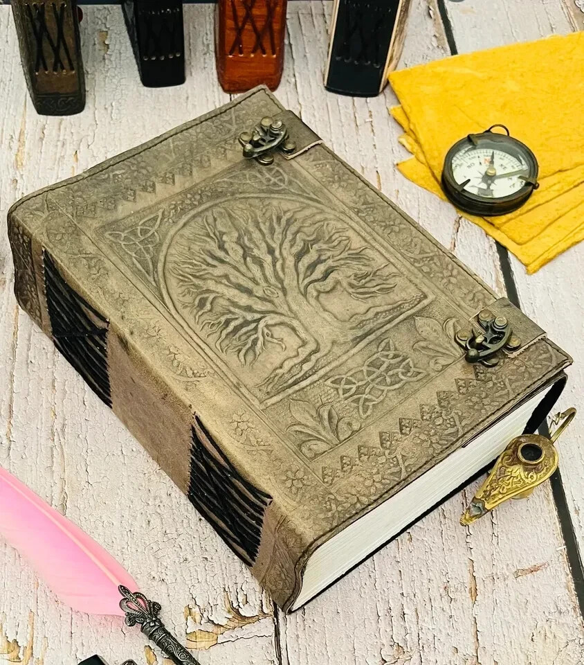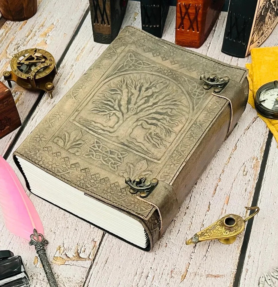 Style - Tree of life leather journal Color - Antique/black/Brown Page - 120 Sheets ( 240 pages counting both Side ) Lock - Brass C-lock Size - 10 x 13 inch / 7 x 10 inch This stunning leather journal is adaptable to use as a memory journal, sketch book, manuscript book etc. This embossing journal is adorned with detailed leather. It is perfect for classic calligraphy and scripting - a true conversation piece. Indulge yourself to write poetry, spill your heart and soul out onto the handmade fiber pages or use as Guest book / Instagram Photo book. Guest book: The blank handmade paper is very unique and perfect for guest/wedding book. Instagram Photo Book: It can also be used to show off your favorite Instagram images in this handmade leather book by using acid-free scrape booking adhesive or double-sided tape. Overall Length: 13 by 10 inches Pages: 600pages (counting both sides) Paper Type: Handmade paper Cover: Genuine Cow Hide Leather with Leather Metal Closer Design: Detailed Tree of Life Embossed and leather Whether you’re a mom balancing a family with tons of appointments, a business professional who needs to remember details meetings, or you just want to keep your notes and thoughts collected, this Leather Journal comes with all the style, comfort, and versatility you need to be at your best The leather is produced using traditional methods which allows it to retain its character. This means that each journal is unique and comes with its own set of beautiful creases, bumps and marks that develop with age into something truly special. The leather is protected with natural oils to give it a lovely rich finish .