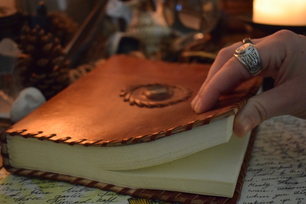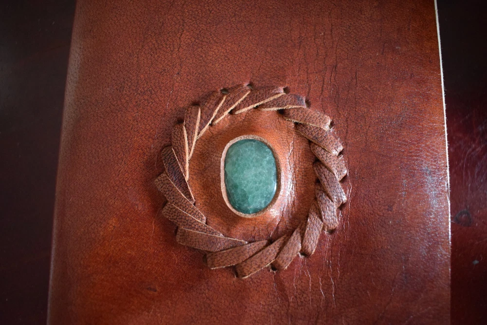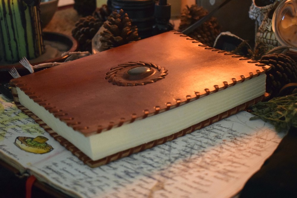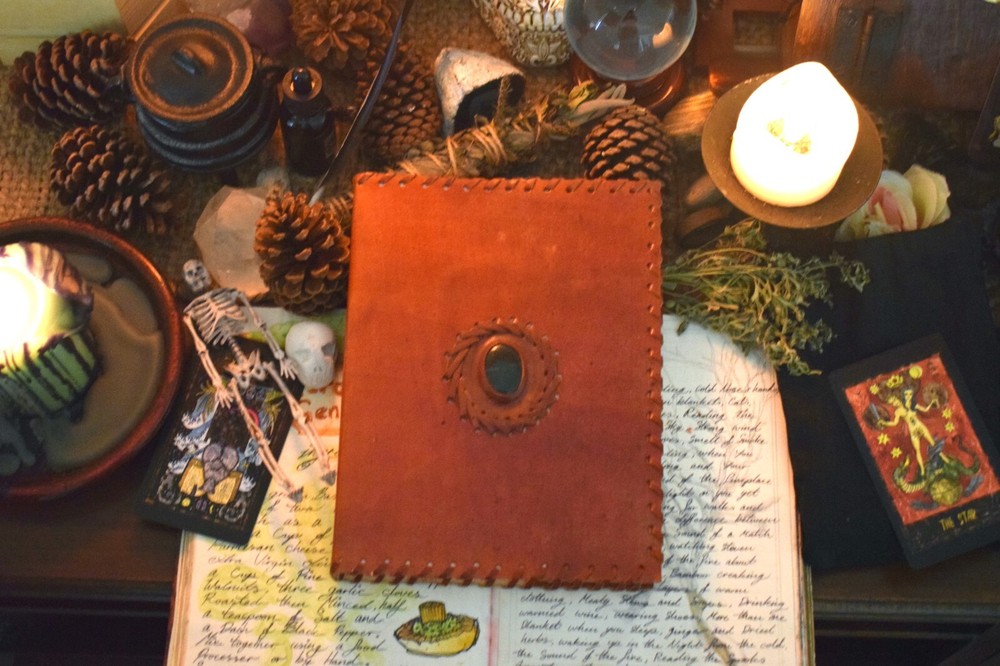 The beautiful crystal on this 25.5 x 18cm leather-bound book is a bloodstone. Use this powerful stone for preventing jealousy, healing a broken heart, increasing courage, predicting the weather, calming anxiety, granting good luck in legal battles, and sharpening the creative mind. The genuine, pure leather that covers this book also has magickal symbolism. Leather is connected with protection and healing. It symbolises the strength and guarding of valuables, making this book the ultimate witch's diary. This Book is an essential magick tool. Enjoy! Why have your Grimoire Blessed? Blessing by our P riestesses is optional. Blessing includes the infusion of our mantra "Always to help. Never to harm", anointed with Moon water and sacred essential oils charged by the elements. This blessing means your grimoire is no longer an ordinary item. The Beckoning Broom P riestesses' magic breathes life into the grimoire transforming it into a powerful tool. With our blessing, the grimoire will be significantly more potent for anyone using the grimoire. Our blessing gives it power and divinity of its own. Your Grimoire Details Size of Grimoire Height: 23.5cm ( 9 ¼") Width: 18cm (7 ¼") Depth: 3.5cm (1 ½") Contains: 1 Leather-bound Grimoire