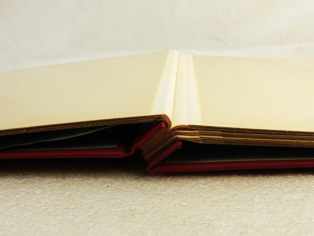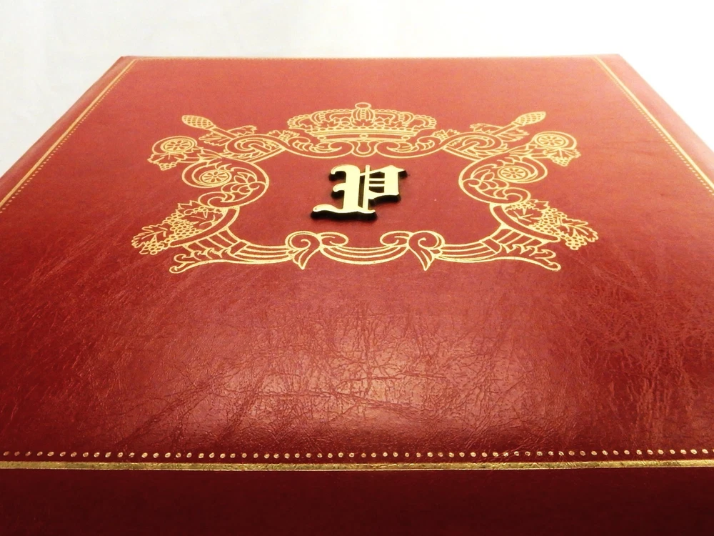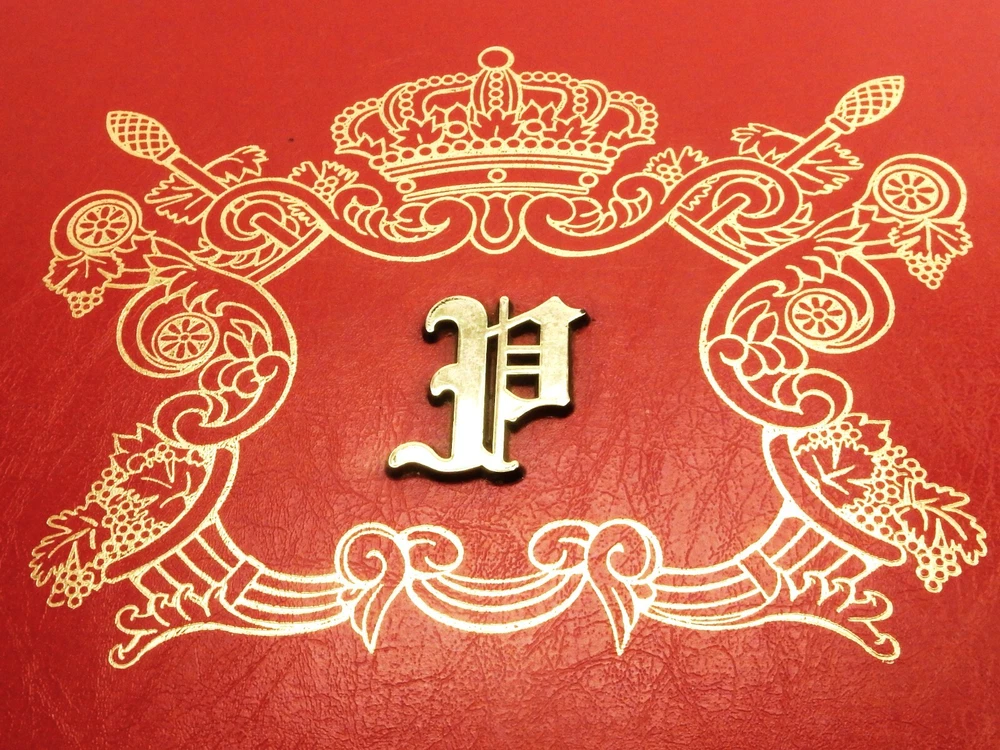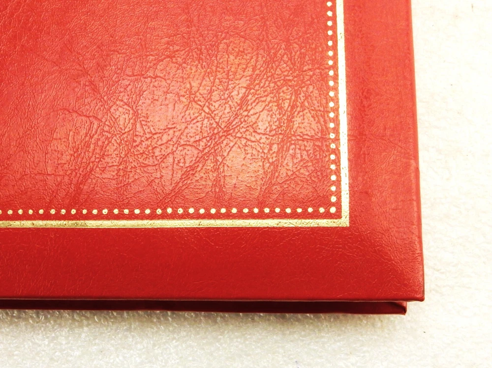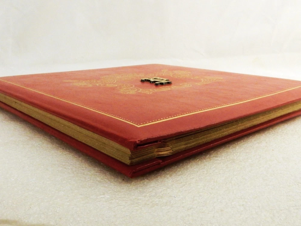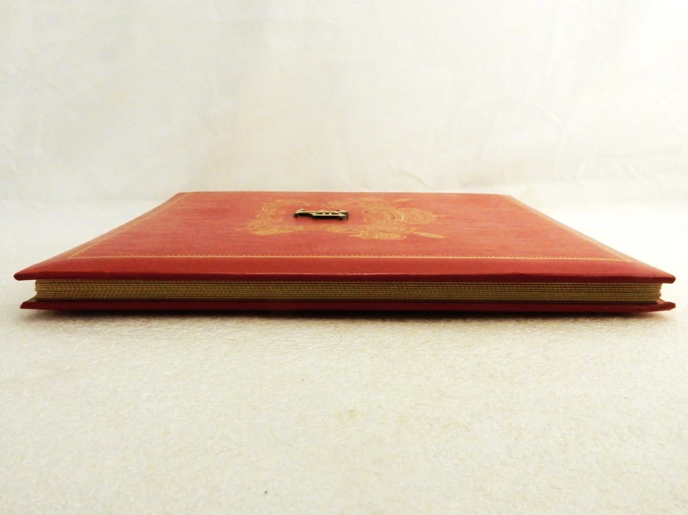 Large Photo Album w/Monogram "P", Red w/Gold Coat of Arms, 10 Leaf/120 Photos Measures approximately 12" x 12" x 1" thickness Contains 10 double side leaves, 20 pages total Each page can hold six standard size photo prints, 120 pictures total capacity Photos adhere to cardboard page and protected by peel and seal covers Monogrammed with applied letter "P" in center of gold generic coat of arms Excellent for creating a scrapbook or event memorial book In very good unused condition with no visible signs of damage or repair In stock and ships direct from our Ohio antique warehouse