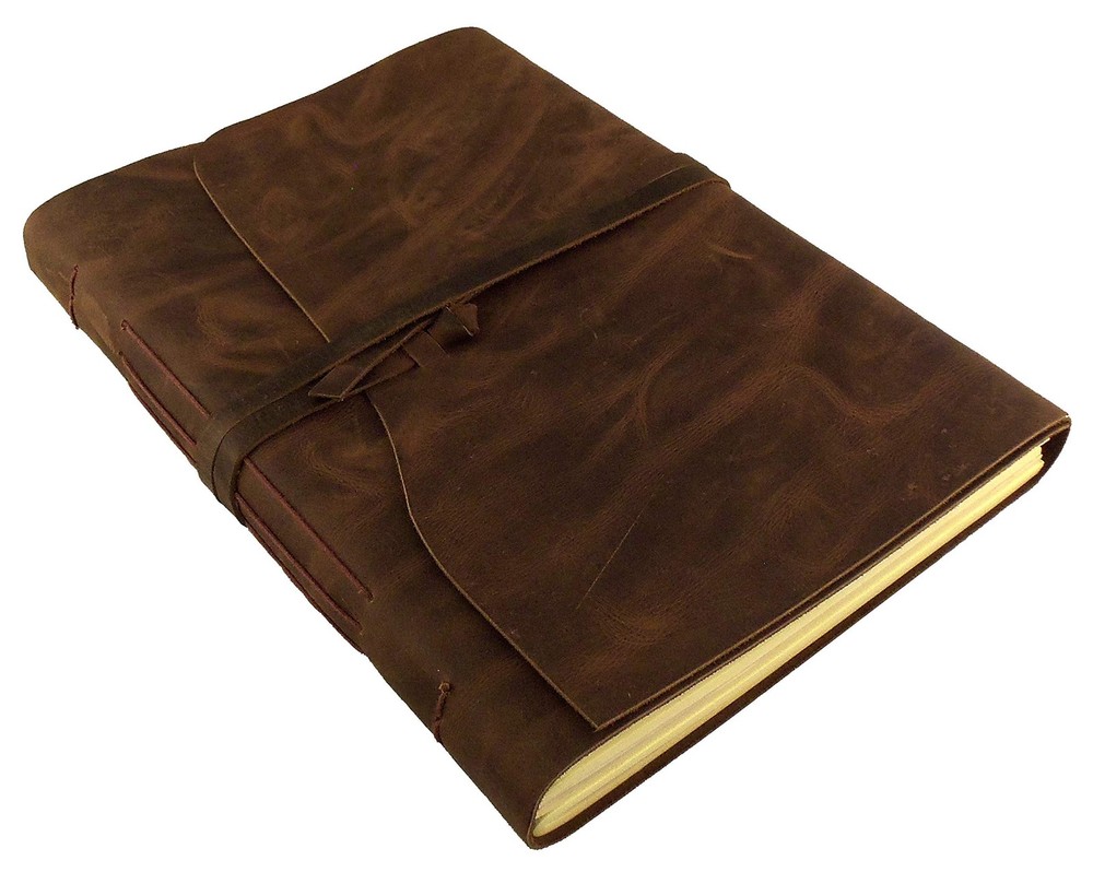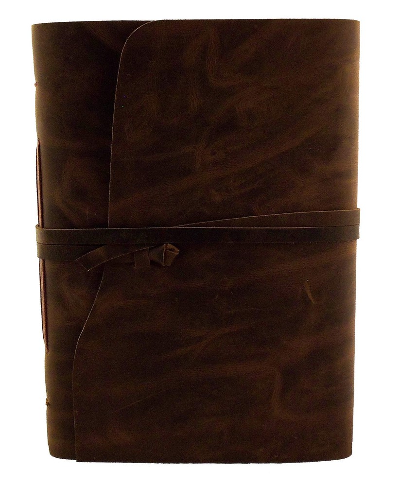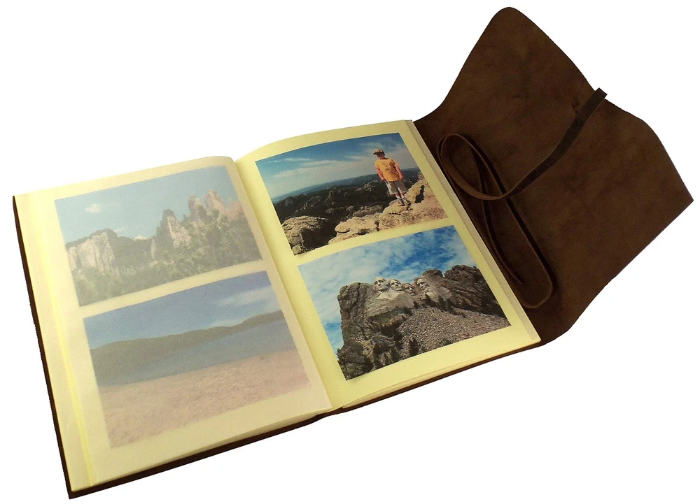 This large leather photo album by is the perfect way to store and present your photos with style and class. The dark brown leather cover is made from high quality leather that not only looks great, but will last for years to come. The leather photo album holds a full 200 4x6" or 5x7" photos. It will also hold up to 100 8x10" photos. This Large Leather Photo Album gives a uniquely classic look, style, and feel that you will not find in a modern style photo albums. Natural variations in the leather make each journal a one of a kind, and adds to the unique character of each one. This is a scrapbook style photo album. The cream colored pages are traditional acid-free cardstock with a semi-transparent sheet between each page, allowing you to attach photos to both sides of the pages. This leather photo album makes a perfect unique gift for the person in your life who seems to have everything , or you can buy it for yourself. Either way, you will be pleasantly surprised with the look, style, quality, and class of this hand made leather photo album by . Large Genuine Leather Photo Album with wrap tie closure by . Hand made using high quality leather and acid-free cardstock paper. **Photo mounts required.** Traditional cardstock pages with semi-transparent sheet between each page. Contains 100 pages (50 sheets) of cardstock pages. Holds 200 4x6" or 5x7" photos. Album size: 12"L x 9"W - Page Size: 11.5"L x 8"W - Gift box included Very stylish and classy way to store and present your photos. Makes a great gift.