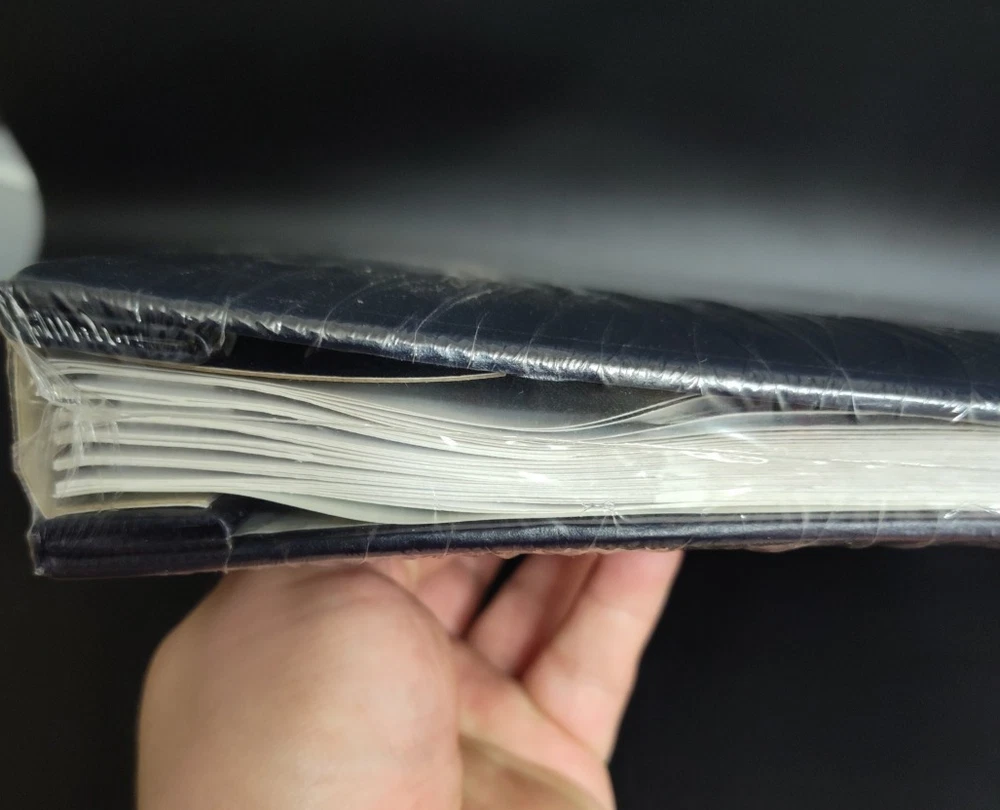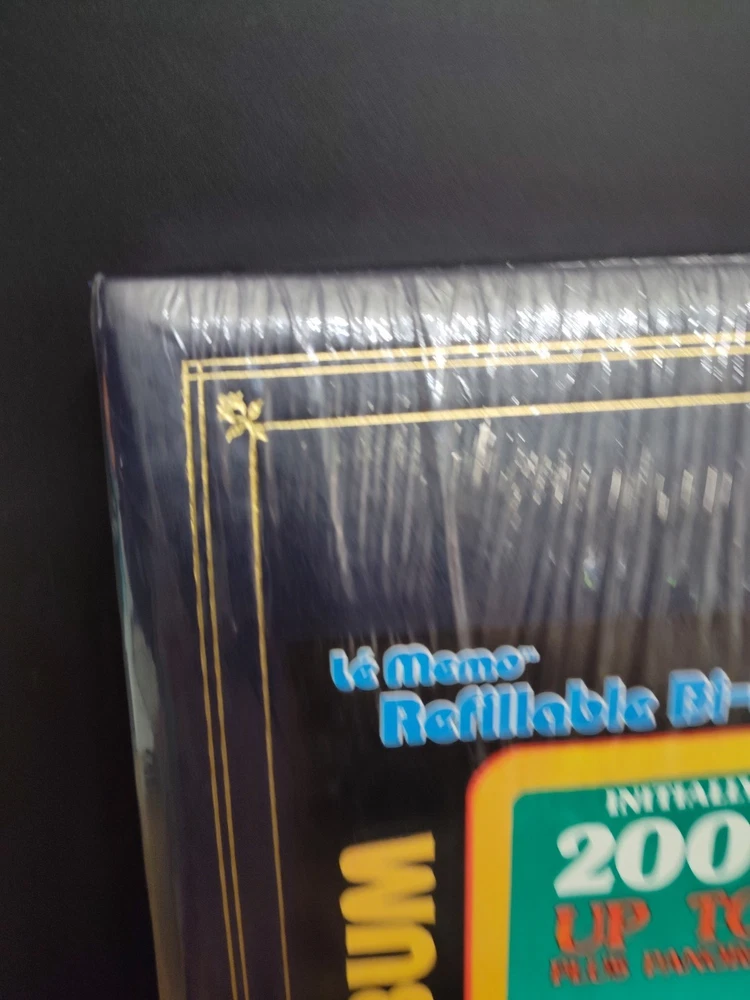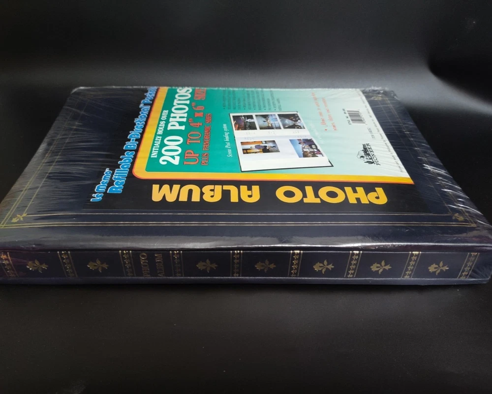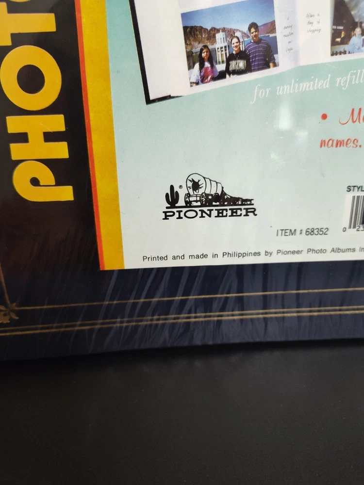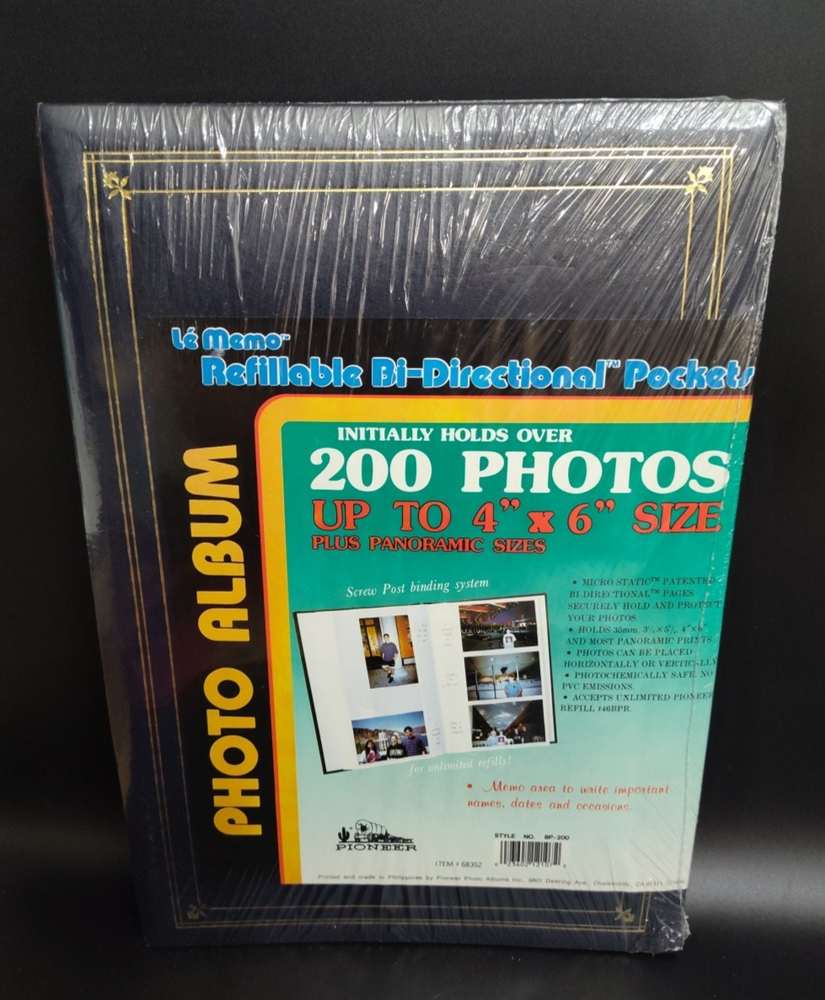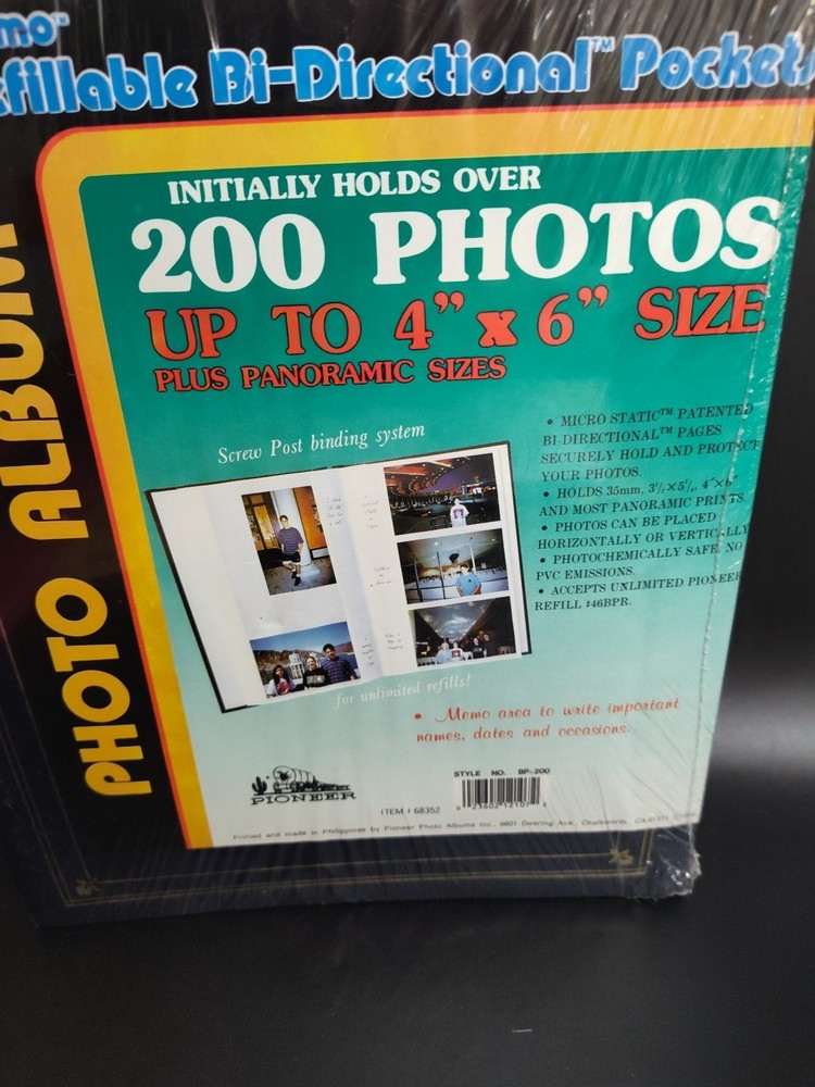 This photo album is new and sealed. The plastic seal does have a small hole in right bottom corner. The Pioneer Le Memo Photo Album Features: Micro Static Patented Refillable Bi-Directional Pockets to securely hold and protect photos The ability to hold over 200 photos The ability to hold photos up to 4 x 6 size PLUS Panoramic Sizes Screw Post Binding System Memo area for writing notes, etc.