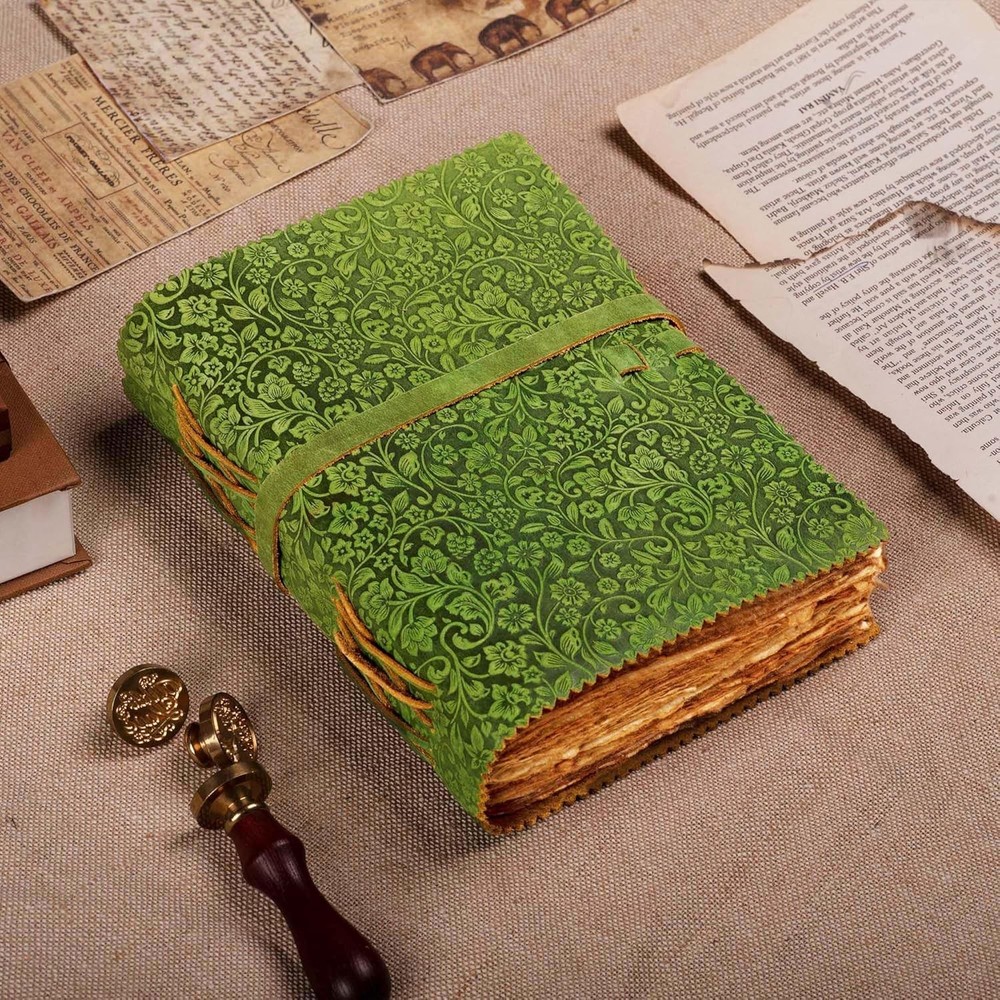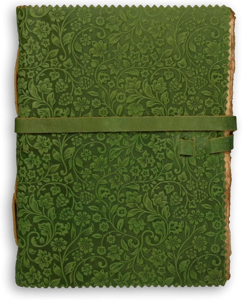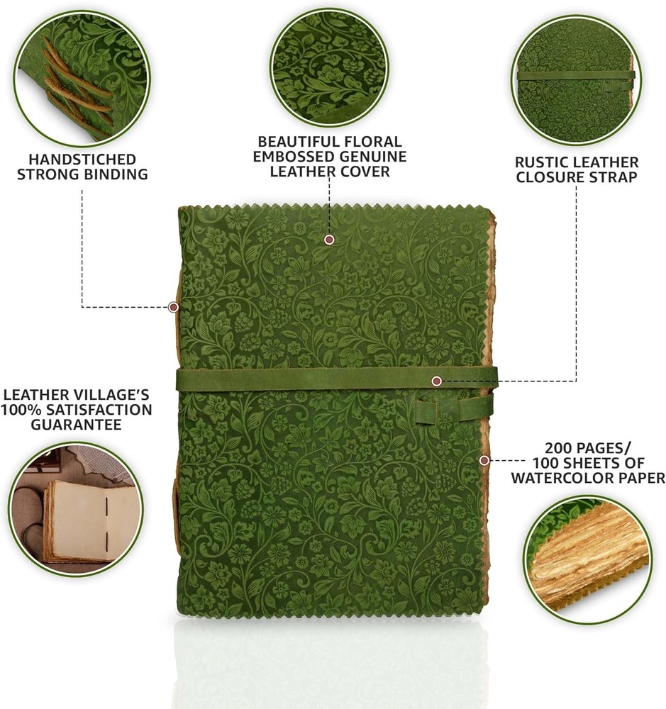 LEATHER VILLAGE Leather Bound Floral Embossed Journal 6"X4", Green Product Details Manufacturer: VIOM CREATIONS Brand: LEATHER VILLAGE Item Weight: 8.8 ounces Product Dimensions: 6 x 4 x 1.5 inches Item model number: FLoral Color: Green Cover Material: Leather Number of Items: 1 Size: 6"X4" Ruling: Plain Sheet Size: A6 Manufacturer Part Number: Green-Floral-VintagePaper-6X4_+ Brand: LEATHER VILLAGE Color: Green Theme: Book Sheet Size: A6 Pages: 200 Pages Cover Material: Leather Style: Vintage Embossed Leather Journal Ruling Type: Plain Special Feature: Soft cover Number of Items: 1 Genuine Leather Journal: Luxurious full-grain leather cover, naturally tanned for an authentic feel. Embrace the craftsmanship with this durable, Floral embossed leather notebook, ideal for writers, travelers, and journal enthusiasts seeking a premium writing experience. Handcrafted Paper: 200 pages of thick, handmade cotton paper, suitable for all pens and paints. Acid-free, smooth, and no-bleed, perfect for writing, sketching, Watercolors, doodle, and painting, enhancing the creative process for artists and writers. Sturdy Binding: Secure hand-stitched leather binding with a classic leather belt closure ensures your notes and drawings remain intact. Reliable and robust, this journal is a trusted companion for daily reflections, sketches, or as a travel diary. Perfect Gift: A thoughtful and lasting gift for any occasion - birthdays, graduations, or holidays. Ideal for students, Artist, creative minds, and anyone who appreciates the art of journaling. A versatile and cherished gift that inspires creativity and captures memories.