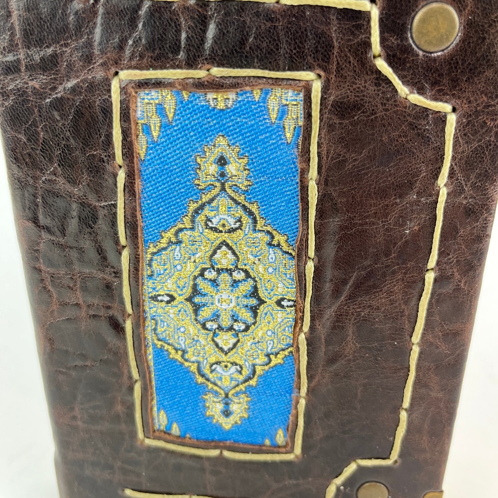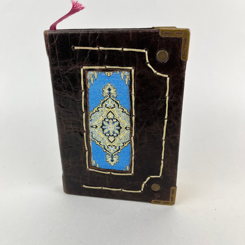 <![CDATA[<div>This small journal, sketch book, is about 6.5" x 4.5" and has approximately 90 and 100 pages. Wrapped in dark brown leather with cream color stitching and brass corners. It has an embroidered fabric inset on the cover.