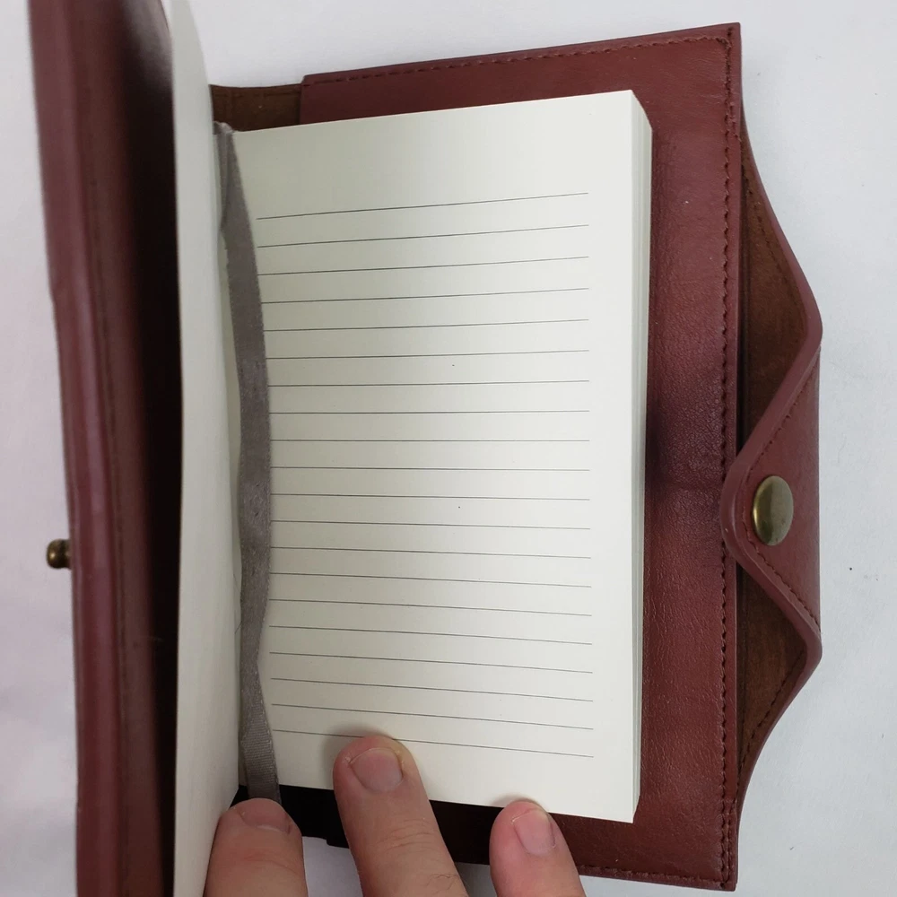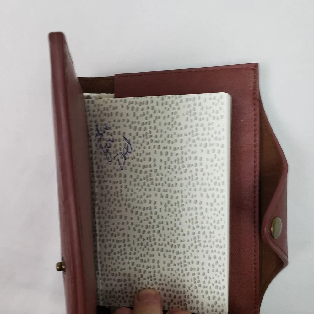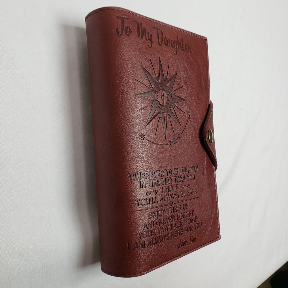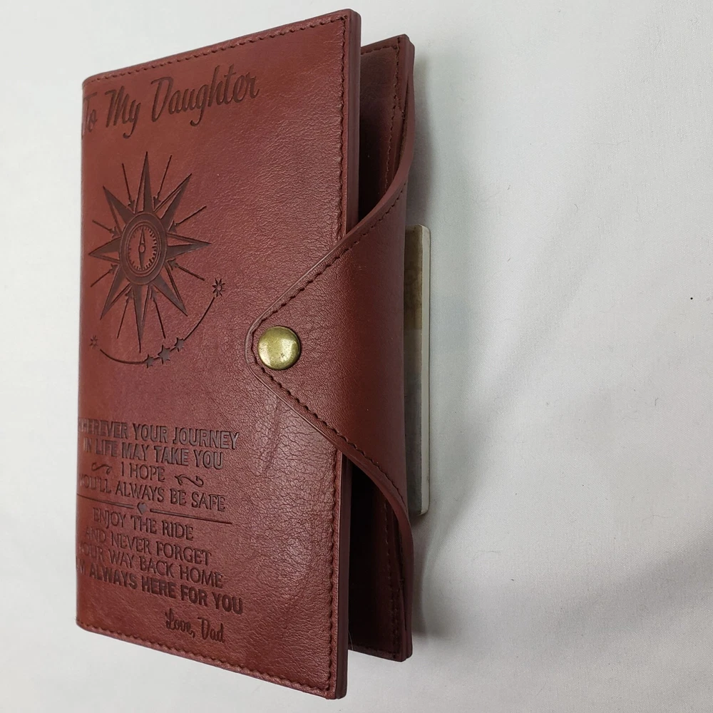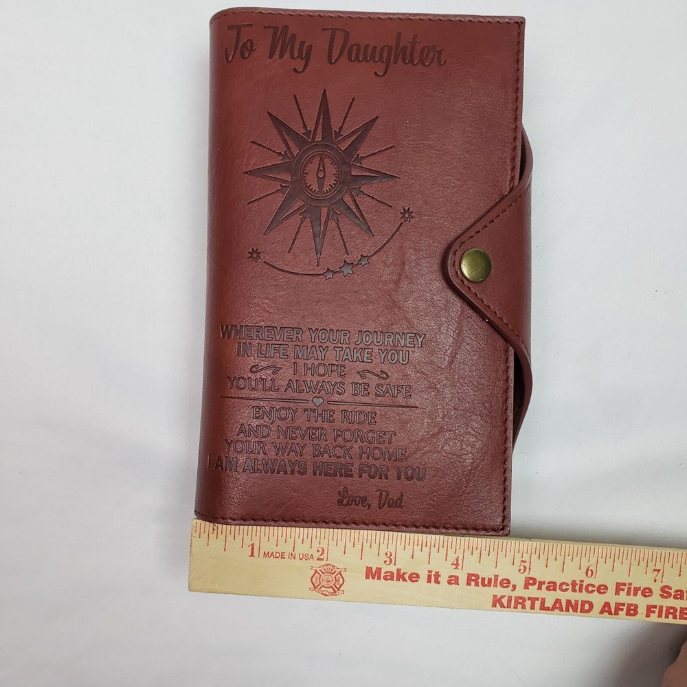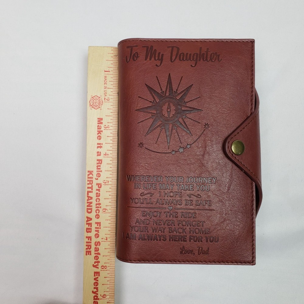 Leather Bound Notebook Journal To Daughter From Dad 7.5" x 4.5" Brown EXCELLENT CONDITION!!! No defects or damage found (see photos). There is writing on the first page, "Love you, Dad" that can be removed or a sticker placed over if desired. YES! We give discounts on bundles! Message us, we will happily create a custom bundle of your choosing at a great price. Our goal is to provide you with quality products and exceptional service. We take pride in our shop rating. When you receive your order, please be so kind as to leave us a positive rating and feedback. We are more than happy to do the same for you. If you have a problem with your item or feel that you cannot provide positive feedback, please contact us prior to posting feedback so we can do everything in our power to ensure your satisfaction.