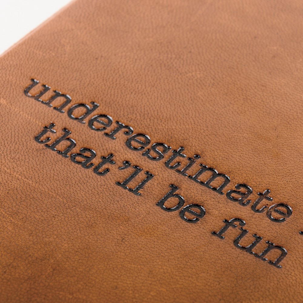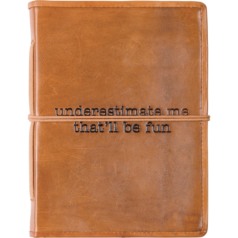 A high-quality leather bound journal from our Desk Stationery Collection featuring a debossed typeset "Underestimate Me That'll Be Fun" sentiment on the front cover. Our Underestimate Me That'll Be Fun journal includes 96 unlined pages. Artist: Primitives by Kathy Materials: Leather, Paper Dimensions: 5.50" x 7.50" x 1" UPC Code: 190134116873