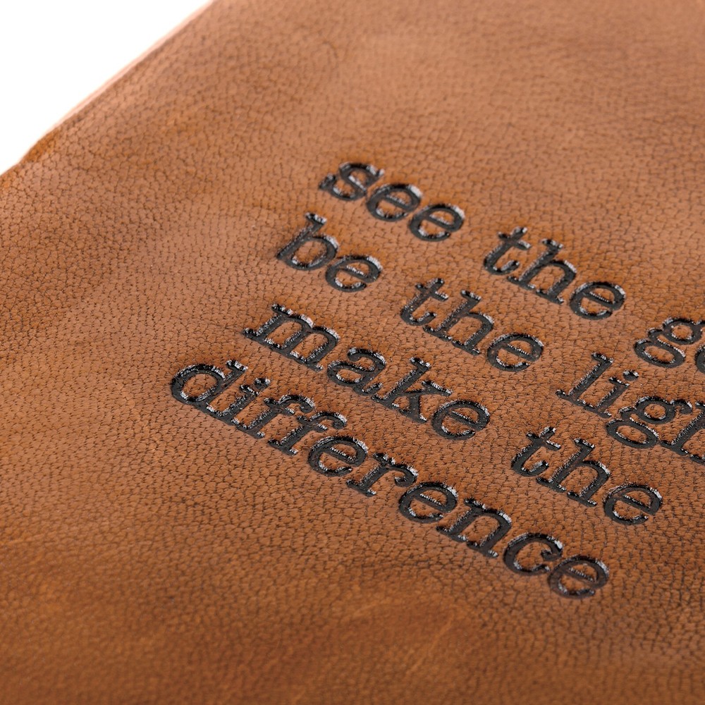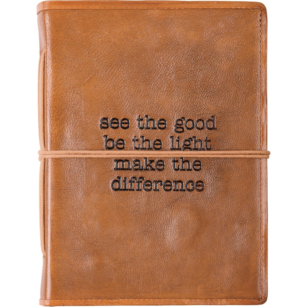 A high-quality leather bound journal from our Desk Stationery Collection featuring a debossed typeset "See The Good Be The Light Make The Difference" sentiment on the front cover. Our See The Good Be The Light journal includes 96 unlined pages. Artist: Primitives by Kathy Materials: Leather, Paper Dimensions: 5.50" x 7.50" x 1" UPC Code: 190134116828