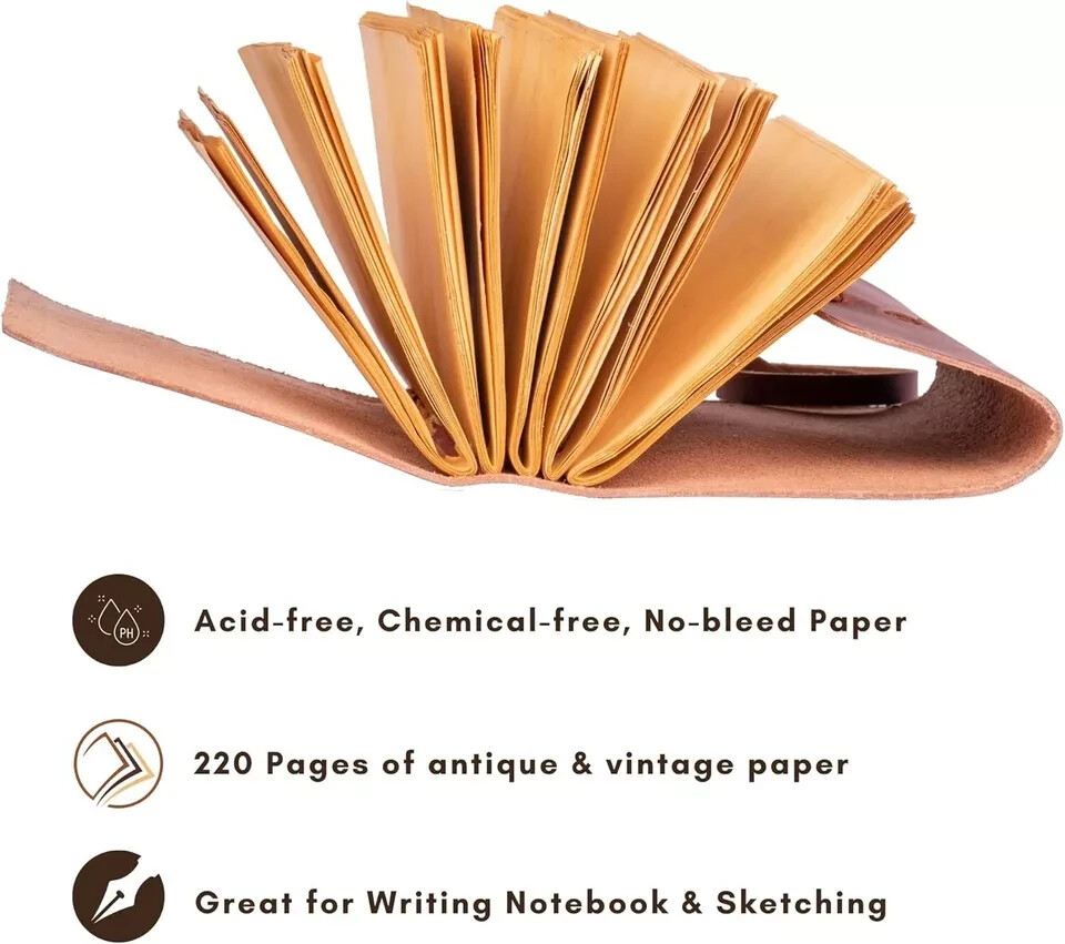 If you're looking for a quality leather journal crafted to last or a perfect gift for that special someone, you've hit the jackpot! Every journal we make is custom made to order and crafted with genuine full grain leather our exquisite Leather Journal Diaries with Deckle Edge Vintage Paper and complete with stunning designs on the cover Each diary is expertly handcrafted using high-quality leather, ensuring durability and longevity. Shree Handcrafts journals feature deckle edge vintage paper. ✦ Manufacturer : Susadesignin ✦ Leather – Best Quality Genuine Leather ✦ Soft Natural Handmade Leather Cover ✦ Bronze lock closure ✦ Color – Wine (Blackberry) ✦ Paper - Handmade Vintage/Antique Deckle Edge Paper ✦ Size - 7 x 5 Inches ✦ Pages - 200 Pages both side ✦ Material -- Leather Cover, Handmade Vintage Plain Paper, leather strap lock closer ✦Care Instructions: Wipe clean with a dry cloth. ✦ Antique Paper - Vintage Journal is made of unique vintage paper which looks like it was pulled from history. You will love the old looking handmade cotton paper. which is unique to our vintage journals. ✦ Sturdy Binding, Leather Wraparound And Key - Sturdy hand stitched binding to make sure that no paper comes out loose. The leather wraparound with a cute key that slips in will make sure that the papers inside the journal are safe and secure. ✦ Sketchbook is great for keeping by the bedside to jot down dreams, or for use as a diary or journal. ✦ It is a truly unique and wonderful gift for a friend, the men, women, and wiccans in your life! or to treat yourself to as a special keepsake ✦ our journals are influenced by symbolism that is derived from the Wicca/Pagan community, creating a personalized space where your inner creative genius can flourish. ✦ The paper is made from sustainable cotton and jute canvas. The paper is acid-free and pH neutral therefore is a timeless piece of art. ✦ Use Any Kind Of Pen - Sketch, Doodle, Write on your journal notebook with a Calligraphy Pen Fountain Pen, Brush Pen, Ball Pen, Acrylic Colors, Watercolor and many more.