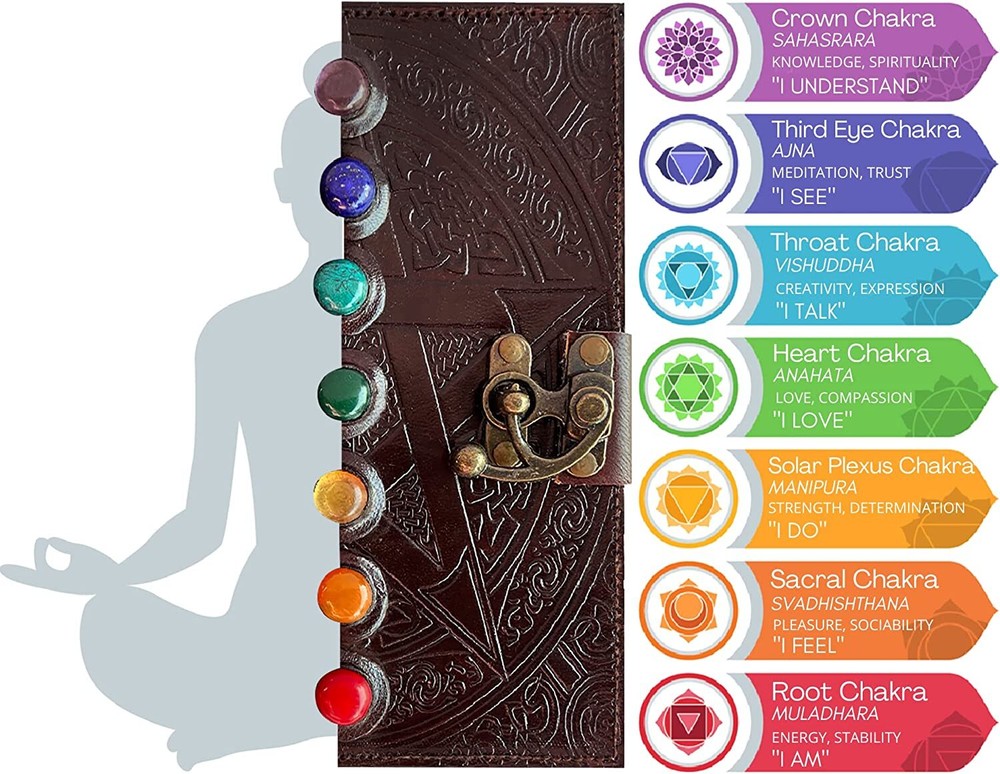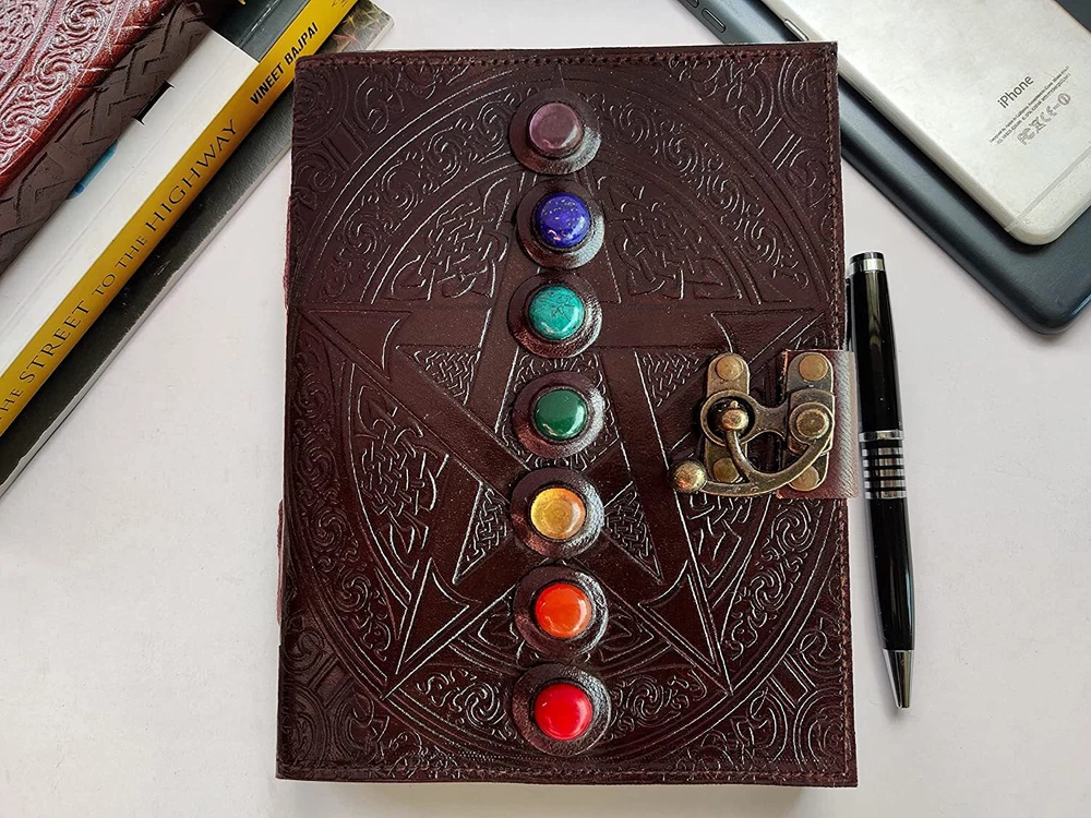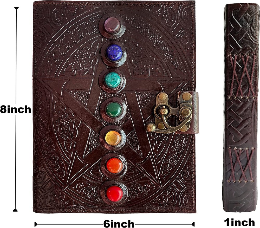 ? USA SELLER???? GENUINE DURABLE LEATHER:- Soft & Supple Designer Brown Top Grain Leather with a real leather scent. This journal is made of the finest aged leather, it's a special keeper of your dreams, designs & thoughts. ? NON BLEEDING ECO-FRIENDLY COTTON-MADE PAPER (UNLINED): 200 pages (counting both sides) handcrafted paper manufactured using Cotton Bio-Mass. Which are also acid-free. Any kind of ink pen and pencil can be used on this paper. ? PERFECTLY SIZED FOR MULTI-PURPOSE USE: Length 6", Width 1", Height 8" inches, this easy to carry personal diary is perfect to use as a health journal, sketchbook, and poetry journal. It?s an ideal journal which records your daily thoughts and life lists. And also good for designing, doodling, or Calligraphy of your choice. ?EMBOSSED WITH A SEMI-PRECIOUS STONE:- This journal is embossed with 7 special stone which helps to Encourage self-awareness, allows self-expression, and reveals inner truth within yourself. ? BEST GIFT FOR YOUR COMPANION: A journal is like a trusted friend. You can use it to solve queries, get inventive, or record valuable memories for them to last forever or you can just use it as a gift for your wife, son, or a daughter or for some enthusiastic writer in your family. Even for a Harry Potter fan looking for a miraculous spell book or a D&D Gamer looking for his quest book.