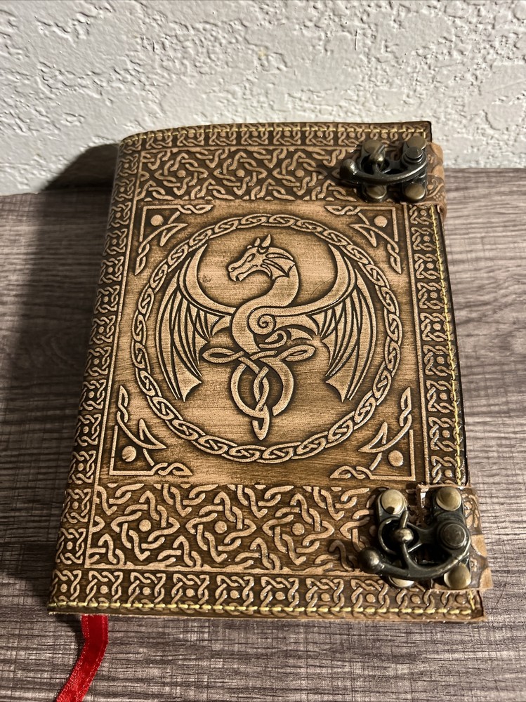 This leather bound journal is a must-have for anyone who loves to jot down their thoughts and ideas. The stunning dragon design on the cover adds a touch of mystique, while the metal enclosure ensures that your pages stay safe and secure. The cover material is high-quality leather, which gives it a rich and luxurious feel. If you're in the market for a new journal, this one is perfect for you. Whether you're a writer, artist, or just someone who likes to keep a record of their daily life, this journal is sure to inspire. So why wait? Treat yourself to this beautiful journal today!