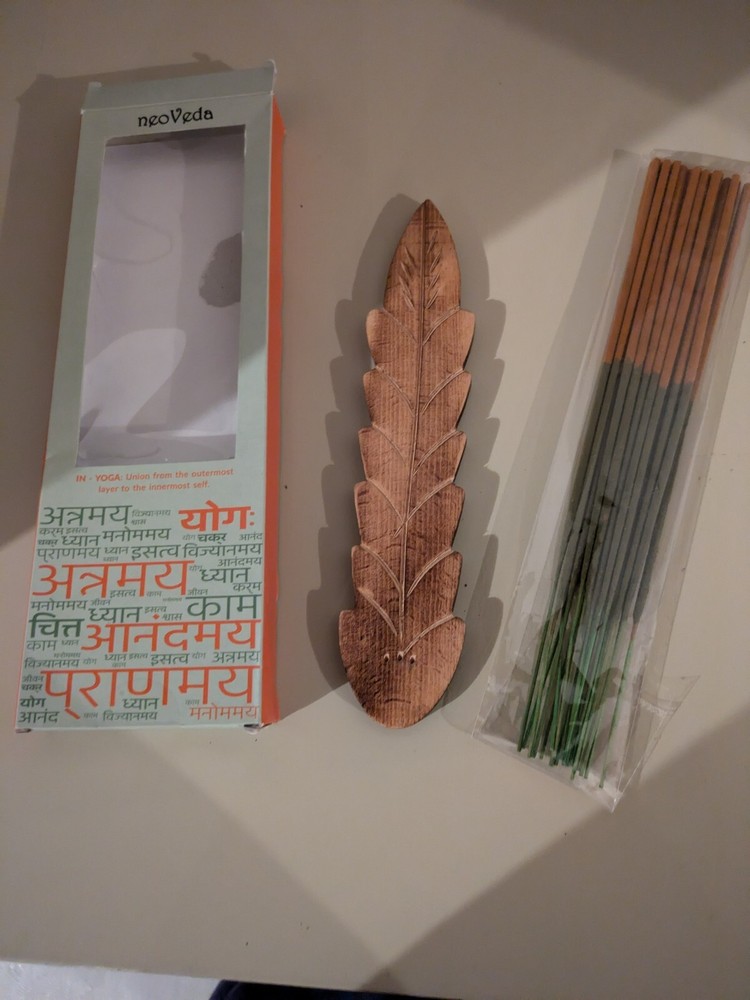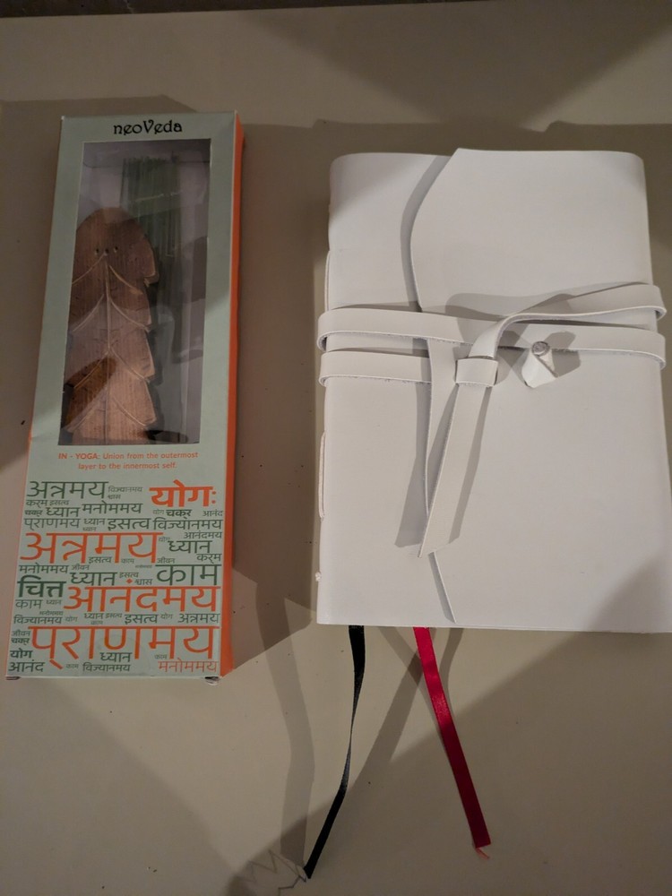 Autumn is the perfect season for quiet reflection. We reflect the seasons within ourselves. Just as nature is settling in for its time to rest and rejuvenate, so do we. This offering of a leather bound journal and calming incense offers us the tools with which to do so. The aromas on the sticks invite us to still our mind and thoughts and enter into a peaceful state. The journal is there for us to record our thoughts, hopes, and dreams. It's a very peaceful way to spend time on a cool, rainy Autumn day. The journal has a leather cover and tie closure. It measures 8 1/2" x 6" closed. It contains a generous amount of pages, which measure 8 1/4" x 5 1/2". The incense holder is made of wood and measures 9" L x 1 3/4" W. The incense sticks have fragrances of Sandalwood and Musk on each and measure 10" L.