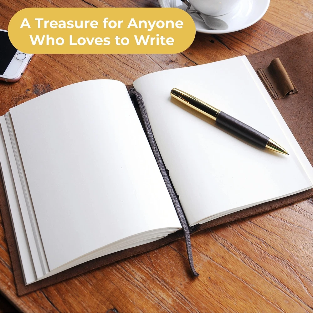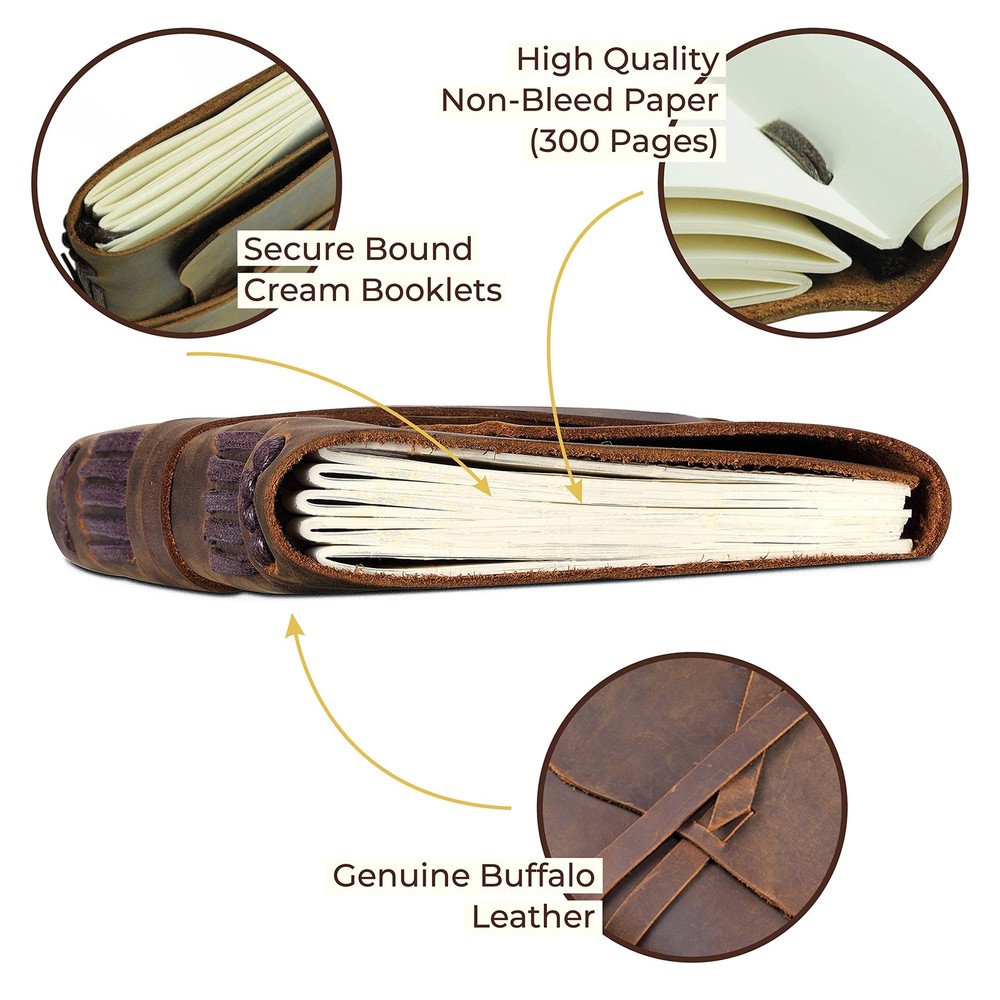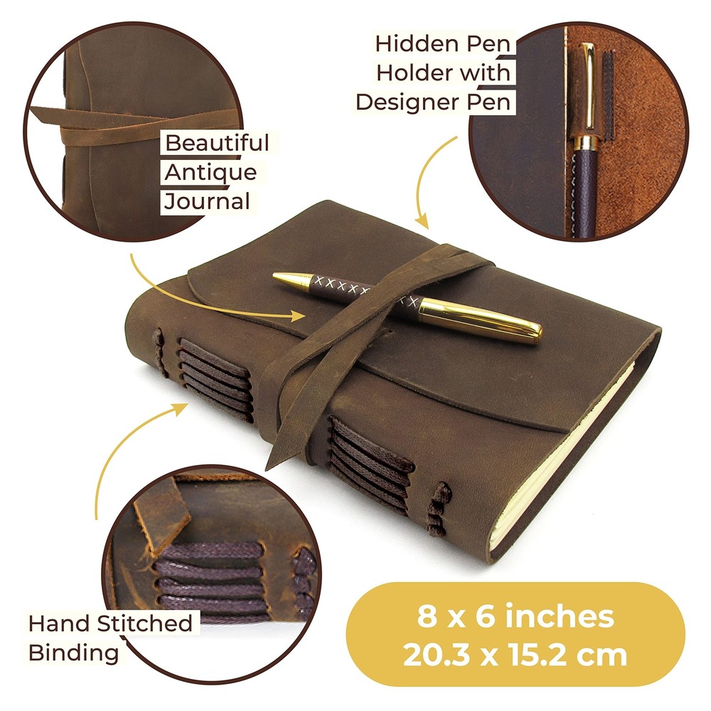 Leather Bound Journal for Men and Women, A5 Handmade Journal Gift Set with Antique Notebook and Stylish Pen, Vintage and Classic, Sketchbook, Planner and Diary (300 Pages) (8x6") ✓ Free 60 Day Returns ✓ Free Express Shipping Description: Features: UNIQUE GIFT SET: Handmade leather journal with beautiful front soft cover with matching designer pen, hidden pen holder and jute bookmark. Presented in an eco-friendly recycled box. A timeless gift for someone special who loves to write. PREMIUM LEATHER: Crafted with delicate yet super tough buffalo leather, including a long strap that secures the journal firmly. Our genuine leather is thicker than competitors and offers lifetime durability with lasting softness. RUSTIC DESIGN: Achieves a unique and distressed look when scratched and features decorative stitching for added charm. Coated with special natural oils that make handling a joy. Plus, it has a wonderful authentic leather smell that inspires you to write daily. QUALITY CREAM PAPER: 300 premium unlined multipurpose sheets for notes, daily plans, sketches, inspiring ideas, memories and more. Zero bleed through with fountain pens. Not refillable. PERFECT SIZE: 8x6" made to suit a wide range of writing styles. We also offer many other sizes and styles of journals, including refillable journals. There's something for everyone! Your purchase helps families in Africa as we donate part of our profits to Afrinspire charity Product Details: Brand: Sovereign-Gear Color: Antique Brown Theme: Book Sheet Size: A5 Pages: 300 Cover Material: Leather Style: Vintage Ruling Type: Plain Special Feature: Pen Holder Number of Items: 1 Manufacturer: Sovereign-Gear Brand: Sovereign-Gear Item Weight: 15.2 ounces Product Dimensions: 8.46 x 6.69 x 1.97 inches Is Discontinued By Manufacturer: No Color: Antique Brown Cover Material: Leather Number of Items: 1 Size: 8" x 6" Ruling: Plain Sheet Size: A5 Manufacturer Part Number: SG-AJ-8x6 Date First Available: June 19, 2018