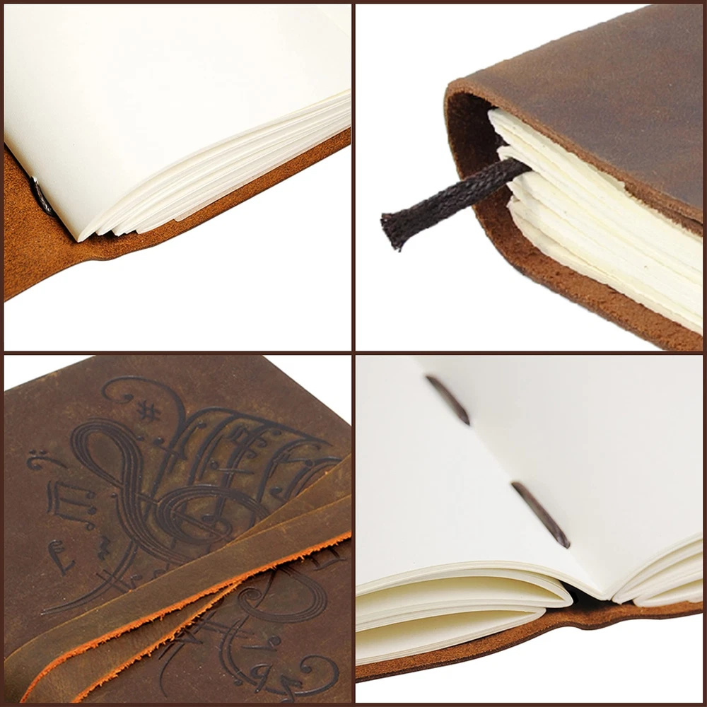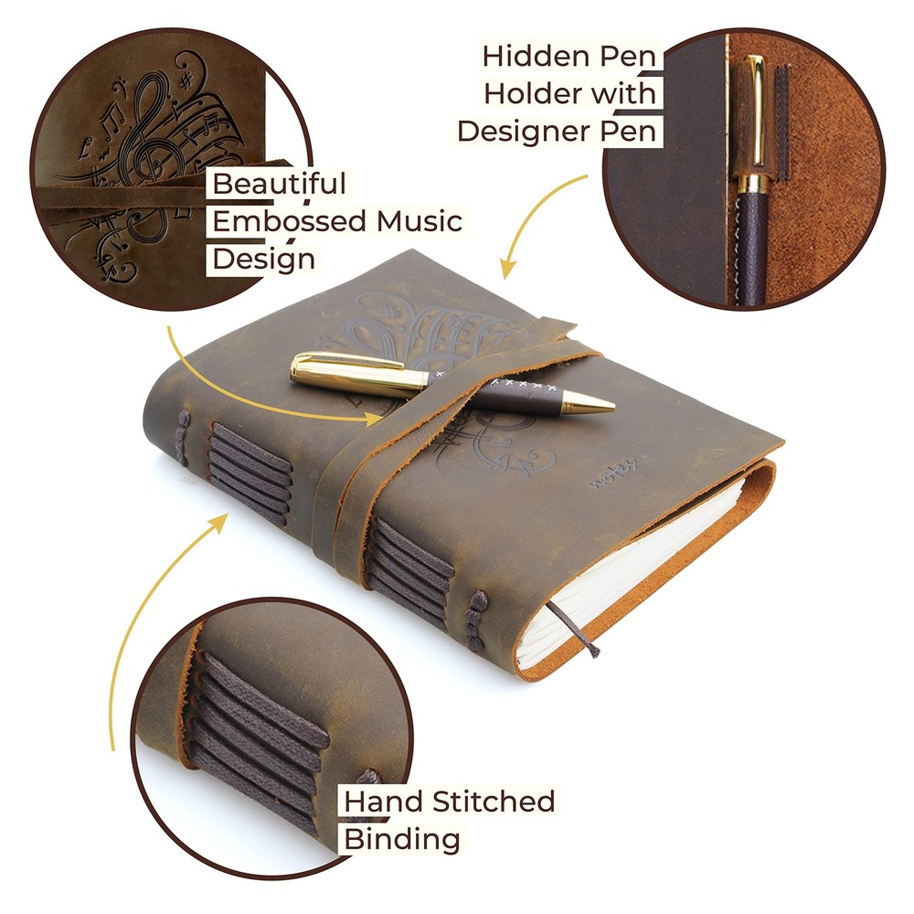 Leather Bound Journal for Men and Women, Handmade Gift Set with Music Notes Embossed Journal and Stylish Pen, Vintage and Classic, Notebook, Sketchbook, Planner and Diary (300 Pages) (8x6") ✓ Free 60 Day Returns ✓ Free Express Shipping Description: Features: UNIQUE GIFT SET: Handmade leather journal with beautiful Music Notes embossed front soft cover with matching bookmark, designer pen and hidden pen holder. Presented in an eco-friendly recycled box. A timeless gift for that special someone who loves to write. PREMIUM LEATHER: Crafted with delicate yet super tough buffalo leather, including a long strap that secures the journal firmly. Our genuine leather is thicker than competitors and offers lifetime durability with lasting softness. RUSTIC DESIGN: Achieves a unique and distressed look when scratched and features decorative stitching for added charm. Coated with special natural oils that make handling a joy. Plus, it has a wonderful authentic leather smell that inspires you to write daily. QUALITY CREAM PAPER: 300 premium unlined multipurpose sheets for notes, daily plans, sketches, inspiring ideas, memories and more. Zero bleed through with fountain pens. Not refillable. PERFECT SIZE: 8x6" made to suit a wide range of writing styles. A percentage of our profits go to Afrinspire - a not-for-profit organization that helps educate and provide local facilities to African communities. Product Details: Brand: Sovereign-Gear Color: Antique Brown Theme: Music Sheet Size: A5 Pages: 300 Cover Material: Leather Style: Music Ruling Type: Ruled Special Feature: technical drawing, sketching, doodling, to-do or shopping lists, puzzles, diagrams, plans, maps, notebooks for men rock and roll journal for men, tune opera jazz soul music melody writing notebook, dad grandad medieval man woman girl grandmother grandma, field notes, task list, memo book, art, goals, pop star, journaling, letters, planning, reminders, travel notes, creative writing composition, diary entries, men, women, seniors, unisex children, travel, journeys, holidays, indoor outdoor, business gifts, musician music lover record music upload music, writers, poets, journalists, journalers, scribes See more Product Dimensions: 8"L x 6"W x 0.15"Th Manufacturer: Sovereign-Gear Brand: Sovereign-Gear Item Weight: 1.45 pounds Product Dimensions: 8.46 x 6.69 x 1.97 inches Item model number: SG-Music-Journal-8x6UK Is Discontinued By Manufacturer: No Color: Antique Brown Cover Material: Leather Material Type: genuine leather, real leather and high quality thick paper Number of Items: 1 Size: 8 inches X 6 inches Ruling: Ruled Sheet Size: A5 Manufacturer Part Number: SG-Music-Journal-8x6 Date First Available: March 26, 2020