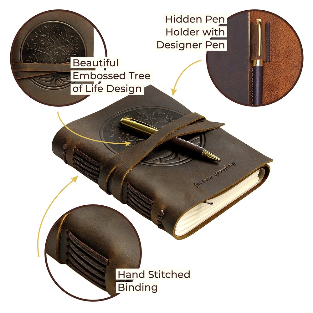 Leather Bound Journal for Men and Women, Handmade Gift Set with Tree of Life Embossed Journal and Stylish Pen, Vintage and Classic, Notebook, Sketchbook, Planner and Diary (300 Pages) (8x6") ✓ Free 60 Day Returns ✓ Free Express Shipping Description: Features: UNIQUE GIFT SET: Handmade leather journal with beautiful Tree of Life embossed front soft cover with matching bookmark, designer pen and hidden pen holder. Presented in an eco-friendly recycled box. A timeless gift for that special someone who loves to write. PREMIUM LEATHER: Crafted with delicate yet super tough buffalo leather, including a long strap that secures the journal firmly. Our genuine leather is thicker than competitors and offers lifetime durability with lasting softness. RUSTIC DESIGN: Achieves a unique and distressed look when scratched and features decorative stitching for added charm. Coated with special natural oils that make handling a joy. Plus, it has a wonderful authentic leather smell that inspires you to write daily. QUALITY CREAM PAPER: 300 premium unlined multipurpose sheets for notes, daily plans, sketches, inspiring ideas, memories and more. Zero bleed through with fountain pens. Not refillable. PERFECT SIZE: Designed with a choice of two sizes - 7x5" or 8x6" to suit a wide range of writing styles. We also offer many other sizes and styles of journals including, refillable journals. There's something for everyone! Product Details: Brand: Sovereign-Gear Color: Antique Brown Theme: Book Pages: 300 Cover Material: Leather Style: Vintage Ruling Type: Plain Special Feature: Soft cover Number of Items: 1 Specific Uses For Product: Office, School, Journal Writing, Note Taking Manufacturer: Sovereign-Gear Brand: Sovereign-Gear Item Weight: 1.43 pounds Product Dimensions: 8.46 x 6.69 x 1.97 inches Item model number: SG-Tree-Journal-8x6 Is Discontinued By Manufacturer: No Color: Antique Brown Cover Material: Leather Material Type: Genuine Leather Number of Items: 1 Size: 8" x 6" Ruling: Plain Manufacturer Part Number: SG-Tree-Journal-8x6 Date First Available: June 19, 2018