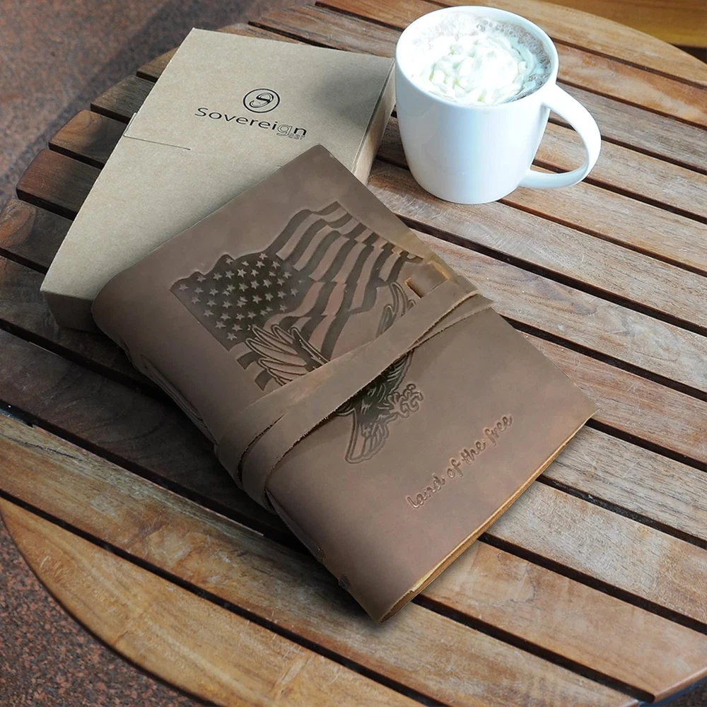 UNIQUE GIFT SET: Handmade leather journal with beautiful USA flag and Eagle embossed front soft cover with matching bookmark, designer pen and hidden pen holder. Presented in an eco-friendly recycled box. A timeless gift for that patriotic someone who loves to write. PREMIUM LEATHER: Crafted with delicate yet super tough buffalo leather, including a long strap that secures the journal firmly. Our genuine leather is thicker than competitors and offers lifetime durability with lasting softness. RUSTIC DESIGN: Achieves a unique and distressed look when scratched and features decorative stitching for added charm. Coated with special natural oils that make handling a joy. Plus, it has a wonderful authentic leather smell that inspires you to write daily. QUALITY CREAM PAPER: 300 premium unlined multipurpose sheets for notes, daily plans, sketches, inspiring ideas, memories and more. Zero bleed through with fountain pens. Not refillable. PERFECT SIZE: Designed with a choice of two sizes - 7x5" or 8x6" to suit a wide range of writing styles. We also offer many other sizes and styles of journals, including refillable journals. There's something for everyone! Product Description 100% Handmade Crafted with delicate yet super tough buffalo leather, including a long strap that secures the journal firmly. Our genuine leather is thicker than competitors and offers lifetime durability with lasting softness.