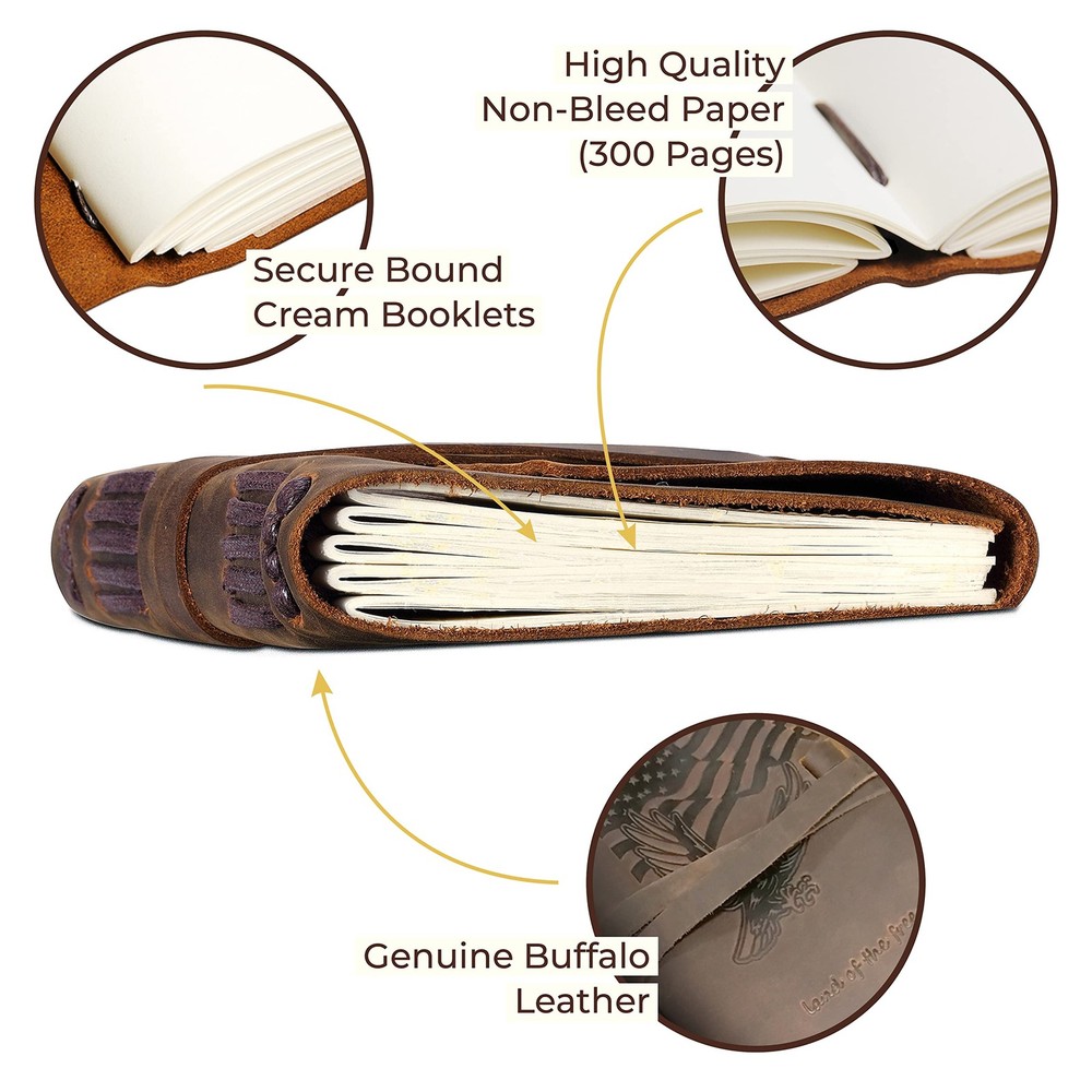 Sovereign Gear - Leather Journal with USA Flag and Eagle embossed is a vintage journal gift set made from brown crazy horse leather. A Leather Journal Gift Set Second to None This leather journal presentation set makes writing such a joy. When you open the eco-friendly box and see this antique leather travel notebook set, you'll be inspired to go on a world journey and write about your new adventures in faraway lands! This beautiful journal gift box makes a special keepsake and contains a unique handmade leather journal and a hidden pen-holder that holds the included pen, so you're ready to record your latest finds or thoughts. There's also a stylish bookmark to keep your place in your journal, novel or magazine. The lovely soft crazy horse leather is carefully sourced and checked by hand to ensure your leather-bound journal looks the best. In addition, it is coated with special natural oils, which give unique qualities, making handling this leather notebook a wonderful experience. Beautifully Handcrafted This luxurious antique leather notebook is 100% handcrafted with care every step to ensure it's a leather journal to treasure for men, women, students, journalists or travelers of all ages. Each handmade journal is truly unique, so no two are the same. The crazy horse leather cover ages beautifully: when scratched, the markings look uniquely distressed - wipe, and the marks fade. The more you use it, the more rustic it looks. Timeless Gift This leather journal, pen and bookmark set makes a special gift for any celebration. This lovely leather journal is not refillable - it offers a valuable, fun and collectible way to keep your ideas alive forever! Available in two sizes: 7" x 5" and 8" x 6". UNIQUE GIFT SET: Handmade leather journal with beautiful USA flag and Eagle embossed front soft cover with matching bookmark, designer pen and hidden pen holder. Presented in an eco-friendly recycled box. A timeless gift for that patriotic someone who loves to write. PREMIUM LEATHER: Crafted with delicate yet super tough buffalo leather, including a long strap that secures the journal firmly. Our genuine leather is thicker than competitors and offers lifetime durability with lasting softness. RUSTIC DESIGN: Achieves a unique and distressed look when scratched and features decorative stitching for added charm. Coated with special natural oils that make handling a joy. Plus, it has a wonderful authentic leather smell that inspires you to write daily. QUALITY CREAM PAPER: 300 premium unlined multipurpose sheets for notes, daily plans, sketches, inspiring ideas, memories and more. Zero bleed through with fountain pens. Not refillable. PERFECT SIZE: Designed with a choice of two sizes - 7x5" or 8x6" to suit a wide range of writing styles. We also offer many other sizes and styles of journals, including refillable journals. There's something for everyone!