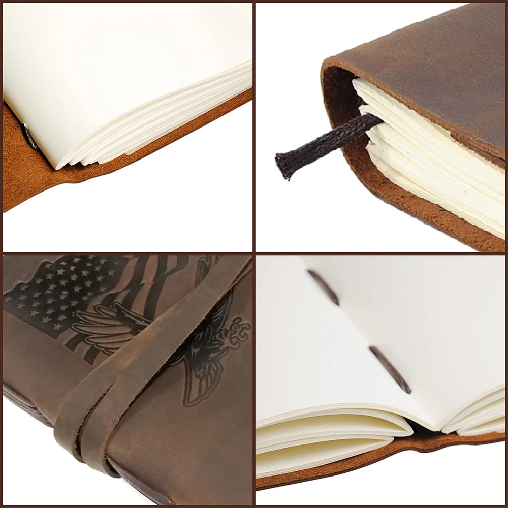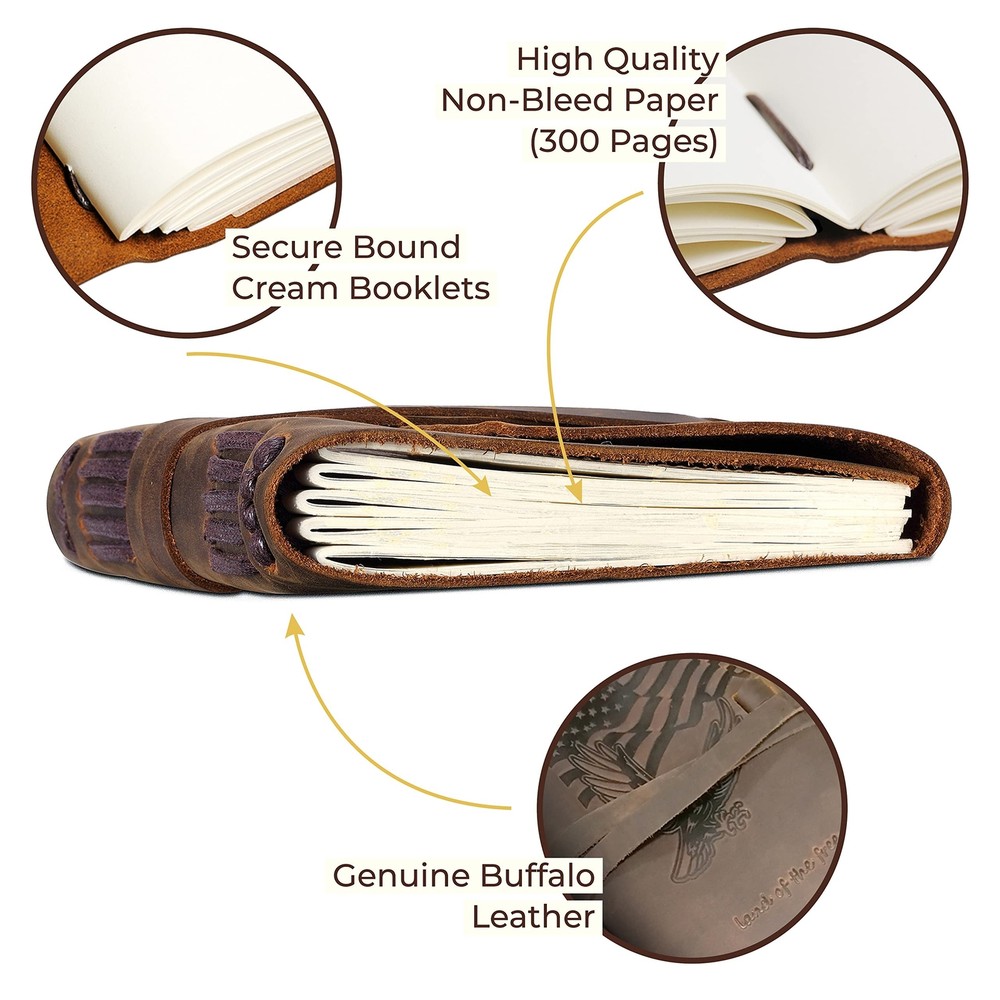 Leather Bound Journal for Men and Women, Handmade Patriotic Gift Set with USA Flag and Eagle Embossed Journal and Stylish Pen, Vintage Notebook, Sketchbook, Planner and Diary A5 (300 Pages) (7x5") Description Features: UNIQUE GIFT SET: Handmade leather journal with beautiful USA flag and Eagle embossed front soft cover with matching bookmark, designer pen and hidden pen holder. Presented in an eco-friendly recycled box. A timeless gift for that patriotic someone who loves to write. PREMIUM LEATHER: Crafted with delicate yet super tough buffalo leather, including a long strap that secures the journal firmly. Our genuine leather is thicker than competitors and offers lifetime durability with lasting softness. RUSTIC DESIGN: Achieves a unique and distressed look when scratched and features decorative stitching for added charm. Coated with special natural oils that make handling a joy. Plus, it has a wonderful authentic leather smell that inspires you to write daily. QUALITY CREAM PAPER: 300 premium unlined multipurpose sheets for notes, daily plans, sketches, inspiring ideas, memories and more. Zero bleed through with fountain pens. Not refillable. PERFECT SIZE: Designed with a choice of two sizes - 7x5" or 8x6" to suit a wide range of writing styles. We also offer many other sizes and styles of journals, including refillable journals. There's something for everyone! Product Details: Brand: Sovereign-Gear Color: Brown Theme: Book Sheet Size: A5 Pages: 300 Cover Material: Leather Style: USA Flag Ruling Type: Plain Special Feature: Soft cover Number of Items: 1 Manufacturer: Sovereign-Gear Brand: Sovereign-Gear Item Weight: 1.18 pounds Product Dimensions: 6.69 x 1.97 x 8.46 inches Color: Brown Cover Material: Leather Material Type: Leather Number of Items: 1 Size: 7" x 5" Ruling: Plain Sheet Size: A5 Manufacturer Part Number: SG-US_Flag-Journal-8x6 Date First Available: December 19, 2021 Handling We will ship all orders within 3 business day of payment. Delivery We Do Not Ship Outside of the Continental US. Return Policy All items qualify for returns within 30 days of receipt. Buyer is responsible for return shipping on any item that is not damaged. Feedback We take our reputation seriously, we buy and sell online, so we understand the value of trust. If you are unsatisfied with your order, please contact us and we will work with you to resolve it to your satisfaction.