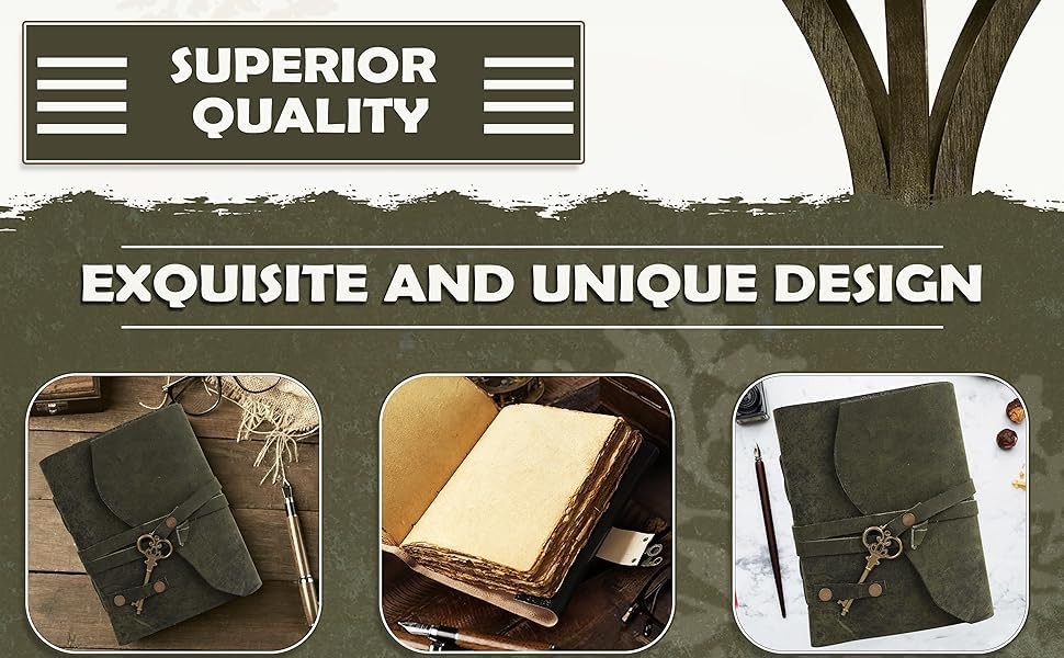 This handmade leather journal is absolutely stunning—the vintage deckle-edged paper feels luxurious and holds ink beautifully, perfect for writing, sketching, or light watercolor. The craftsmanship is incredible, from the soft cotton rag pages to the sturdy stitching and elegant green cover. The built-in key adds a charming nostalgic touch. It’s more than a notebook; it’s a keepsake you’ll treasure for years. Ideal for travelers and creatives who appreciate fine details and artistry. Highly recommend!