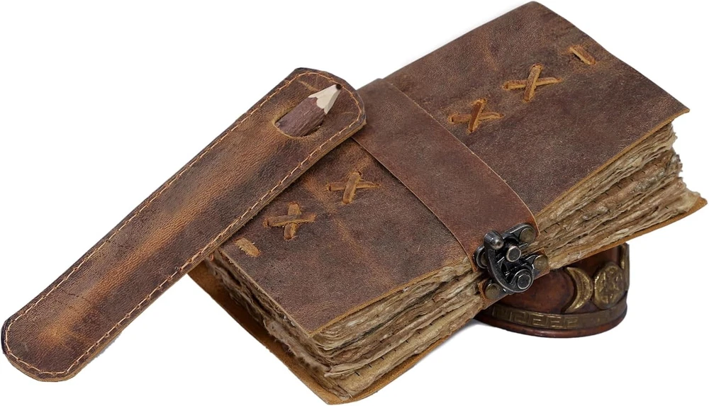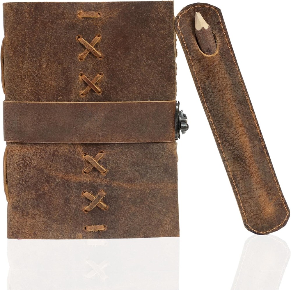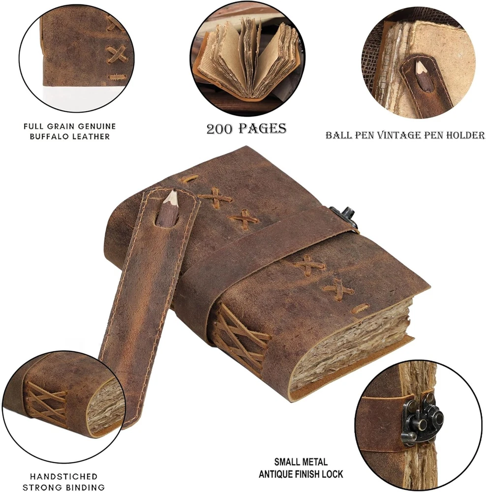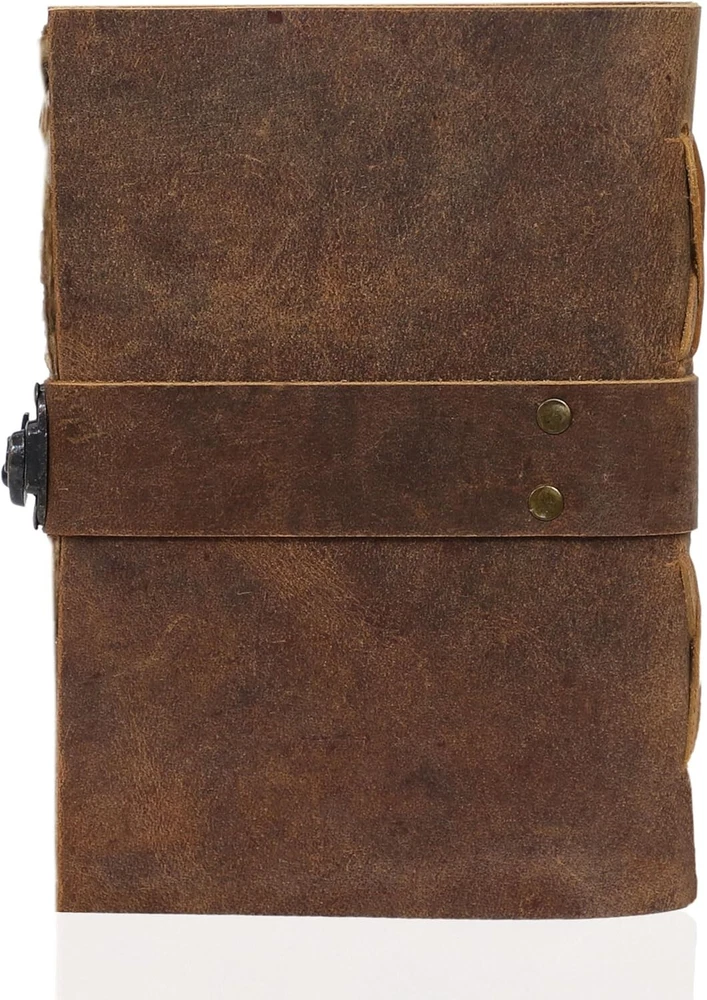 VINTAGE LEATHER JOURNAL: A Perfect Journal for Women and Men. This Vintage Journal is Made from Genuine Buffalo Leather which is naturally tanned with oils and is chrome free. As these Daily Journals are made with genuine Cruelty free leather so each vary in look and shade producing a unique item. JOURNAL NOTEBOOKS WITH STURDY BINDING: Belt Wrap around closure with Antique Bras lock to keep the papers of the journal safe when not being used. A sturdy hand stitched binding to make sure that no paper comes out loose. PERFECT GIFT: This vintage-inspired journal serves as an exquisite and timeless gift suitable for a diverse range of recipients, including women, men, teen girls, boys, and cherished grandparents. A lovely treat for your loved ones for an anniversary, birthday or graduation present, or for someone starting a new adventure